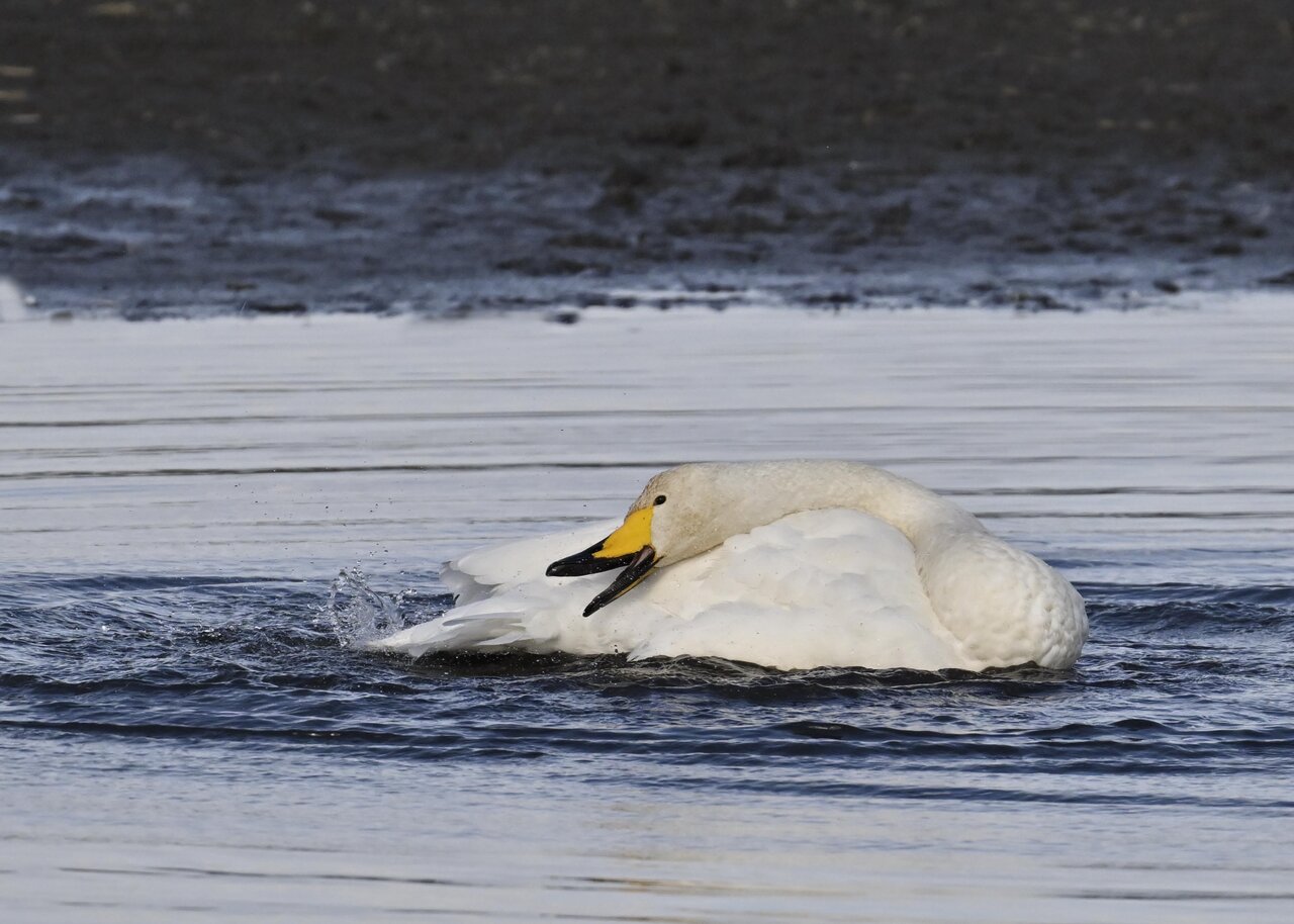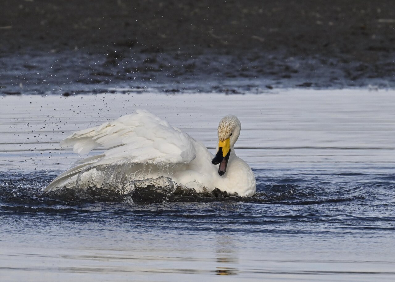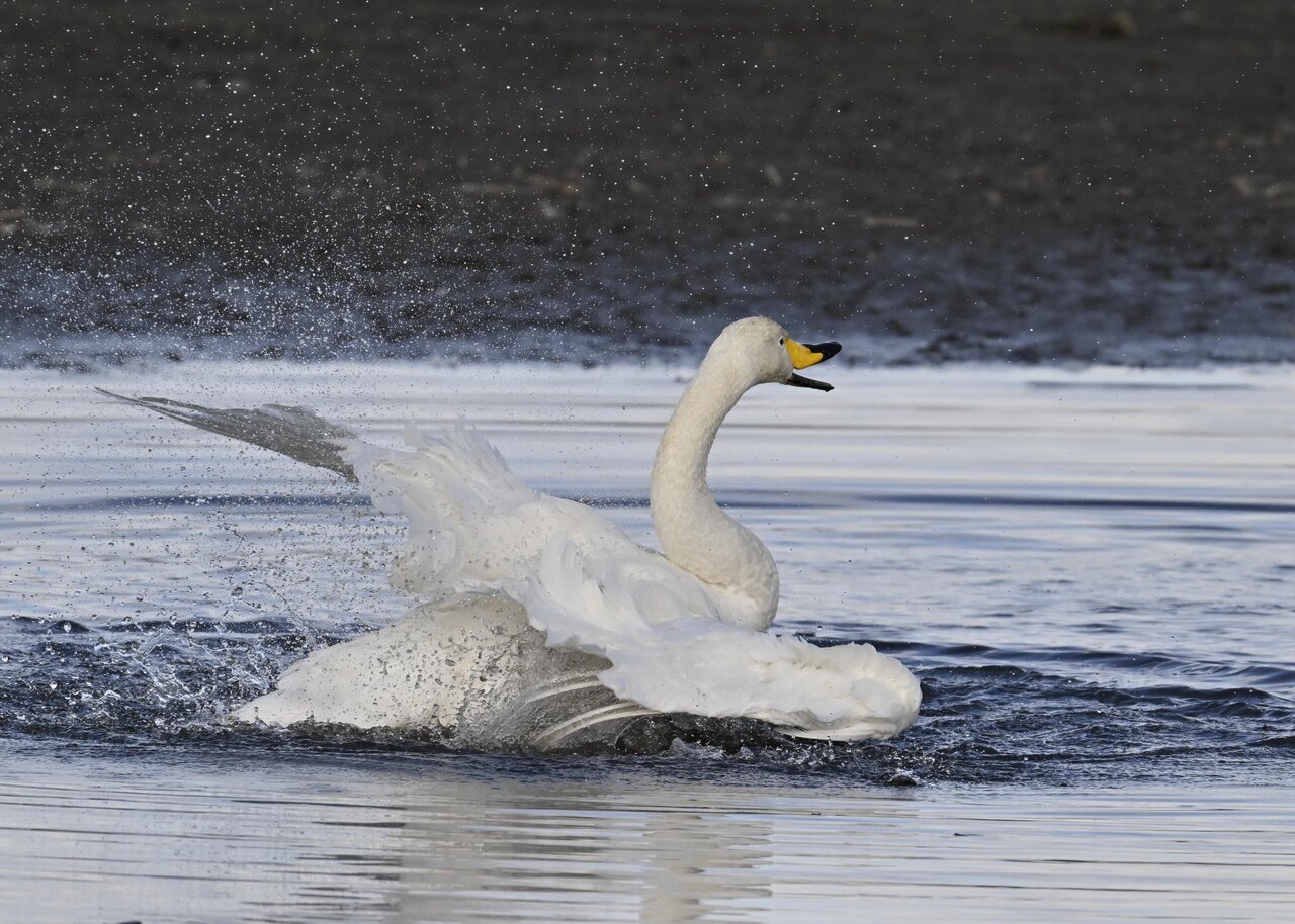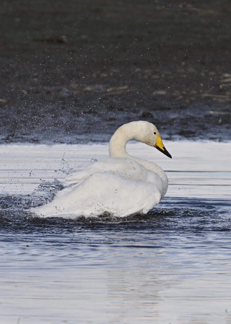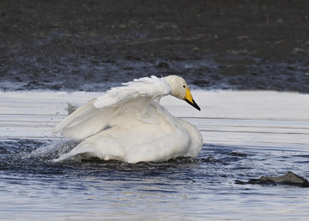再三の登場ですが、きょうもオオハクチョウです。水浴びをしていました。