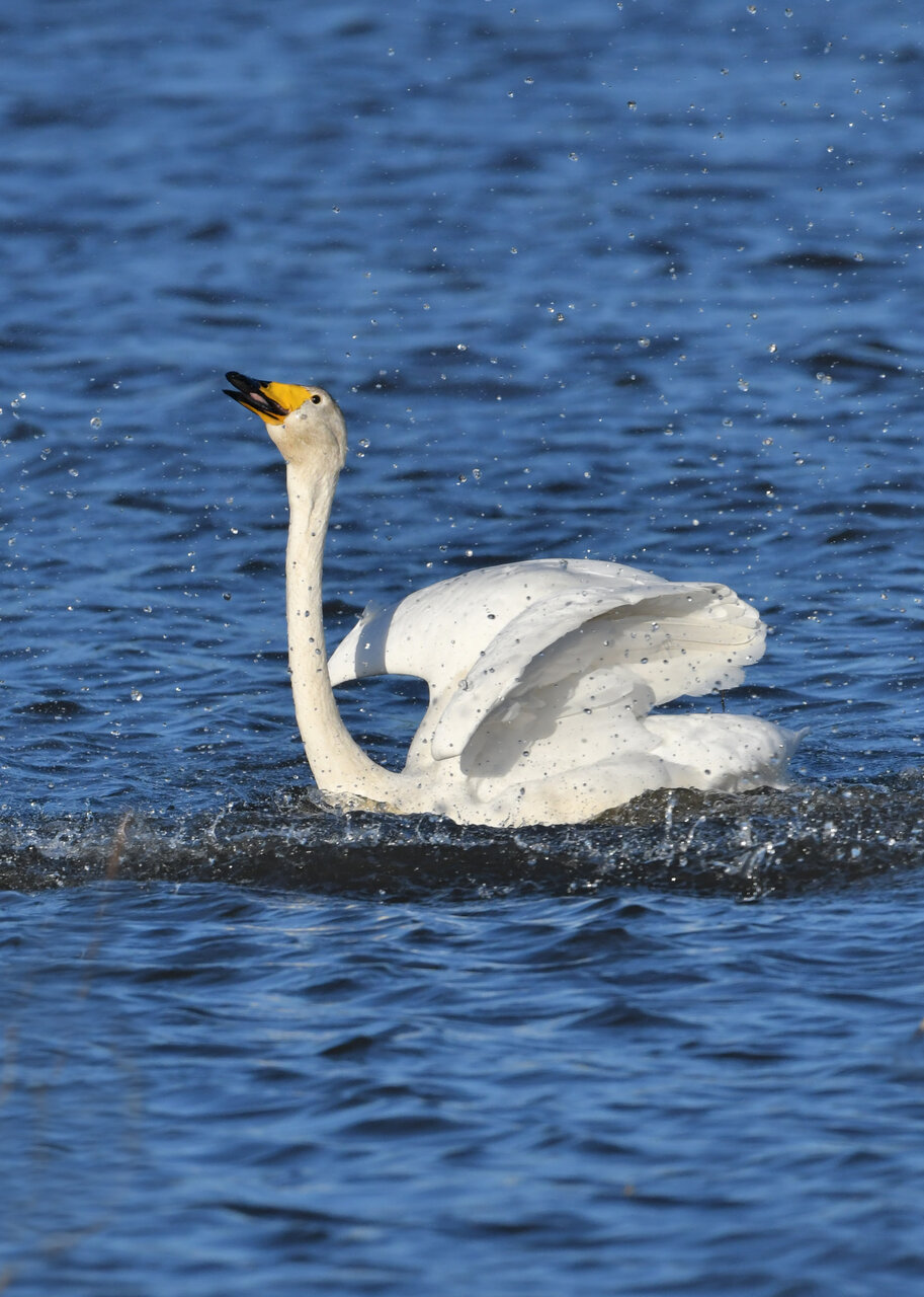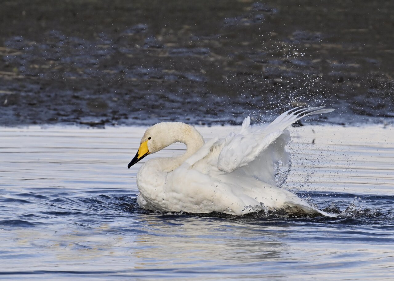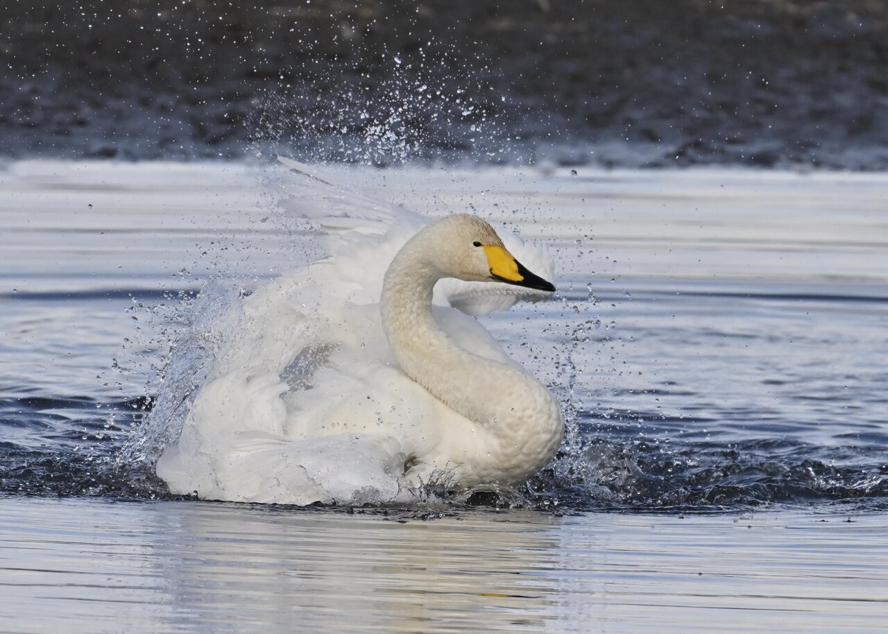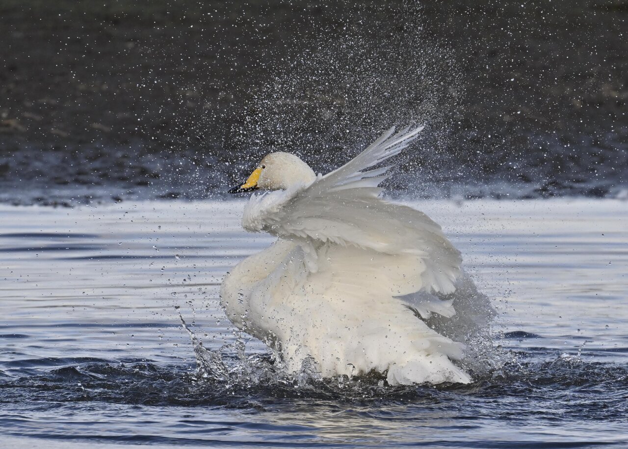 再三の登場ですが、きょうもオオハクチョウです。水浴びをしていました。