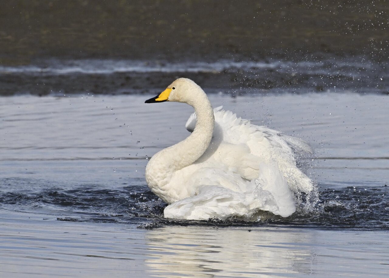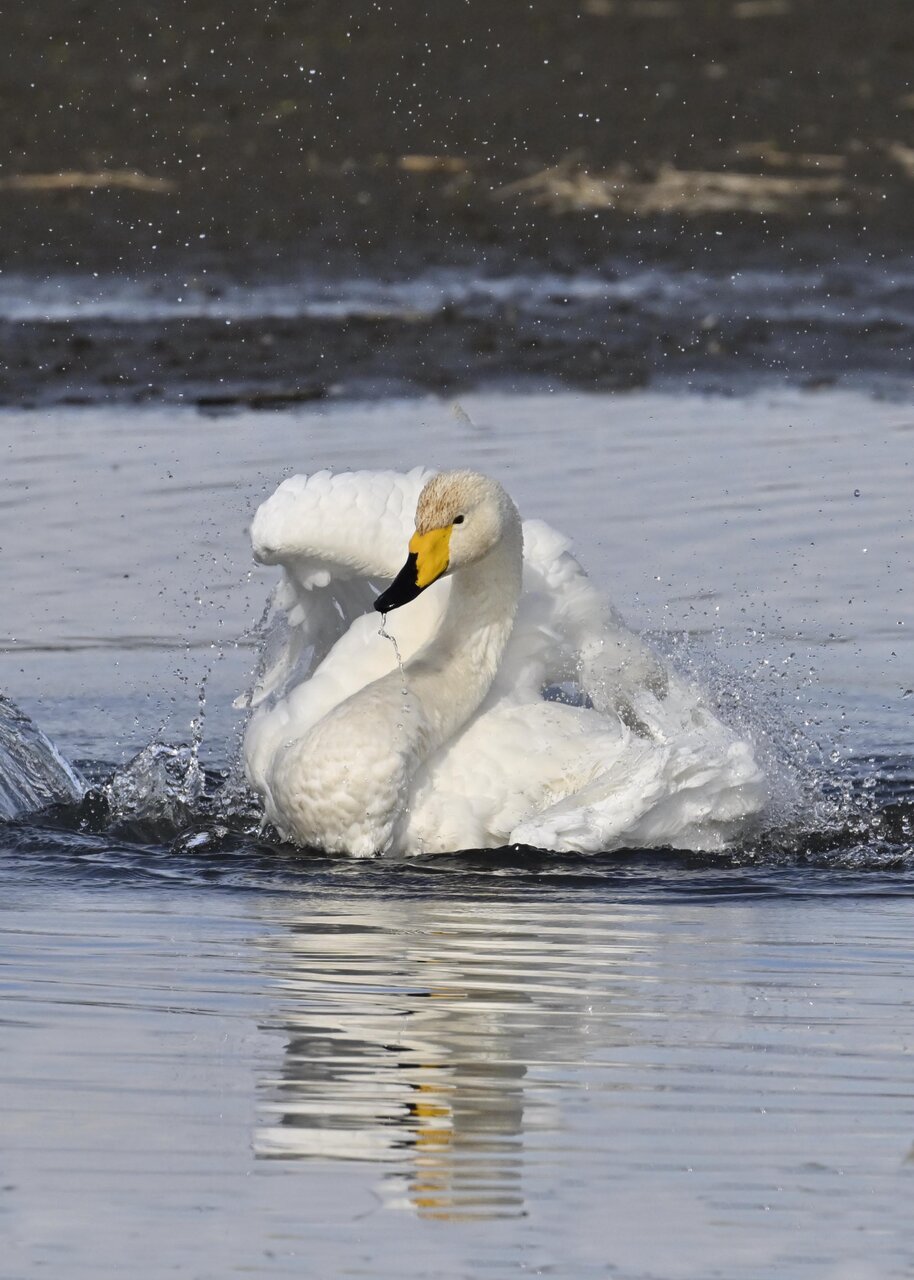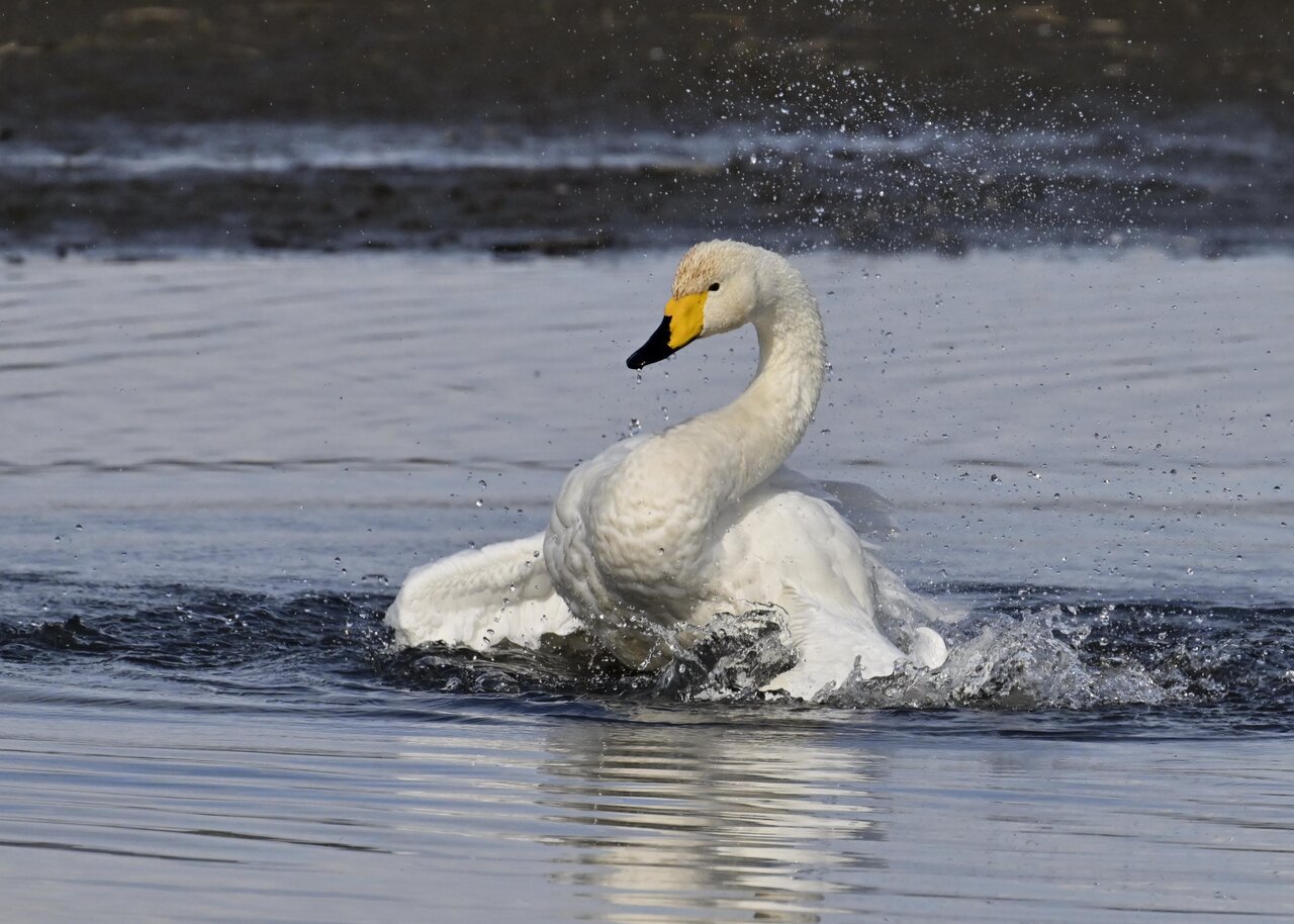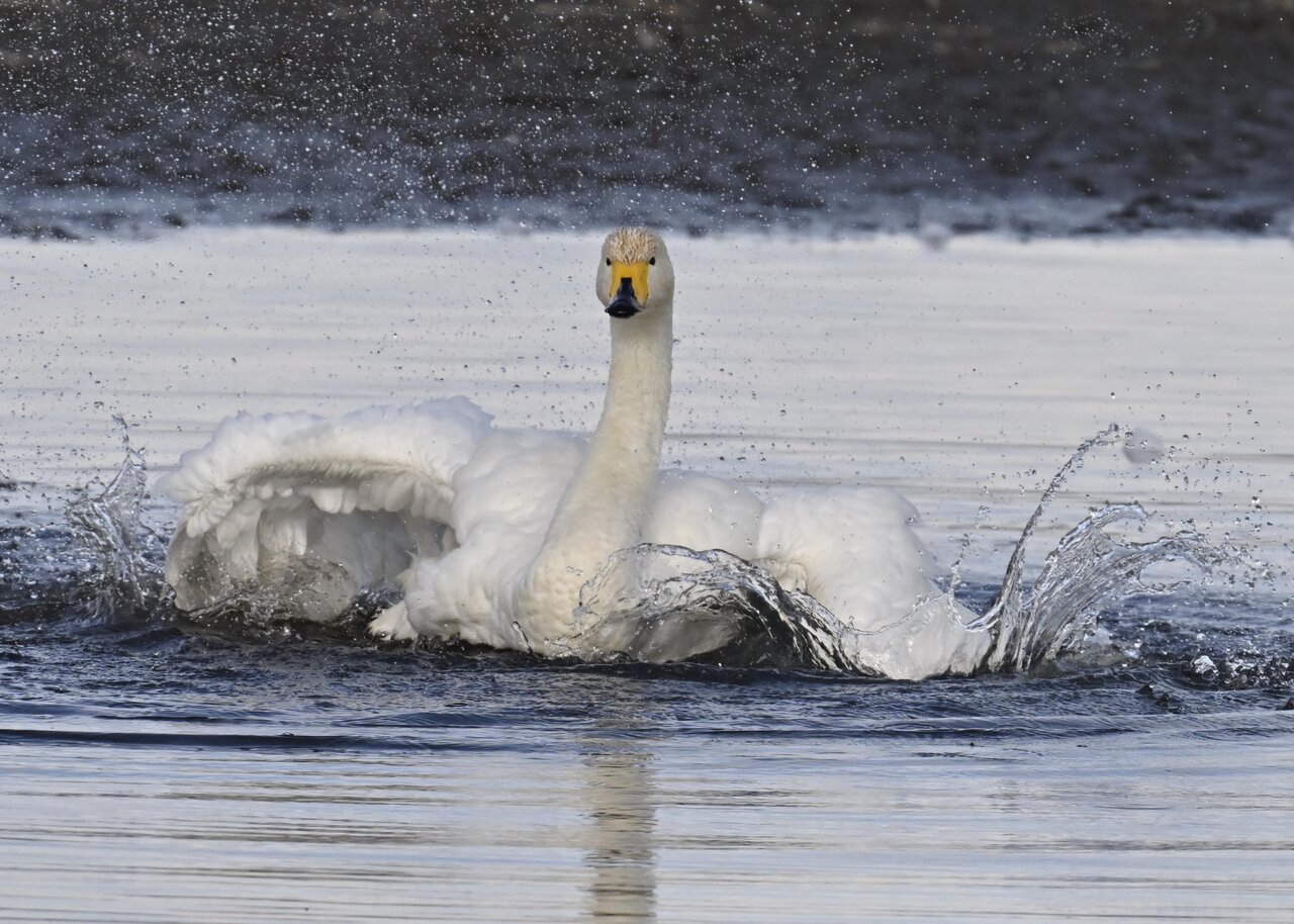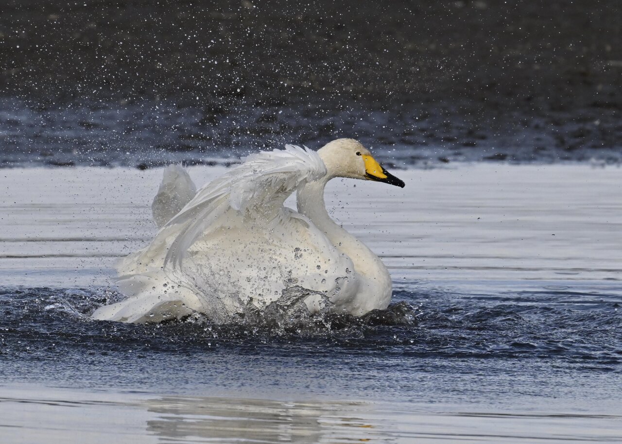 再三の登場ですが、きょうもオオハクチョウです。水浴びをしていました。