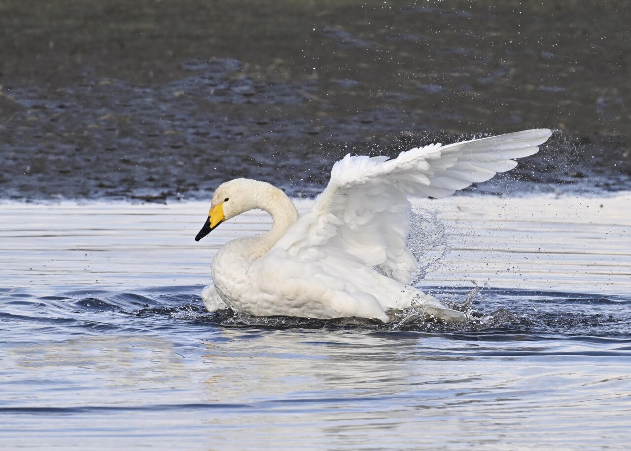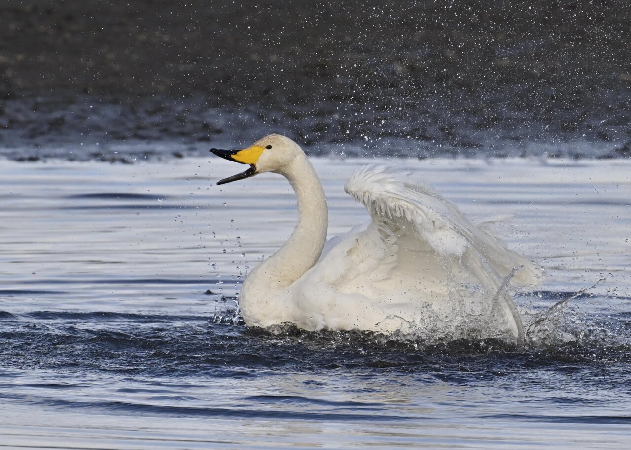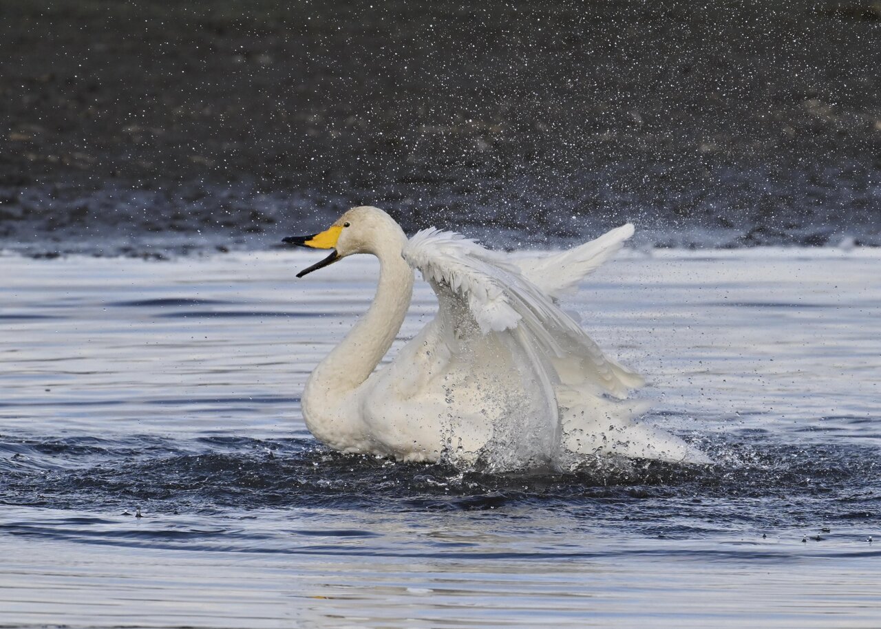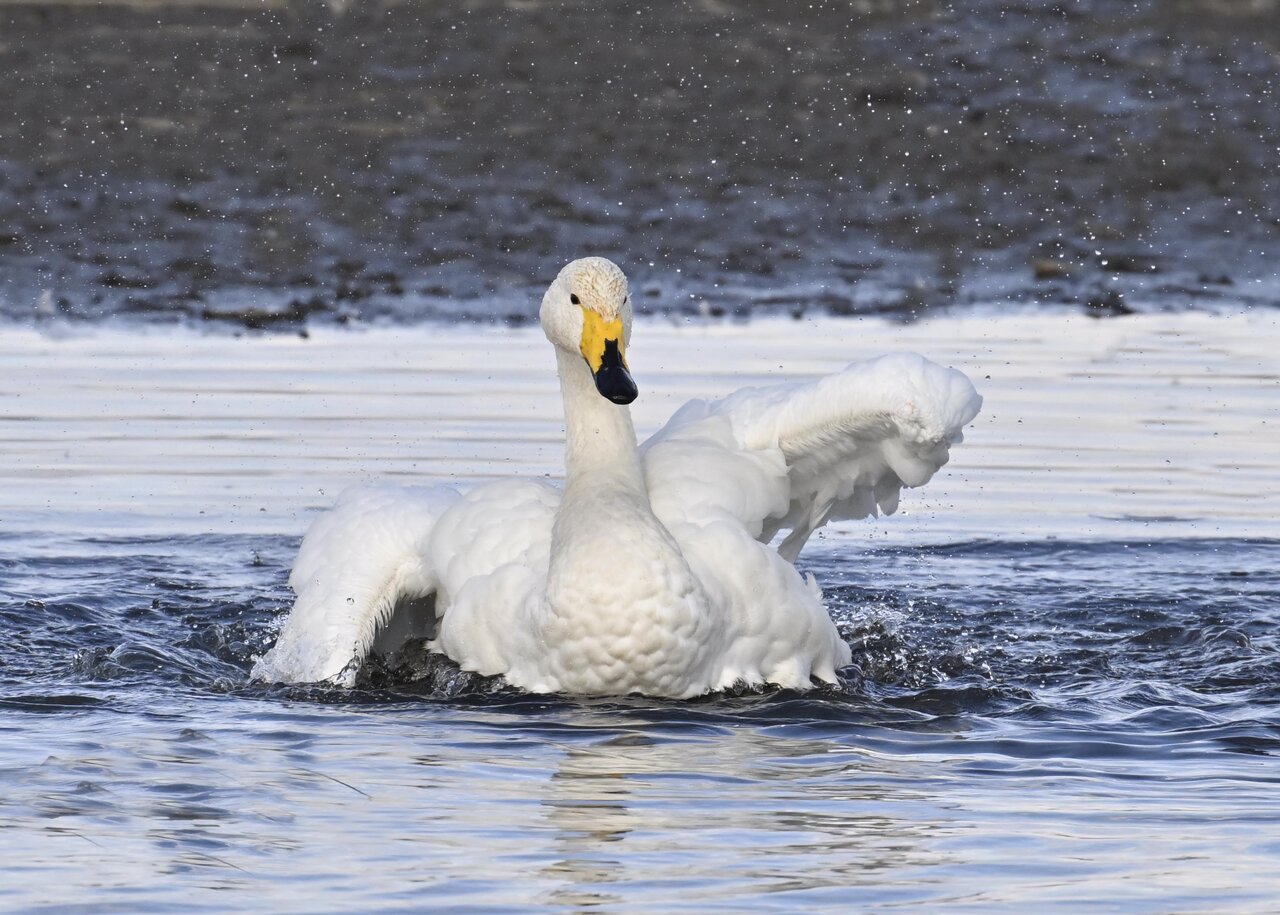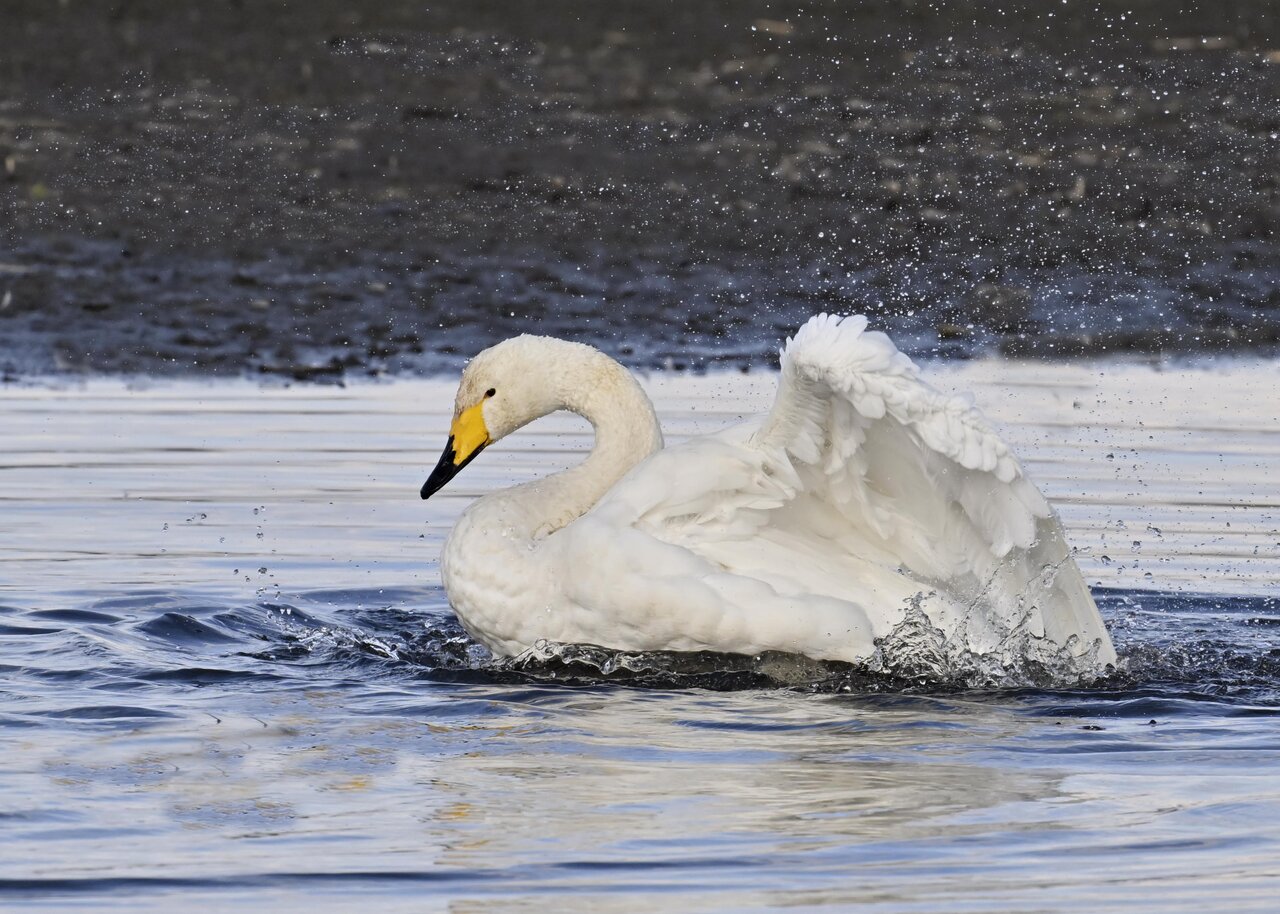 再三の登場ですが、きょうもオオハクチョウです。水浴びをしていました。