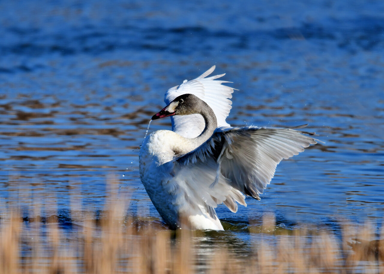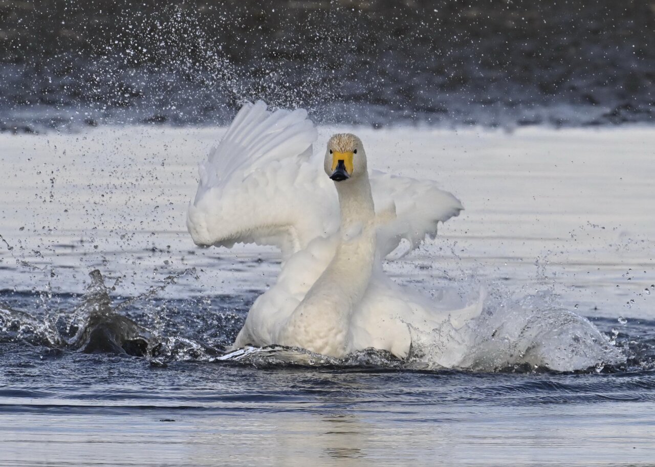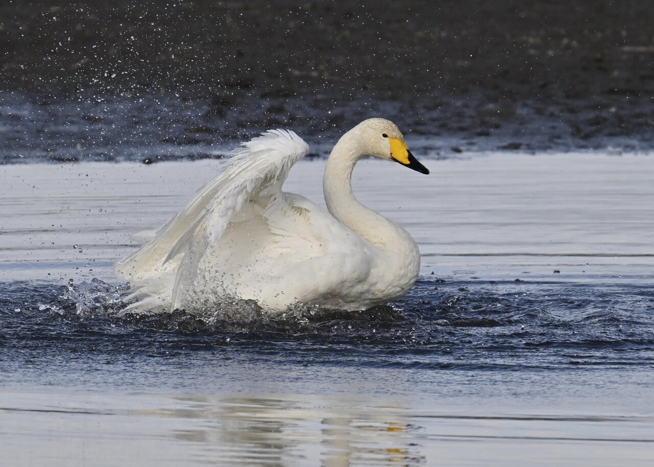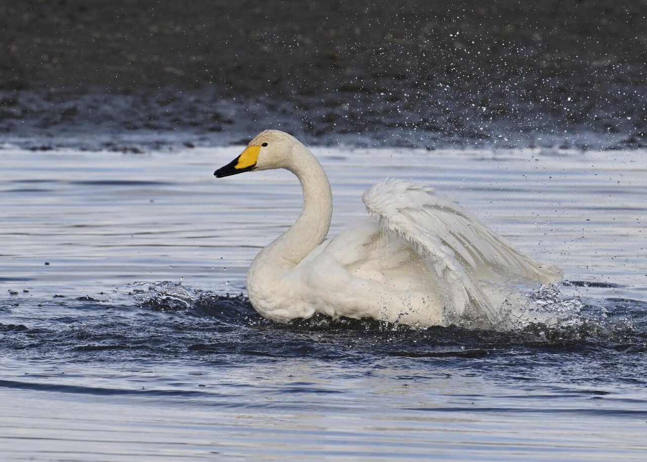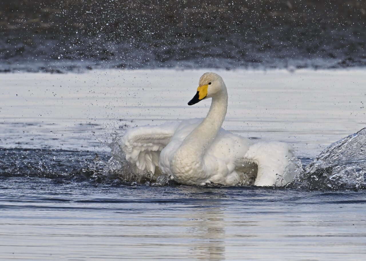 再三の登場ですが、きょうもオオハクチョウです。水浴びをしていました。
