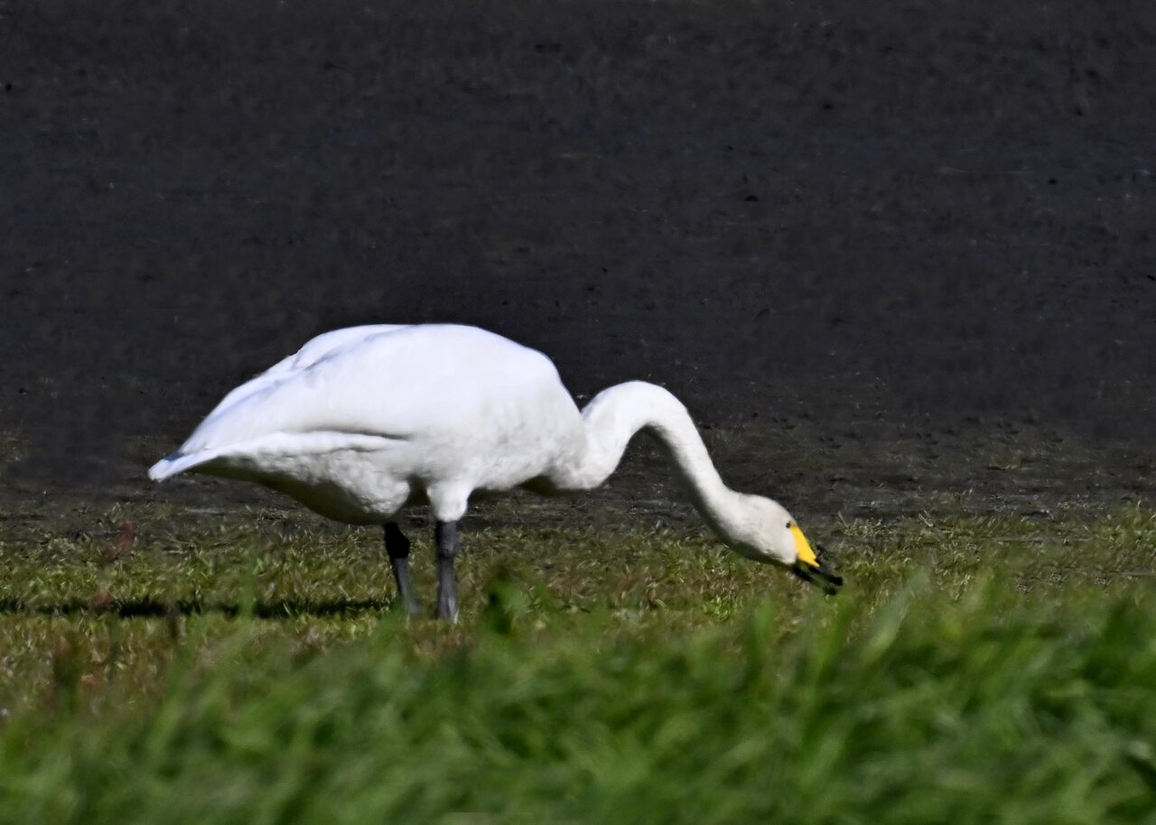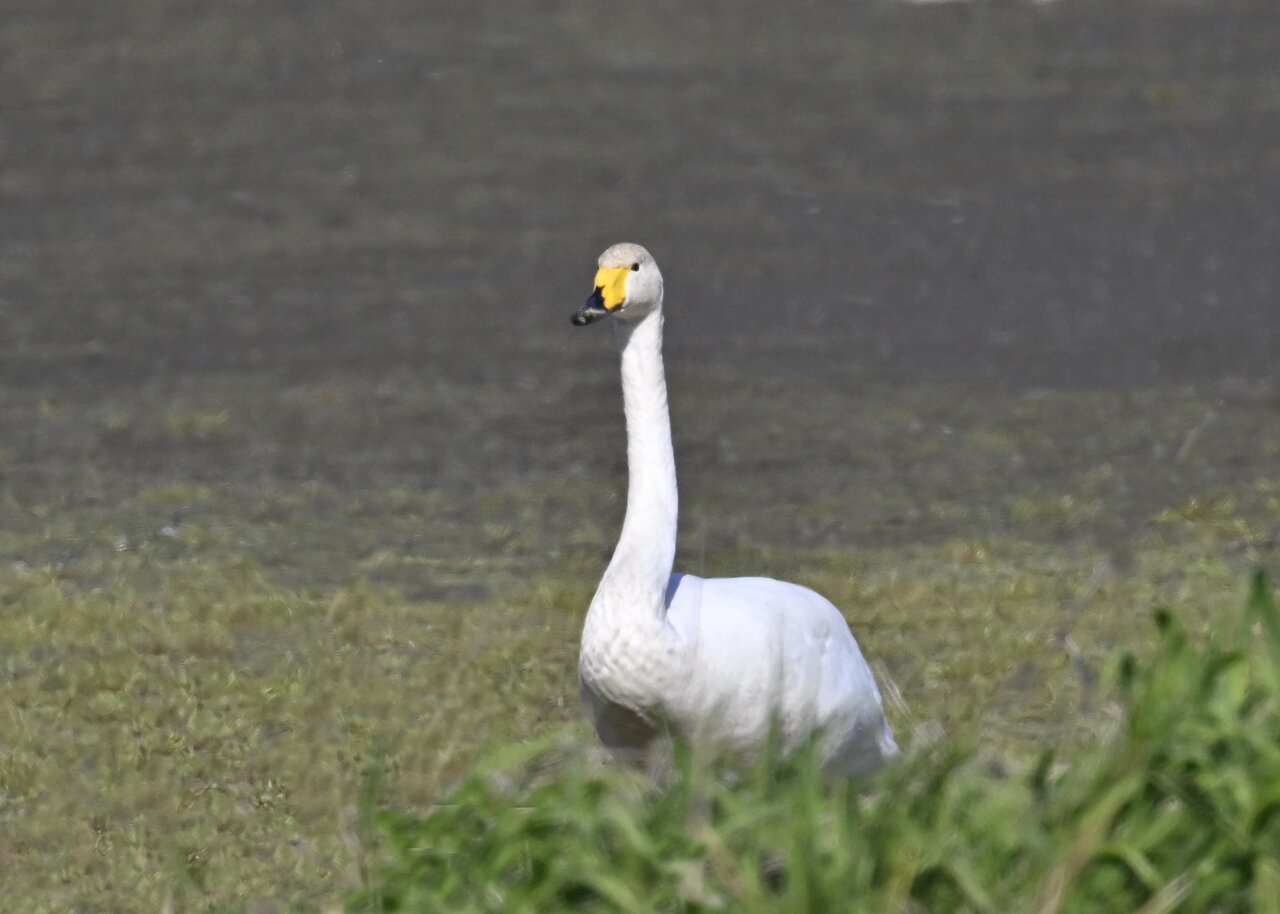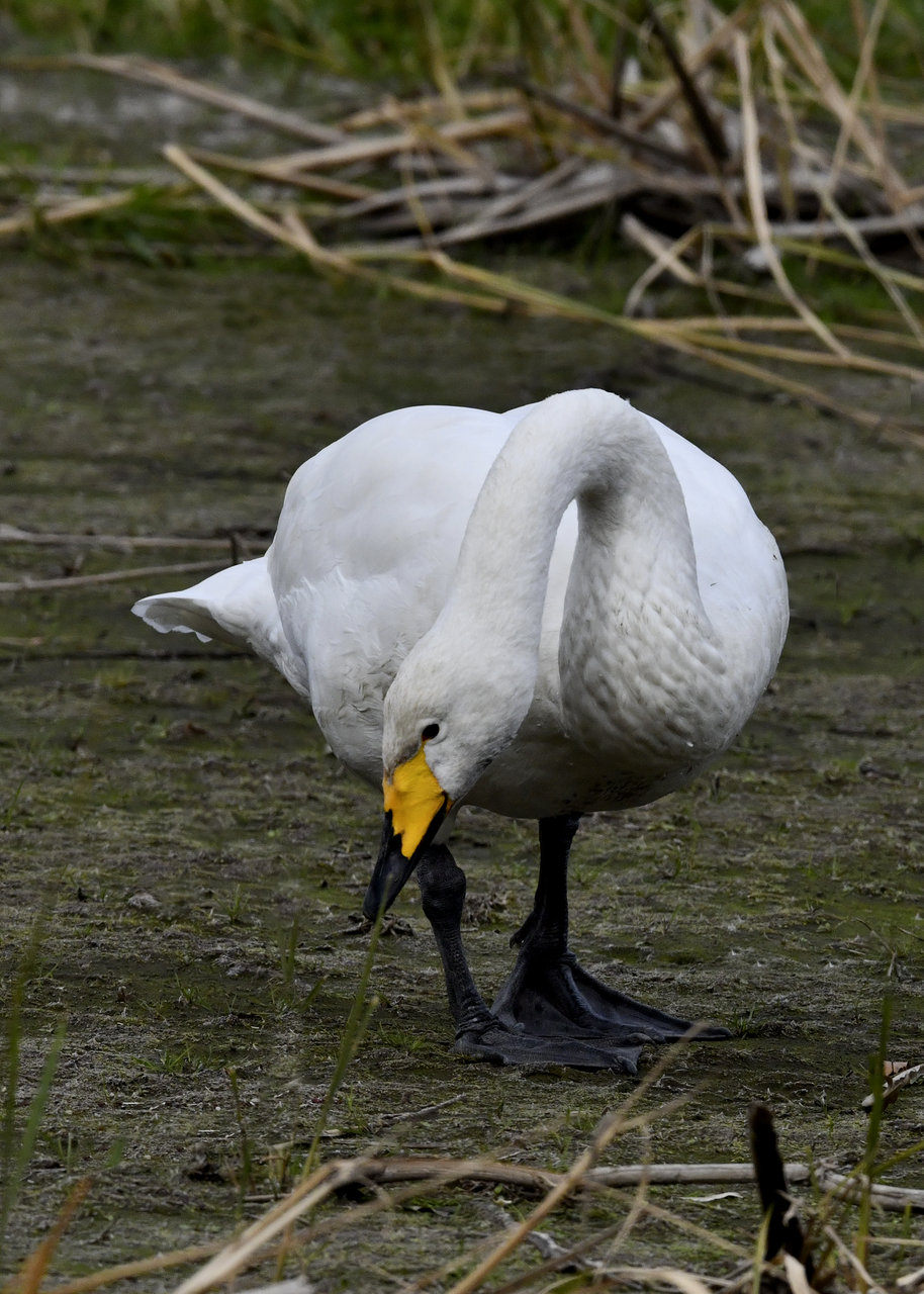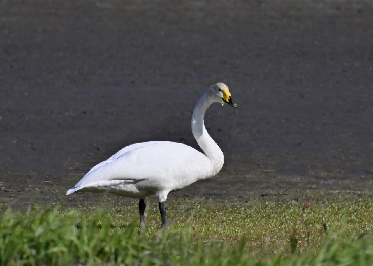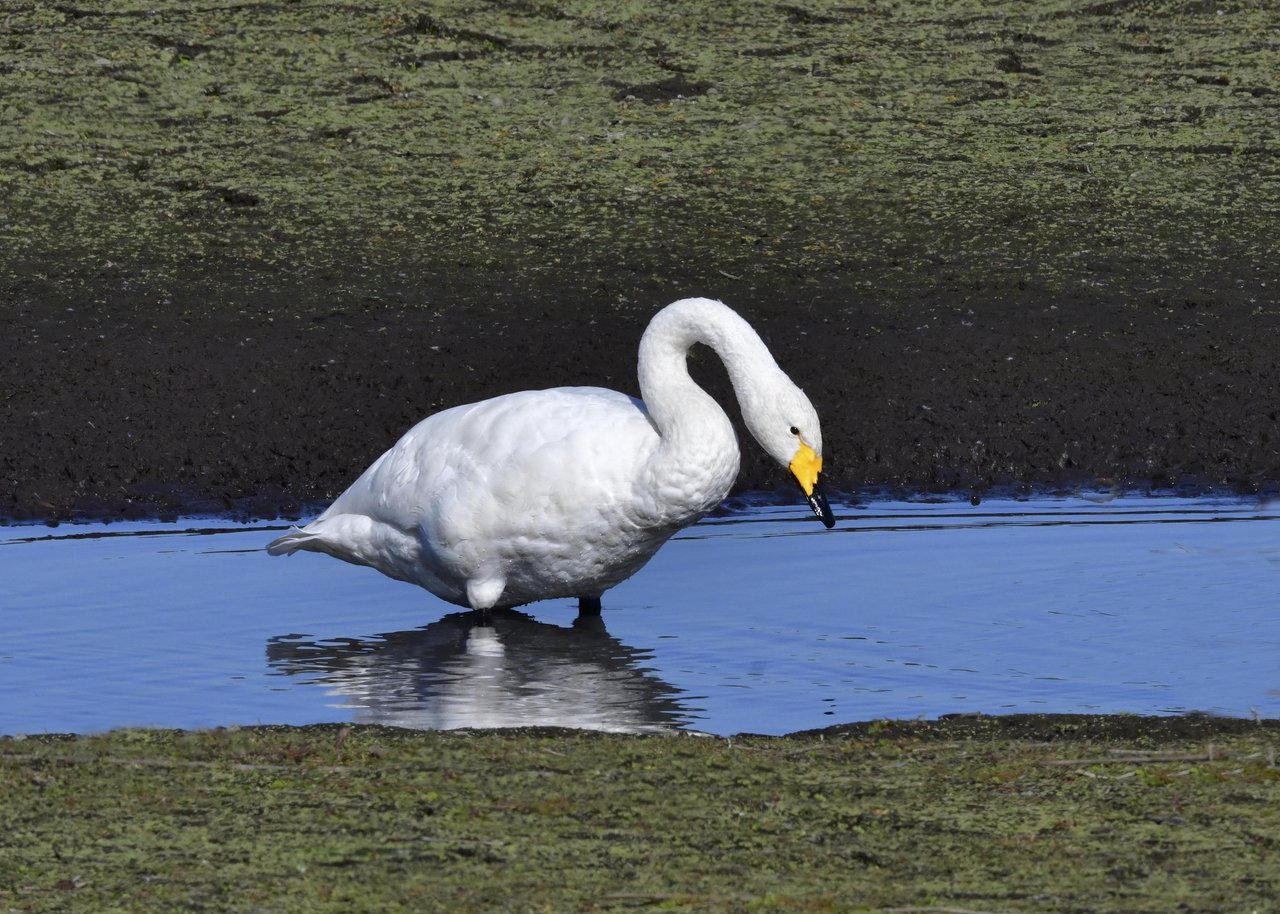 この日は、10羽程のオオハクチョウが渡来していましたが、1羽を除き泥の中での餌捕りで頭が泥塗れでした。