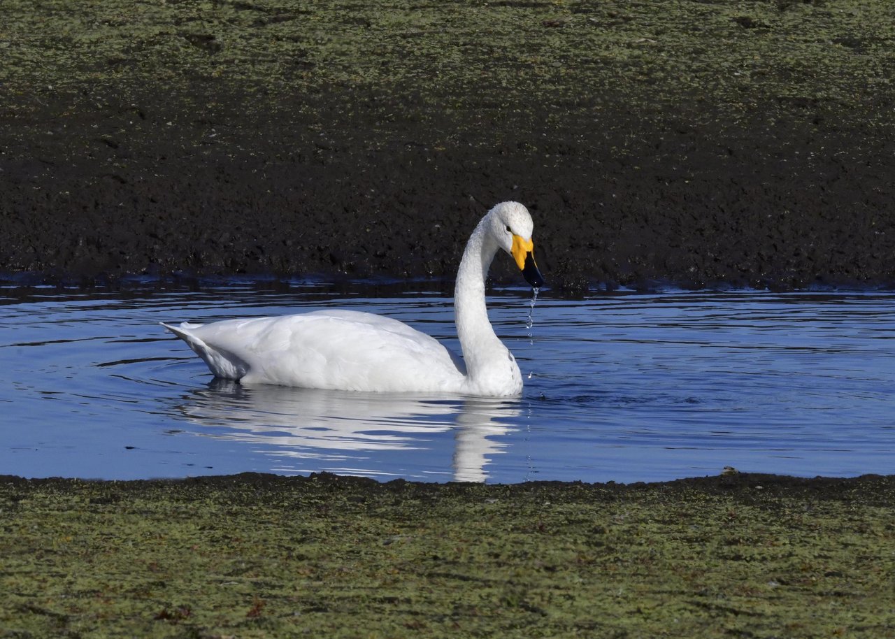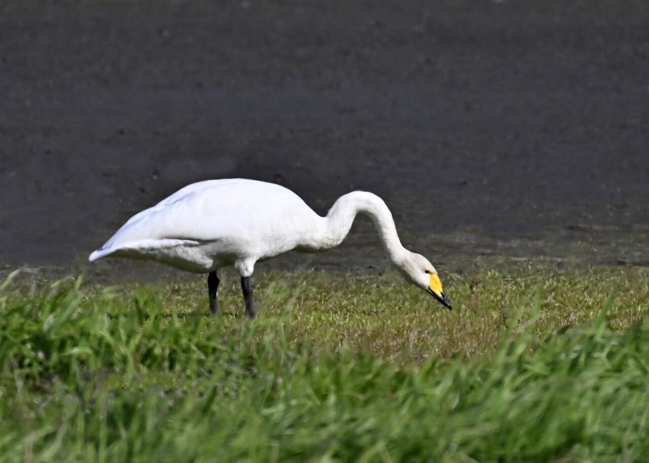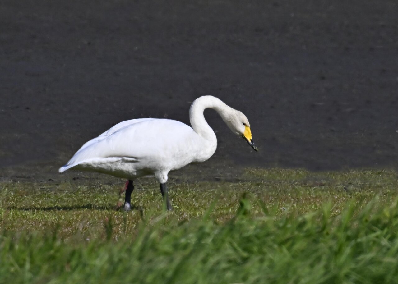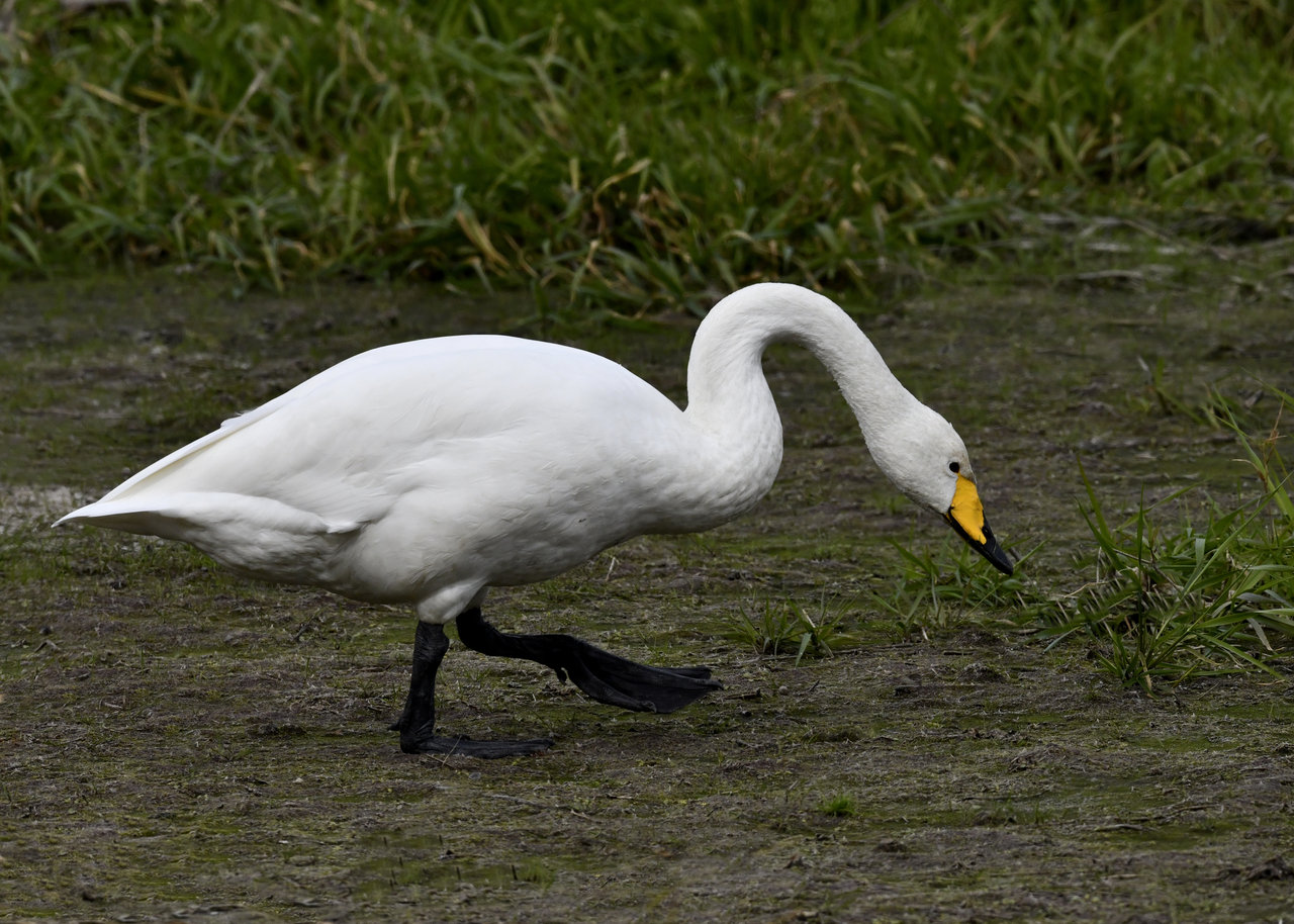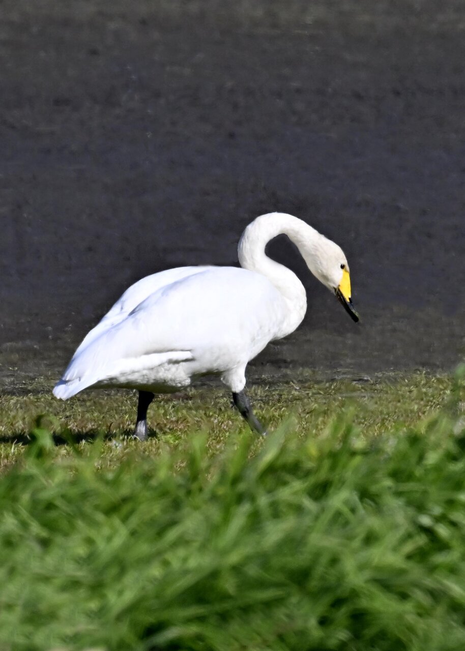 この日は、10羽程のオオハクチョウが渡来していましたが、1羽を除き泥の中での餌捕りで頭が泥塗れでした。
