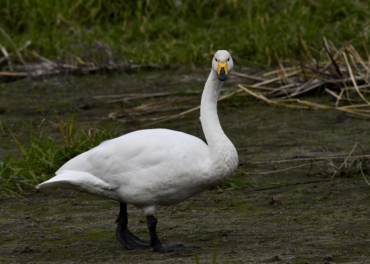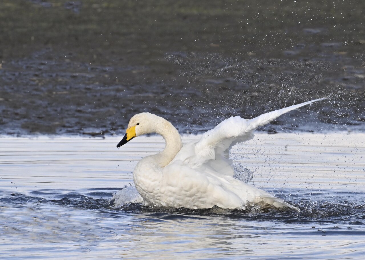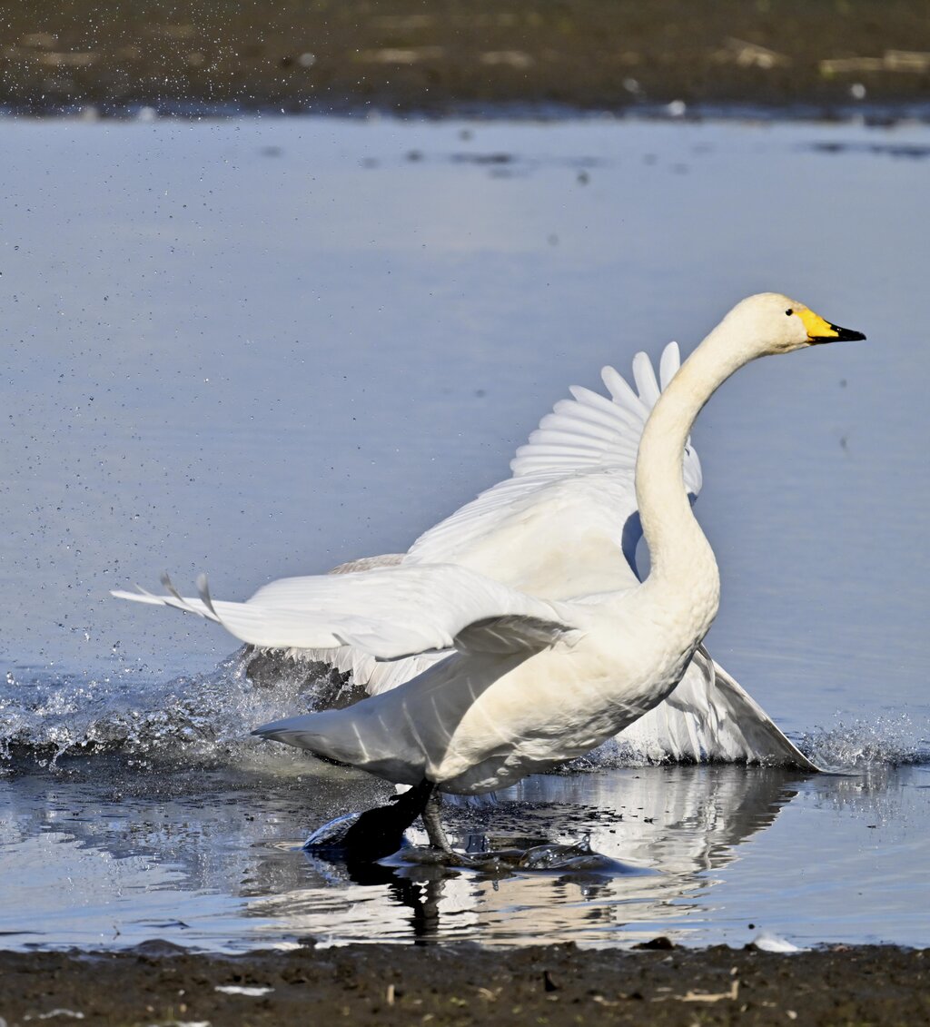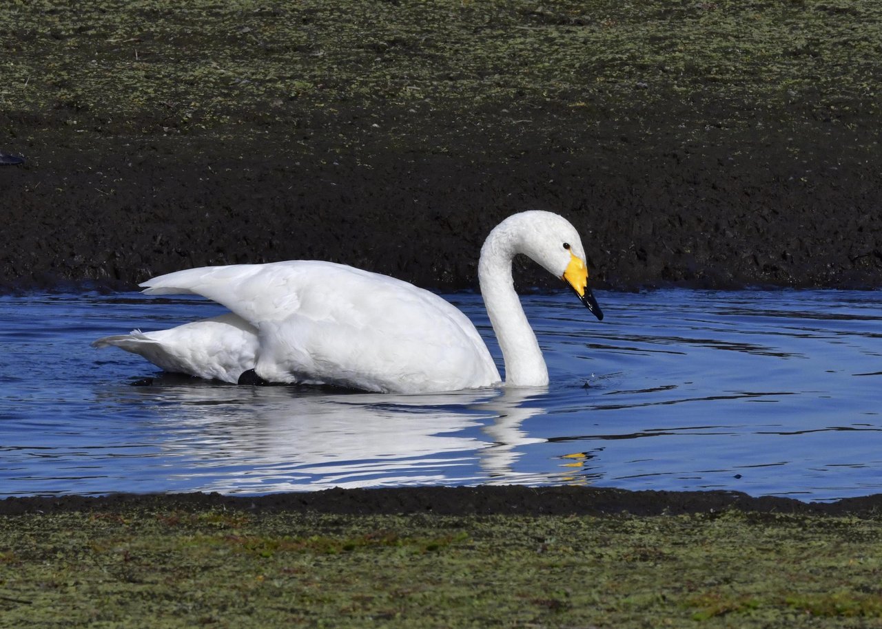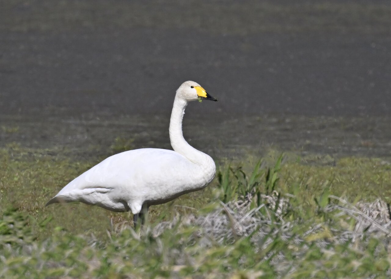 この日は、10羽程のオオハクチョウが渡来していましたが、1羽を除き泥の中での餌捕りで頭が泥塗れでした。