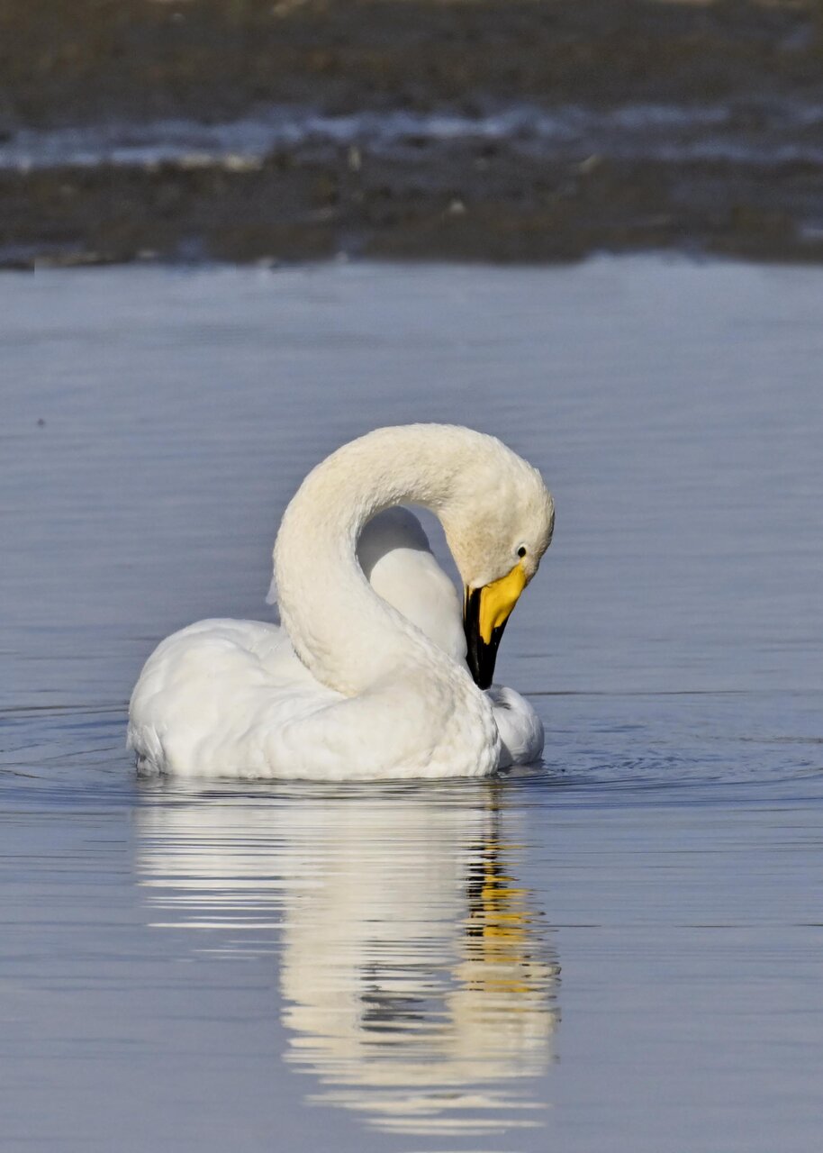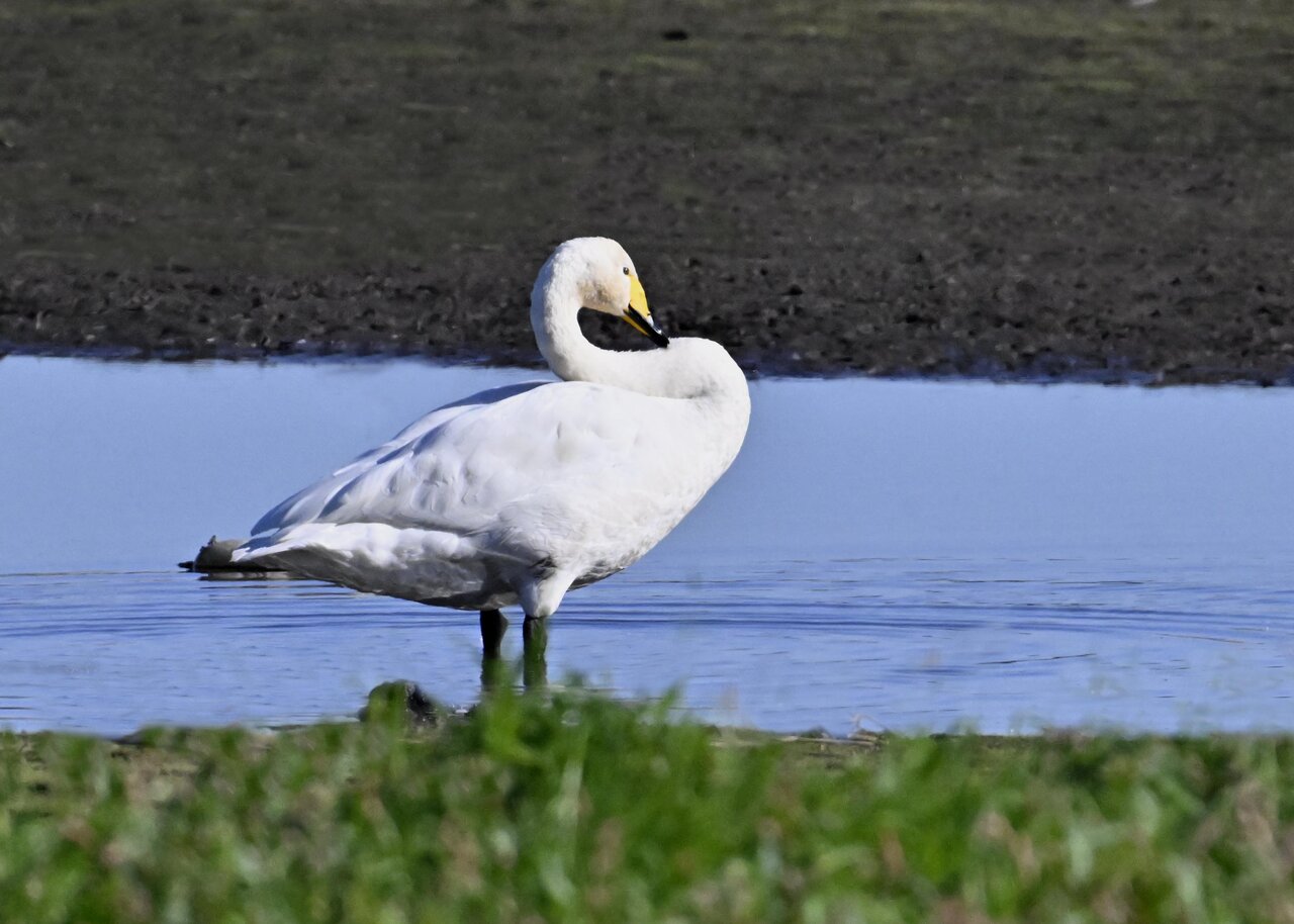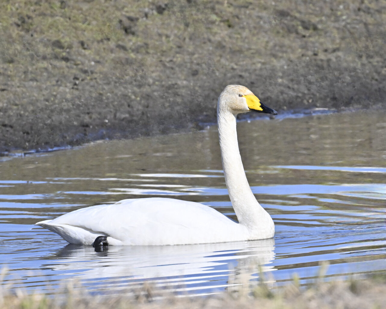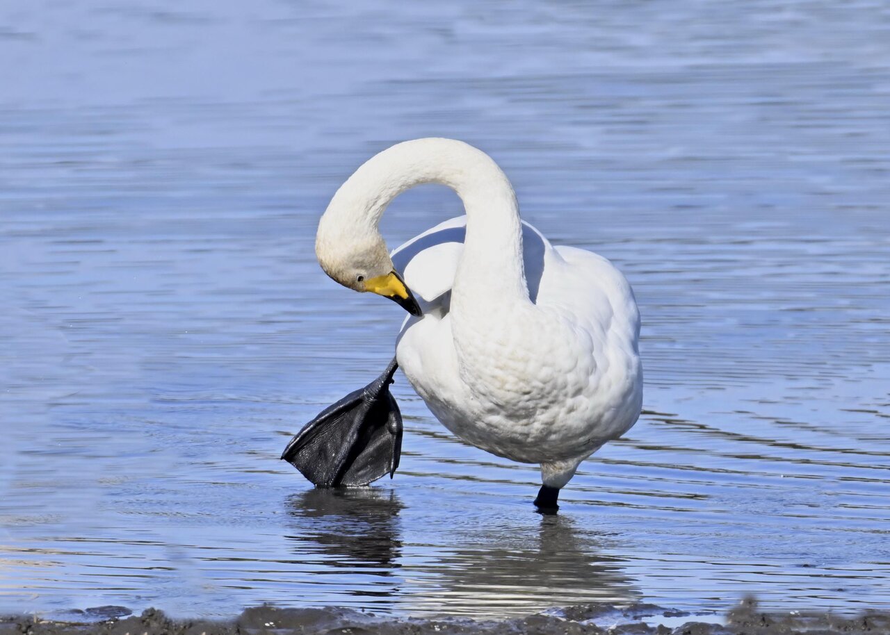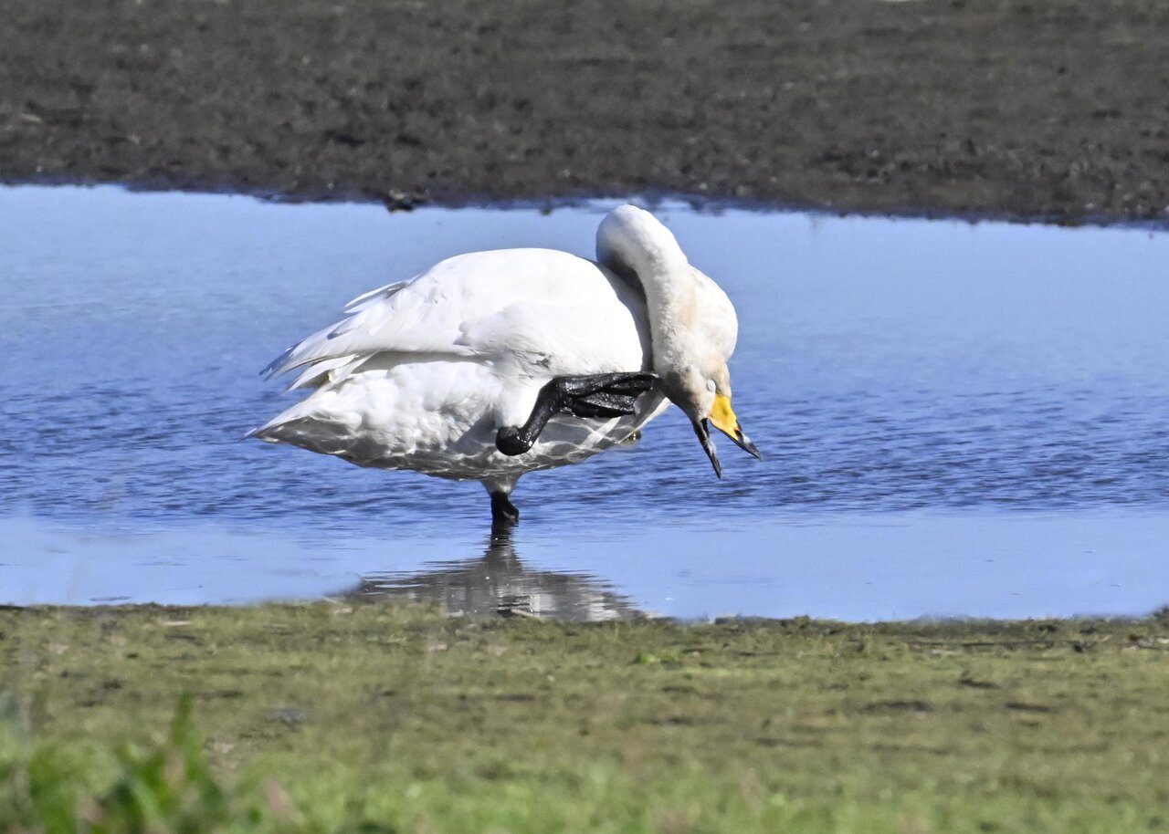 この日は、10羽程のオオハクチョウが渡来していましたが、1羽を除き泥の中での餌捕りで頭が泥塗れでした。