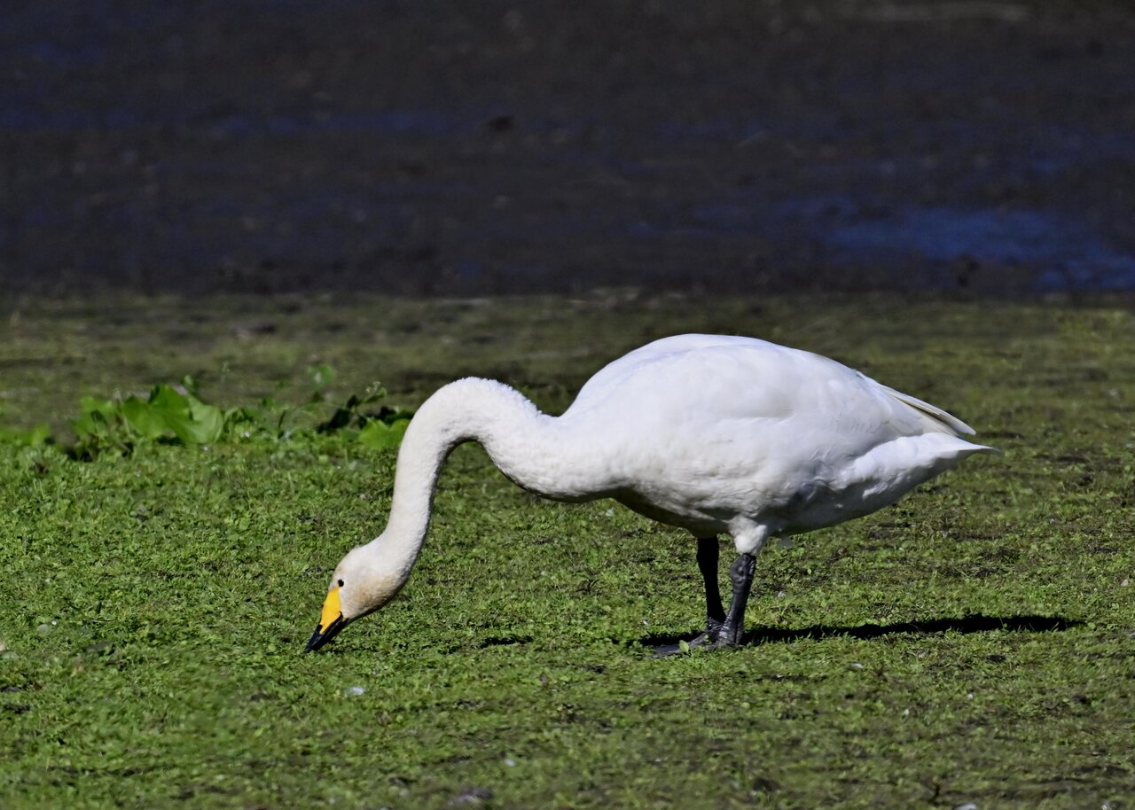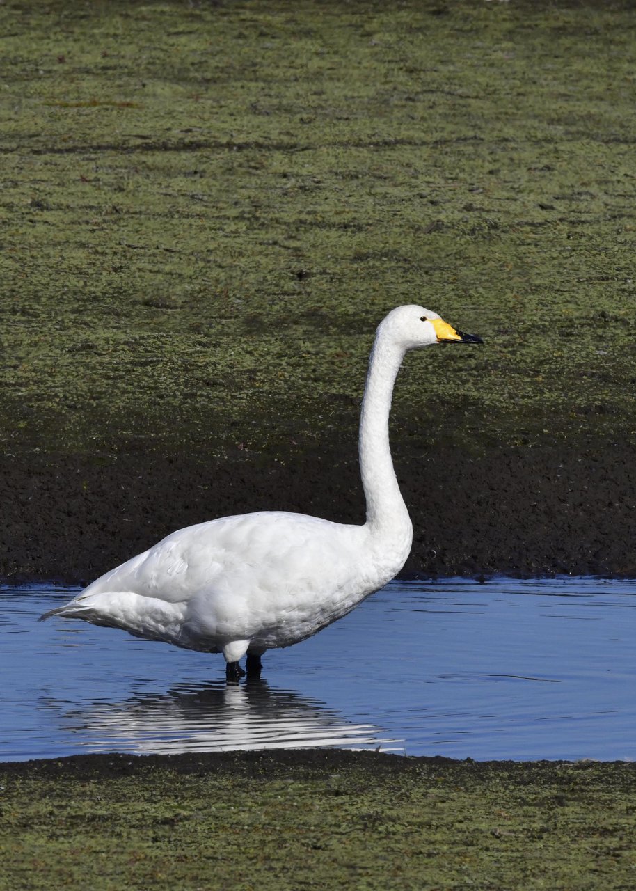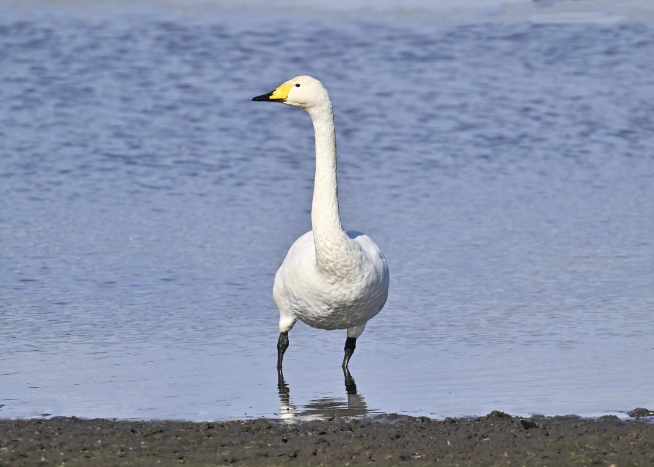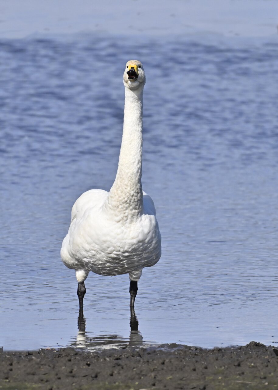 この日は、10羽程のオオハクチョウが渡来していましたが、1羽を除き泥の中での餌捕りで頭が泥塗れでした。