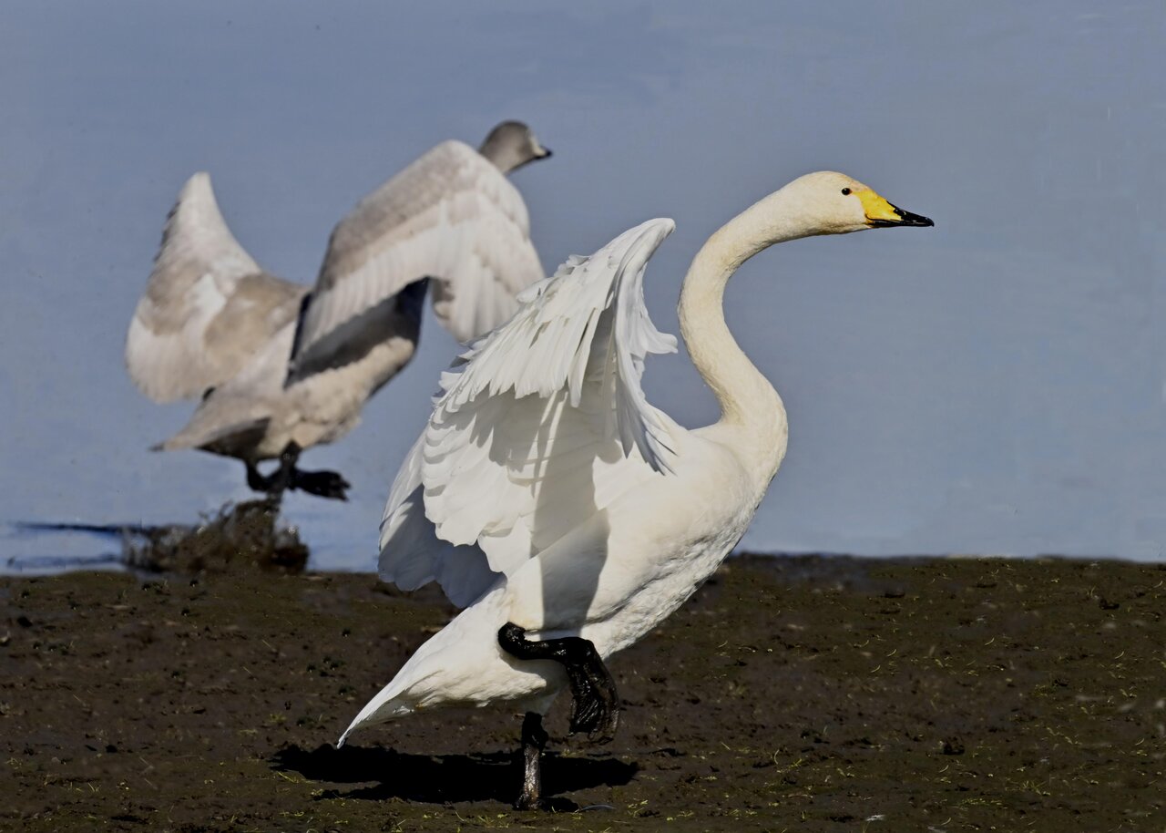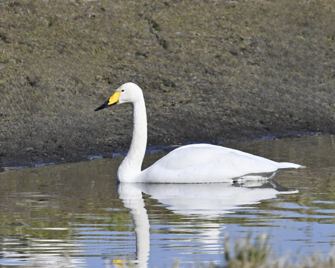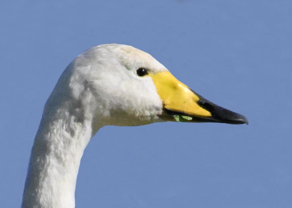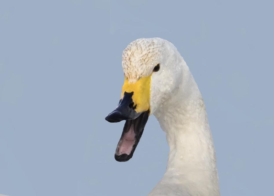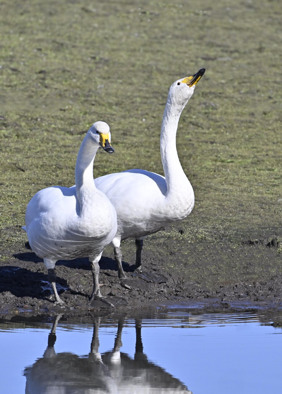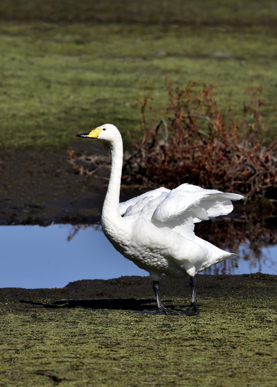 この日は、10羽程のオオハクチョウが渡来していましたが、1羽を除き泥の中での餌捕りで頭が泥塗れでした。