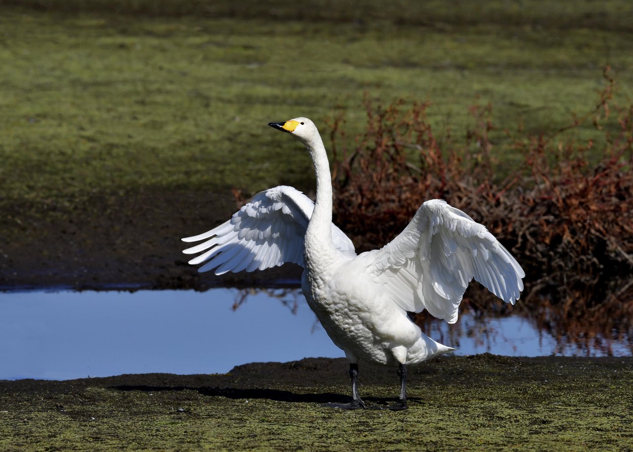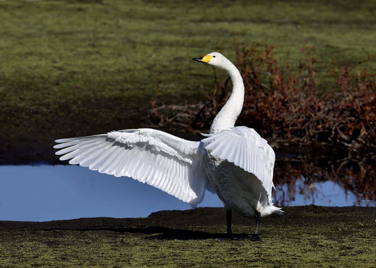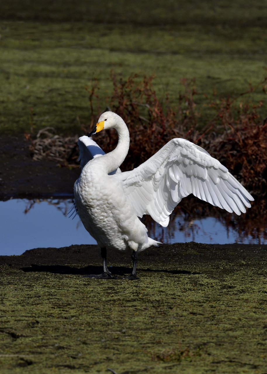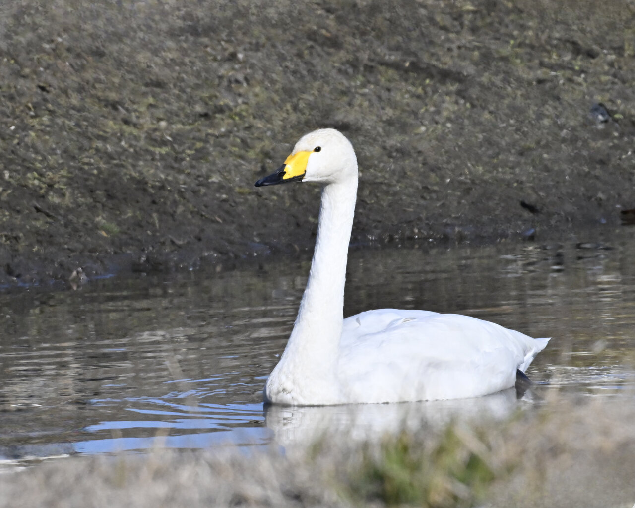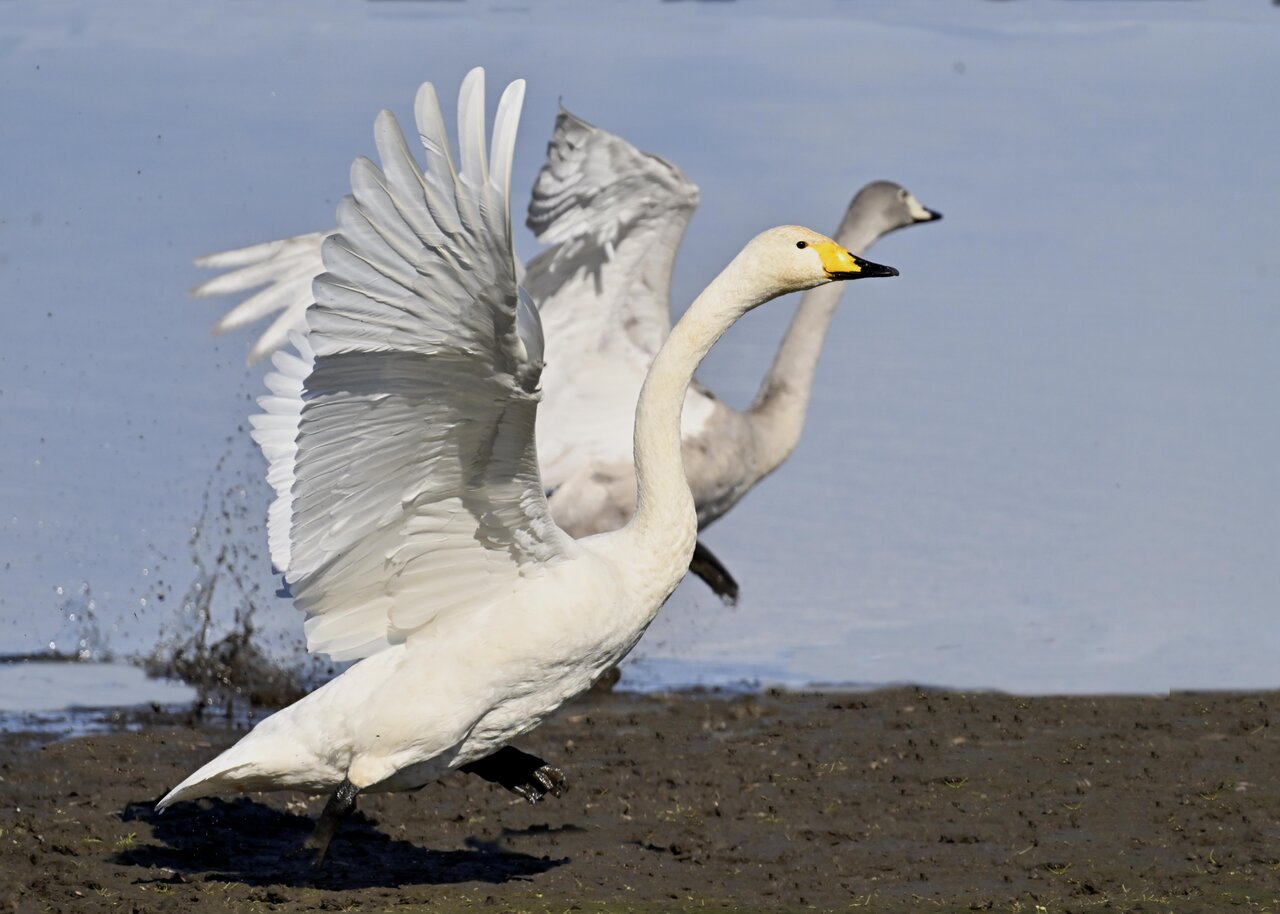 この日は、10羽程のオオハクチョウが渡来していましたが、1羽を除き泥の中での餌捕りで頭が泥塗れでした。
