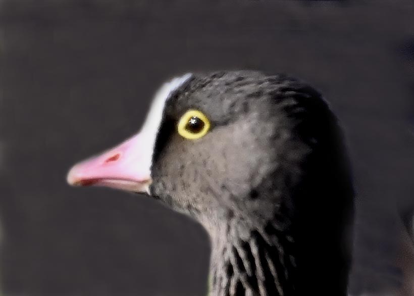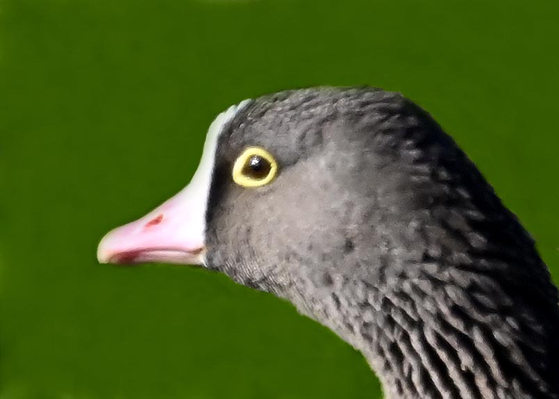 先ずは、対比のため左にカリガネ・右にマガンの顔を掲載します。 カリガネは嘴が短くピンク色で