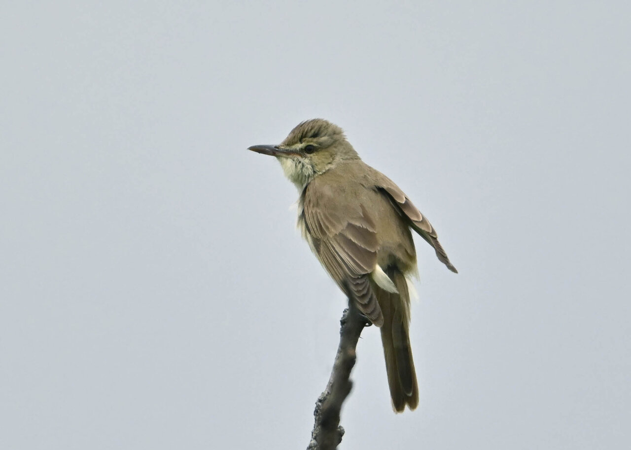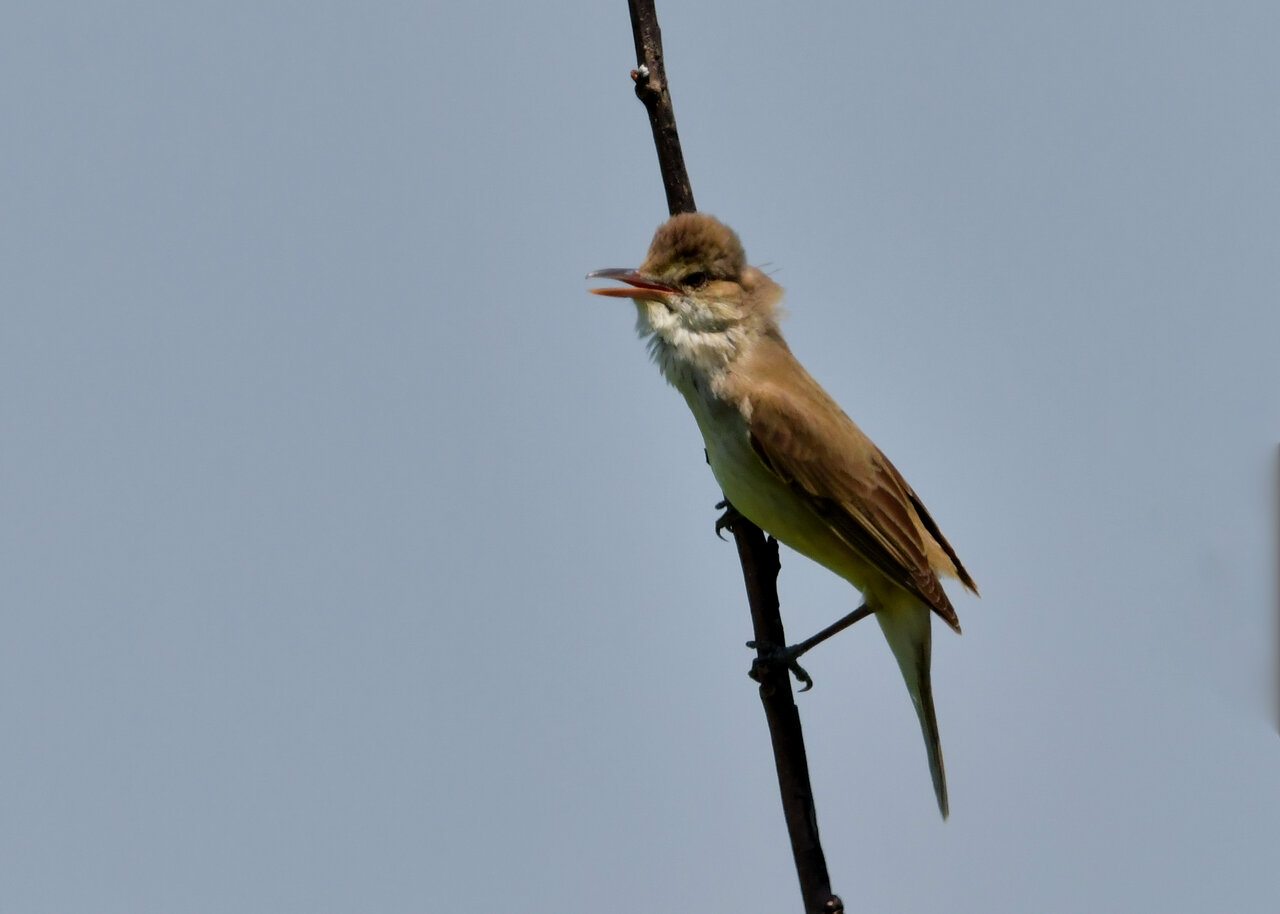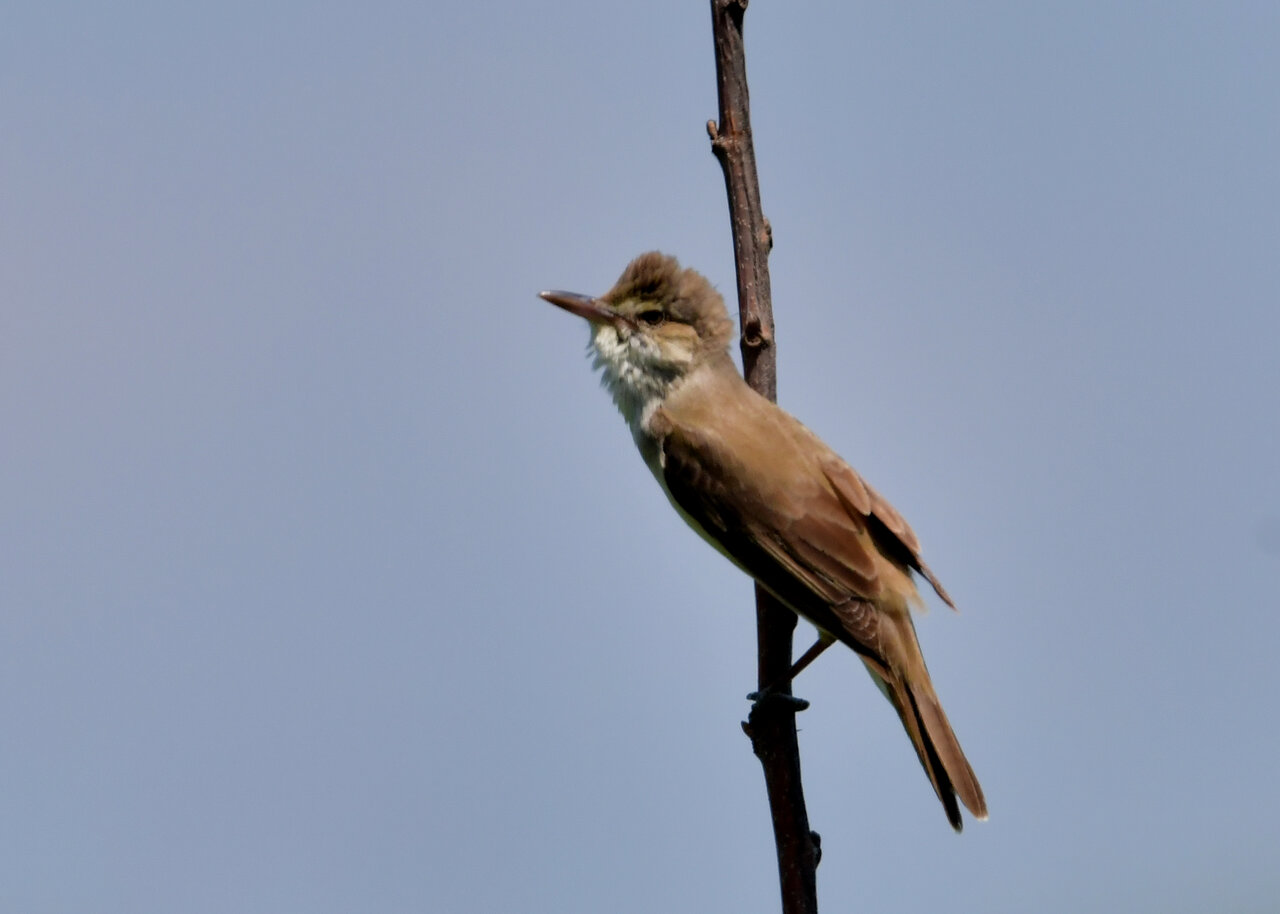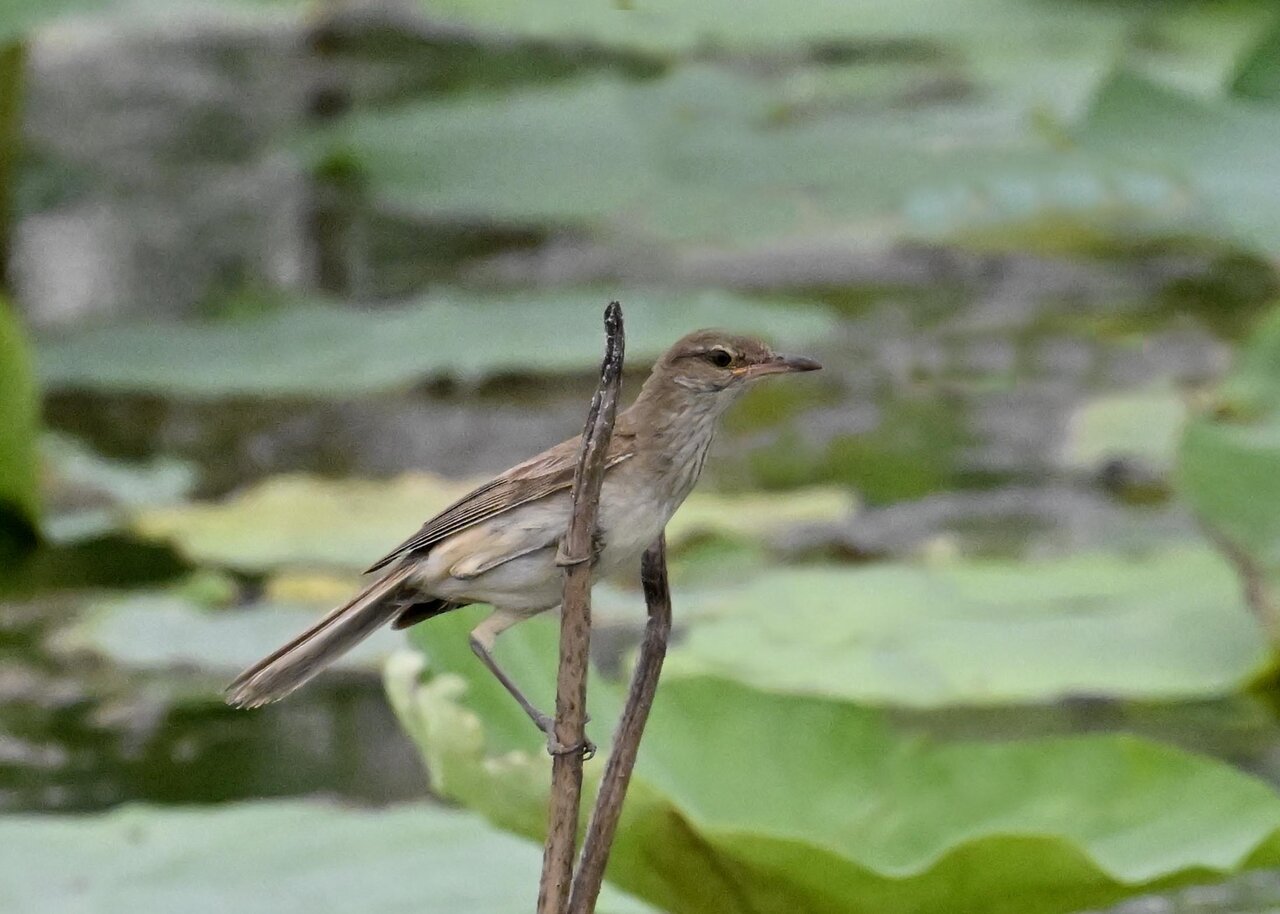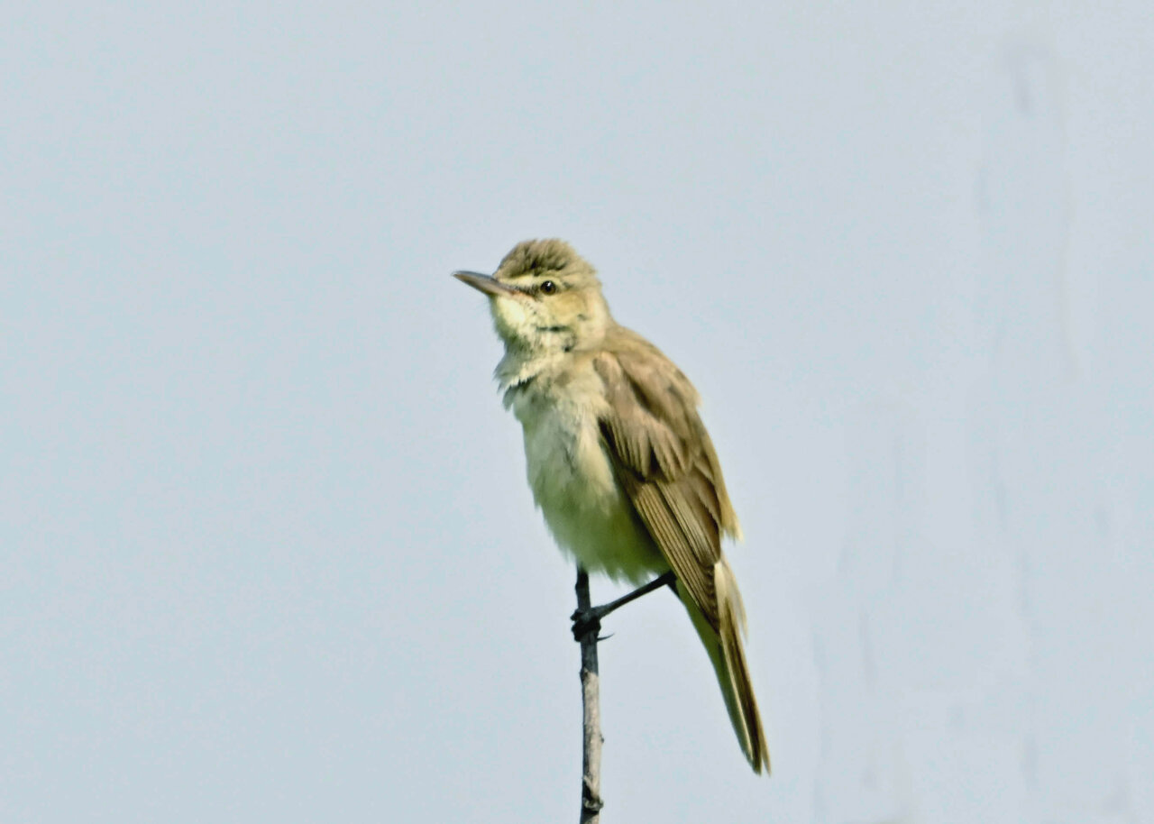 オオヨシキリ・幼鳥は頭部から上面は茶色み(成鳥は灰褐色)を帯び、眉斑や喉から体下部は黄褐色、胸は不明瞭な淡褐色の縦斑が見られます。