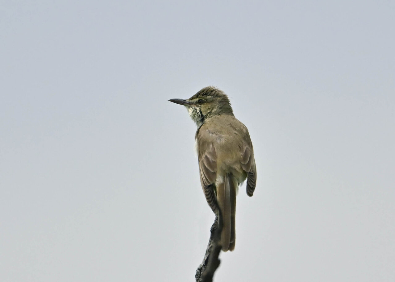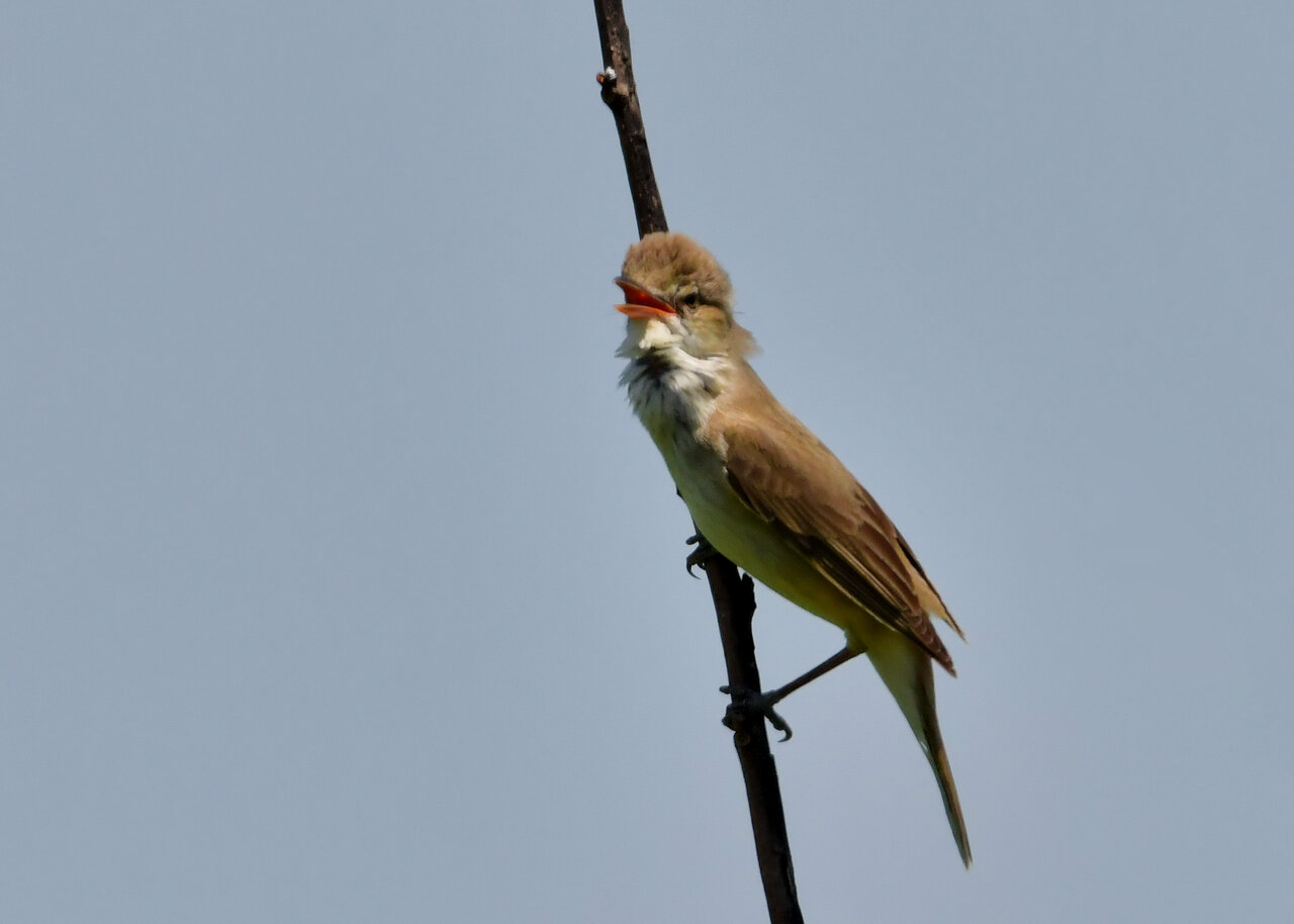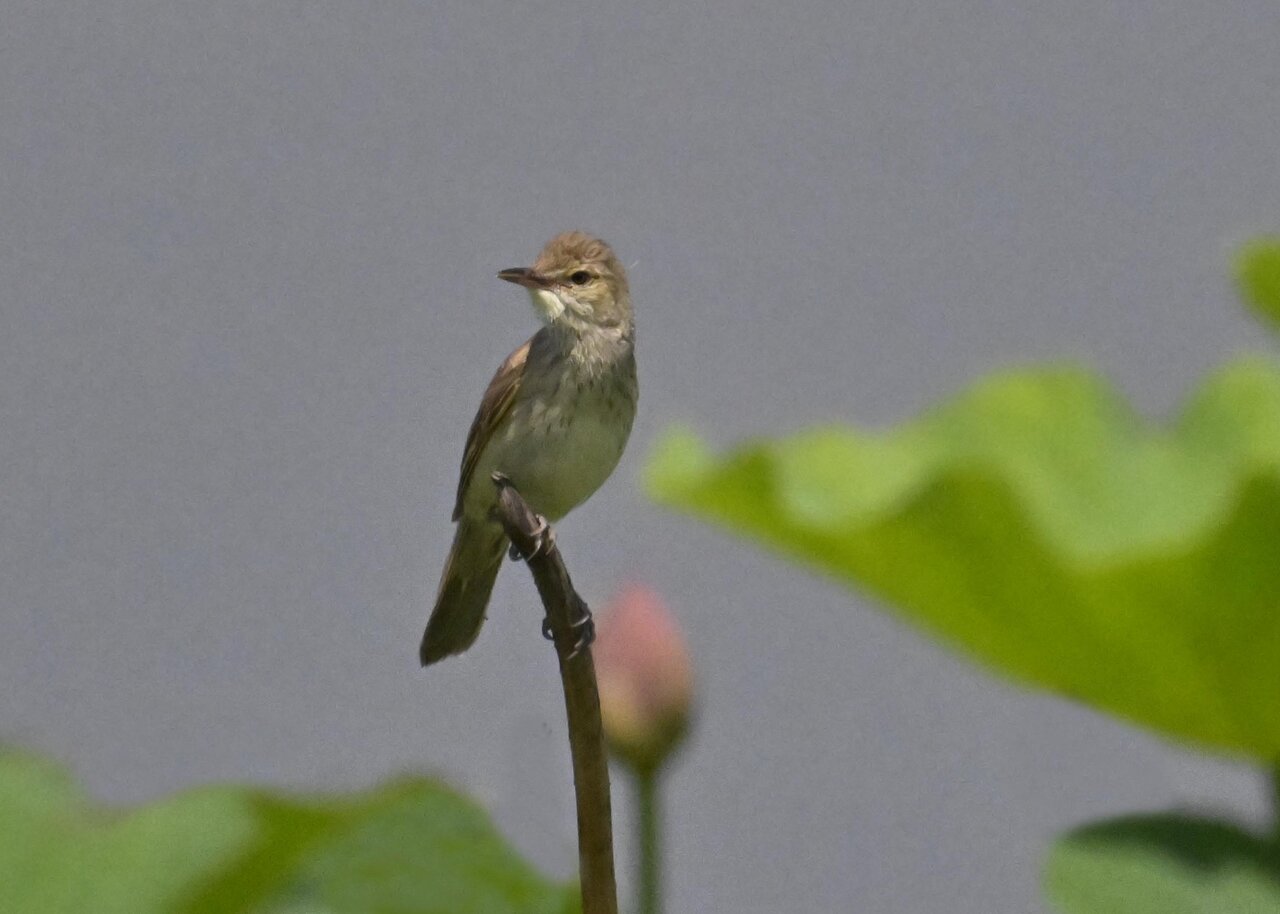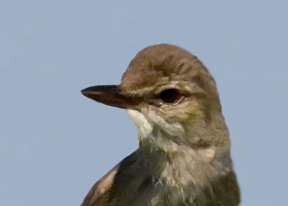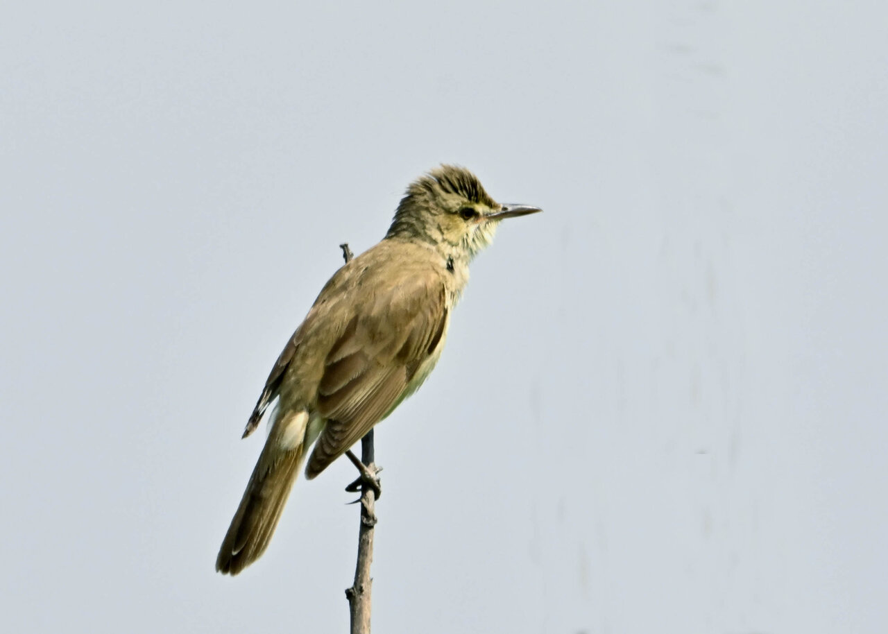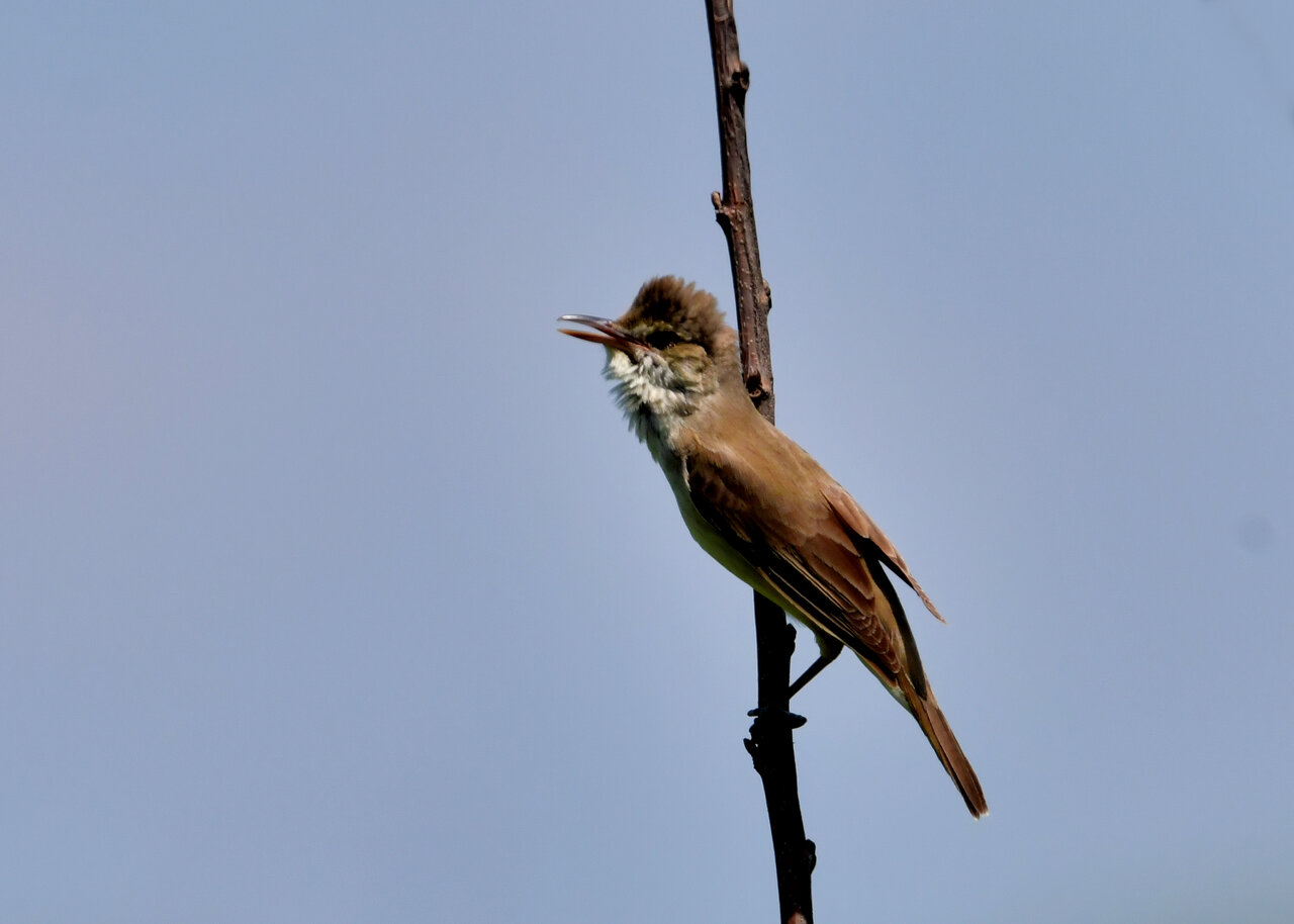 オオヨシキリ・幼鳥は頭部から上面は茶色み(成鳥は灰褐色)を帯び、眉斑や喉から体下部は黄褐色、胸は不明瞭な淡褐色の縦斑が見られます。