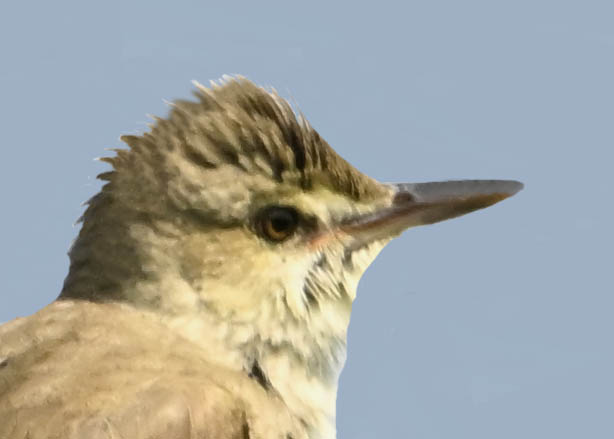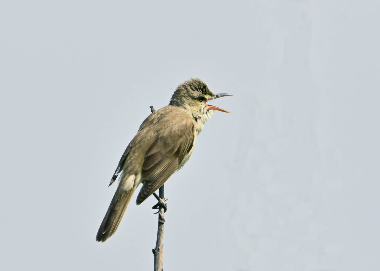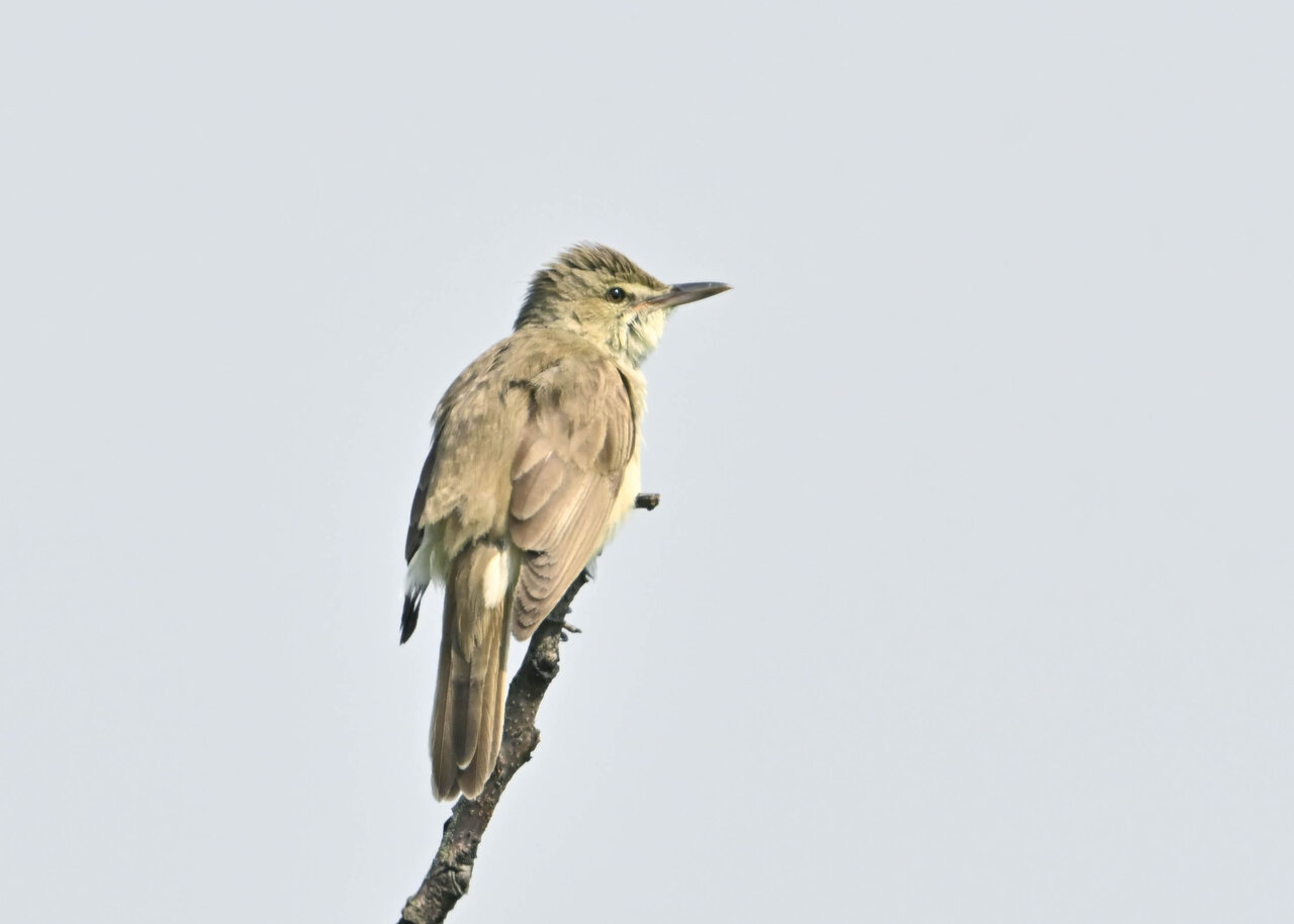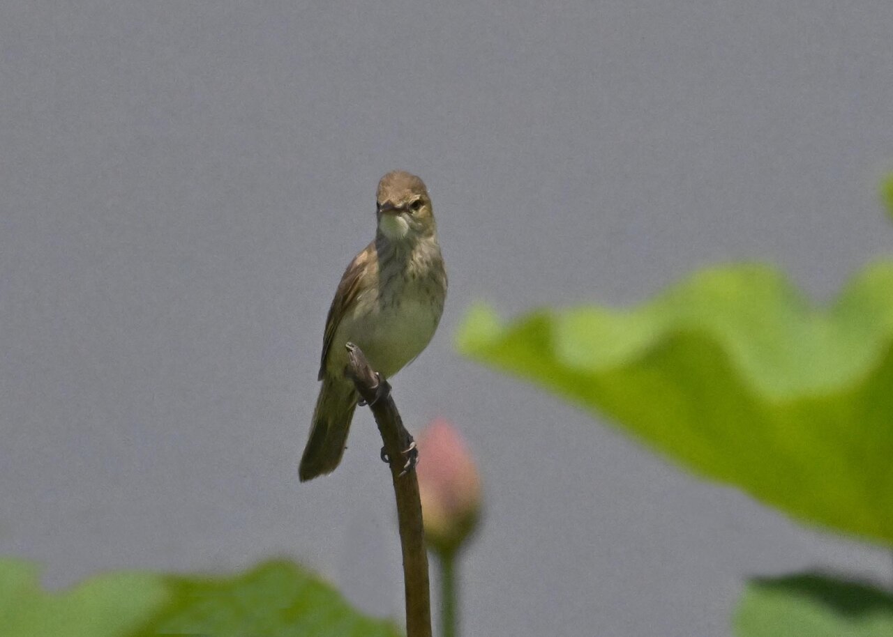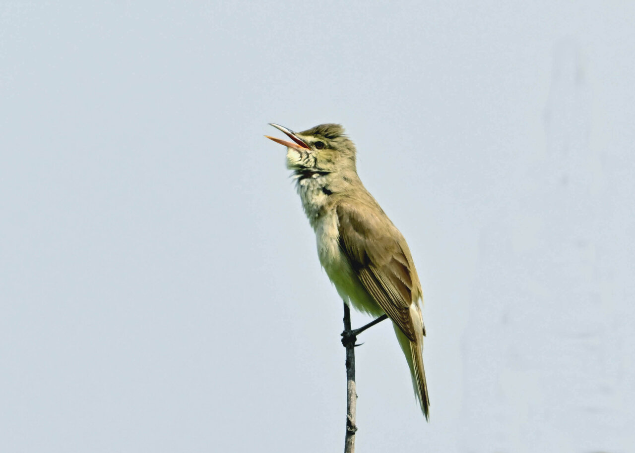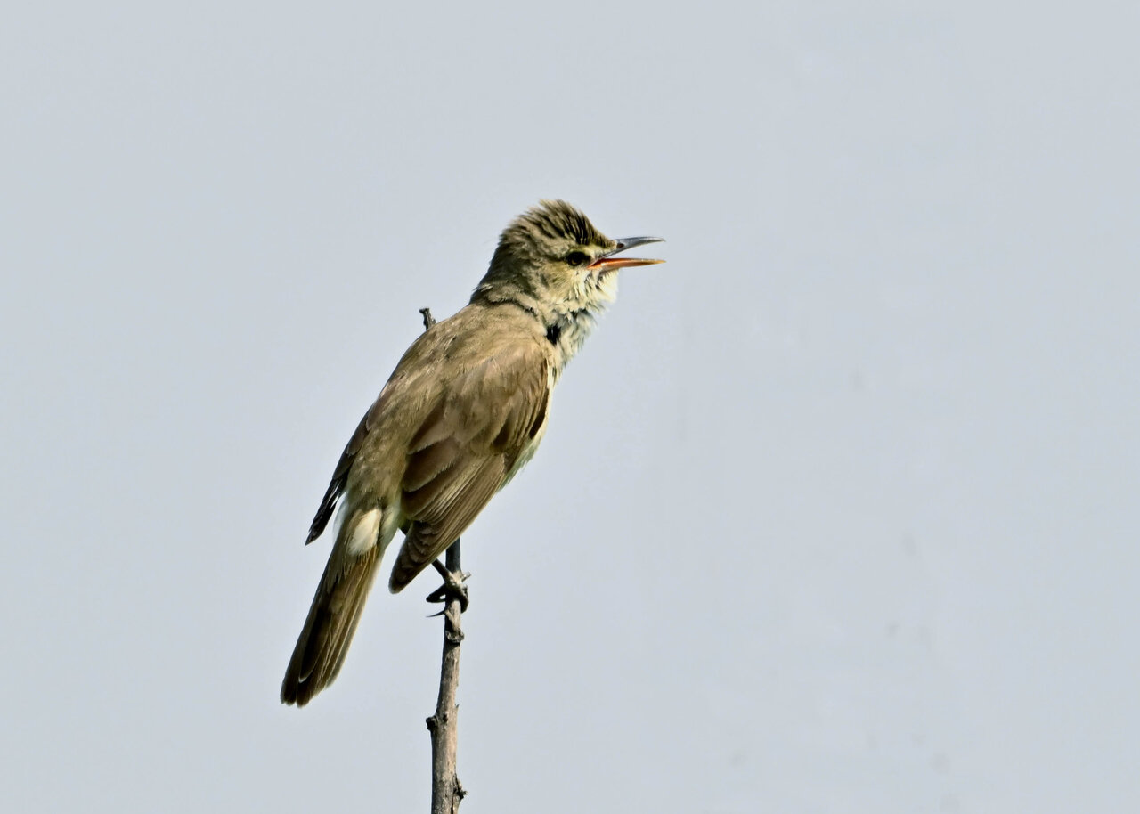 オオヨシキリ・幼鳥は頭部から上面は茶色み(成鳥は灰褐色)を帯び、眉斑や喉から体下部は黄褐色、胸は不明瞭な淡褐色の縦斑が見られます。