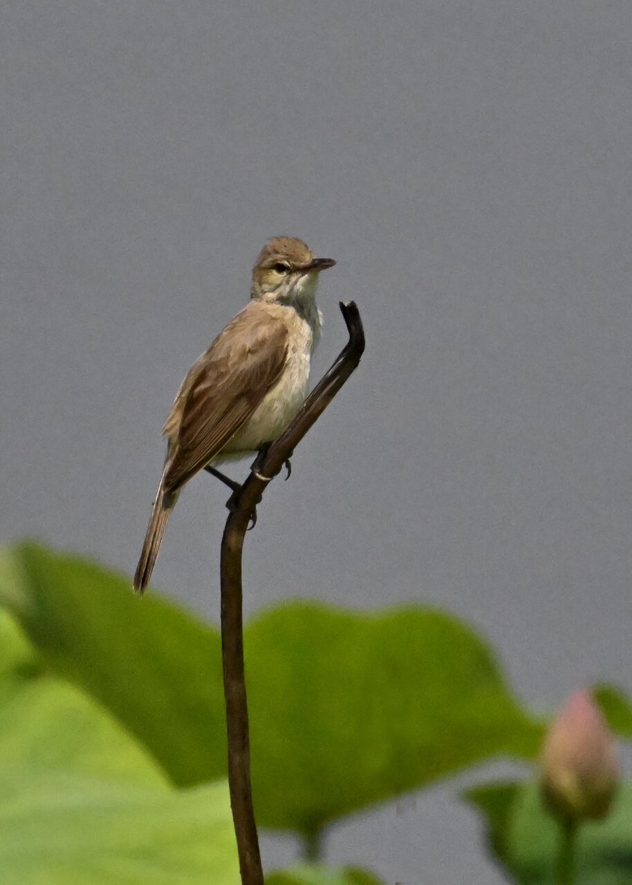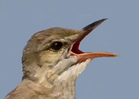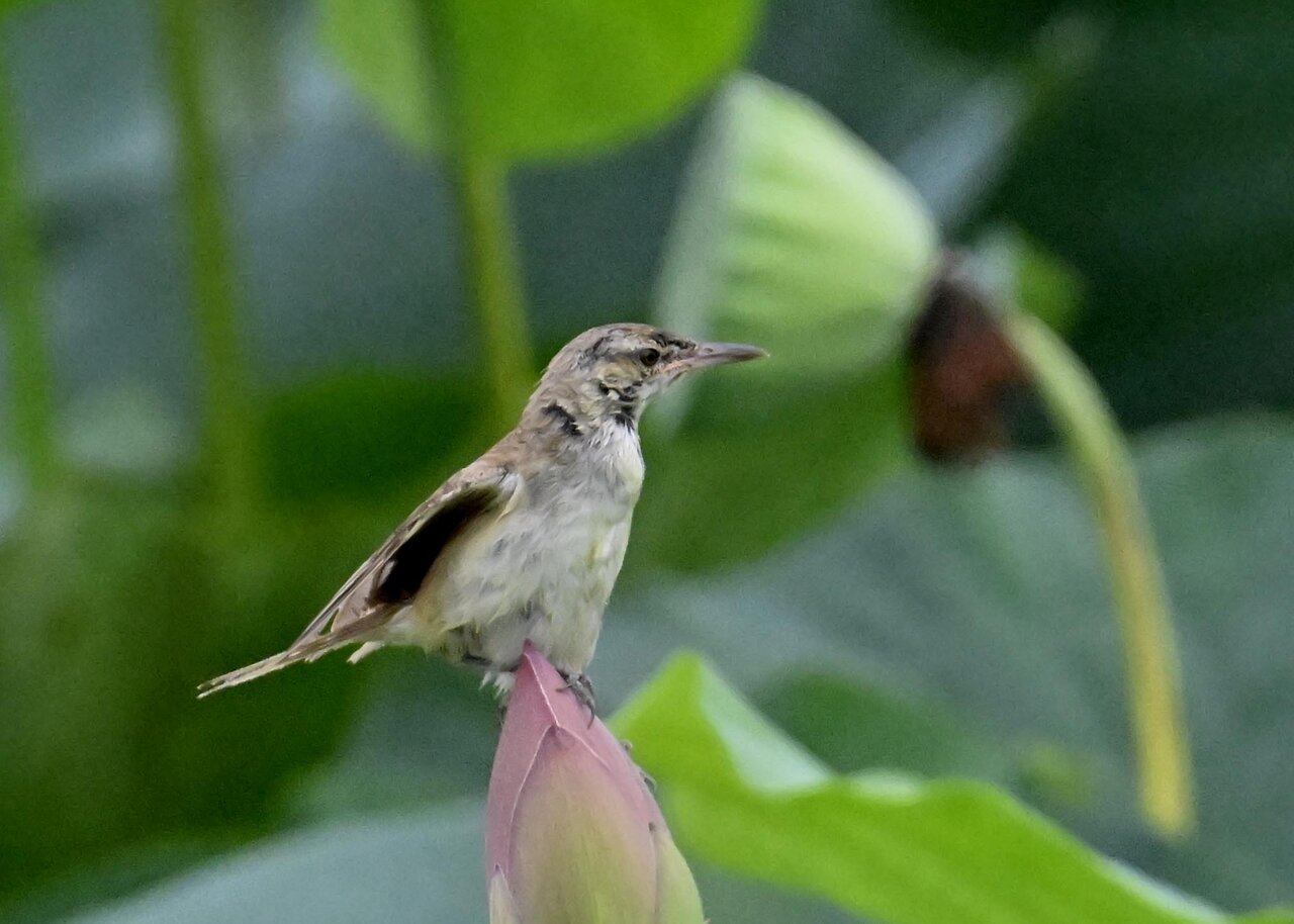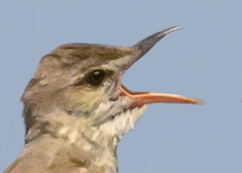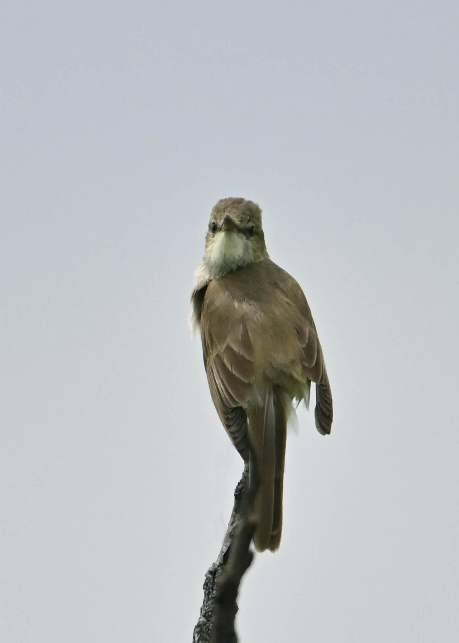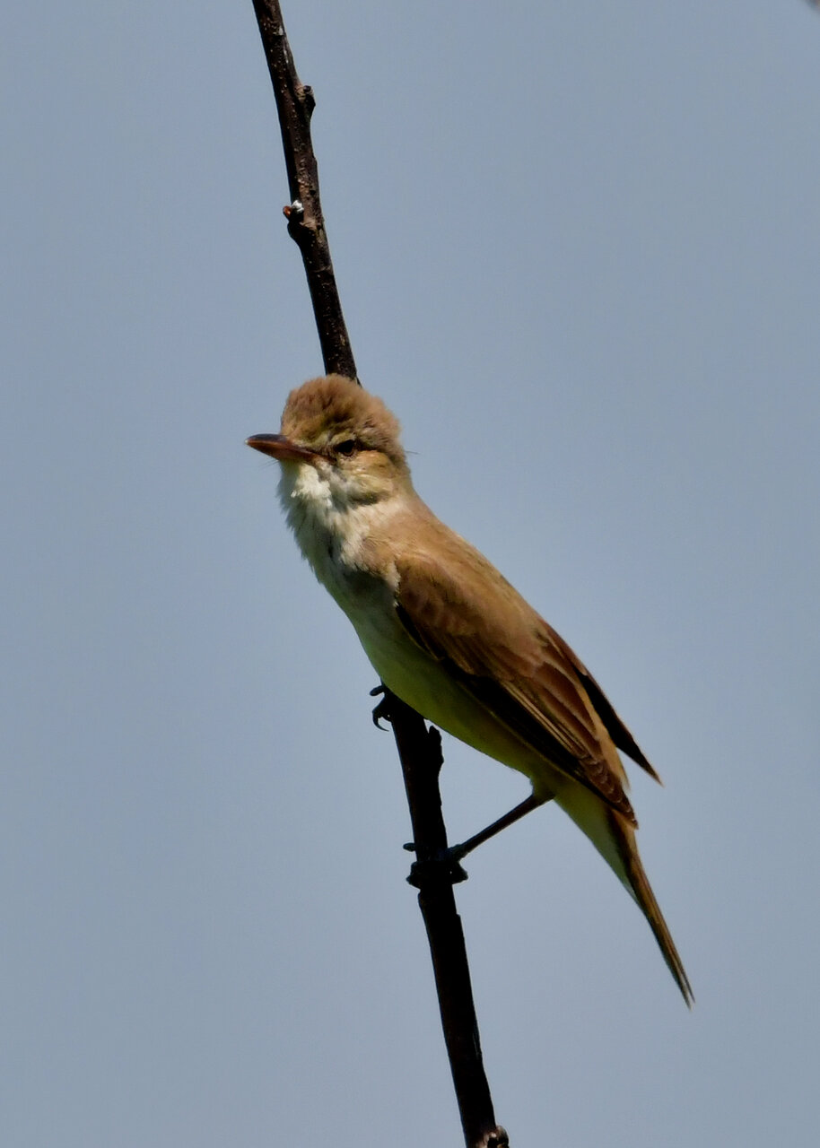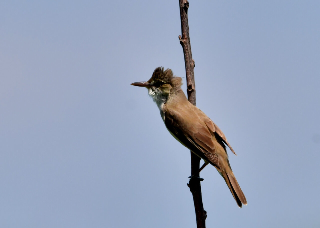 オオヨシキリ・幼鳥は頭部から上面は茶色み(成鳥は灰褐色)を帯び、眉斑や喉から体下部は黄褐色、胸は不明瞭な淡褐色の縦斑が見られます。