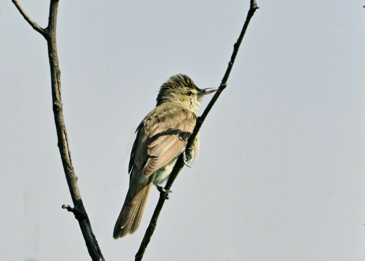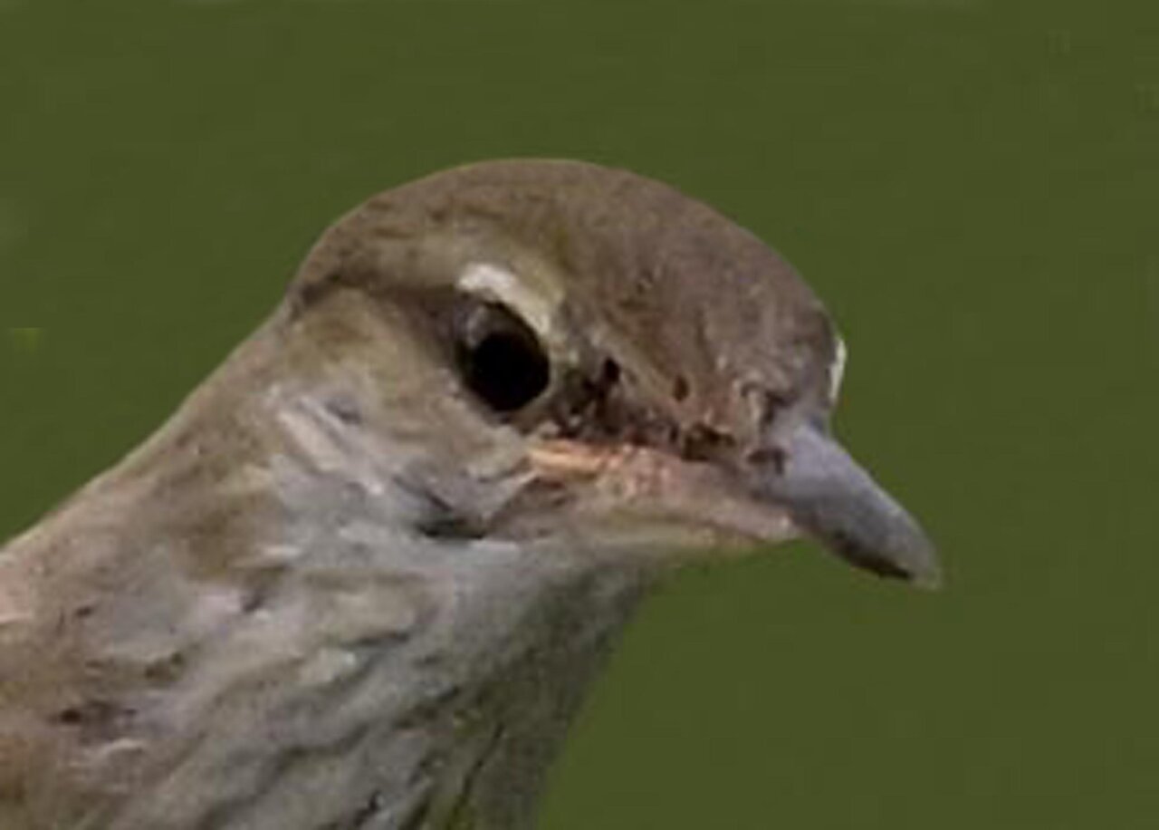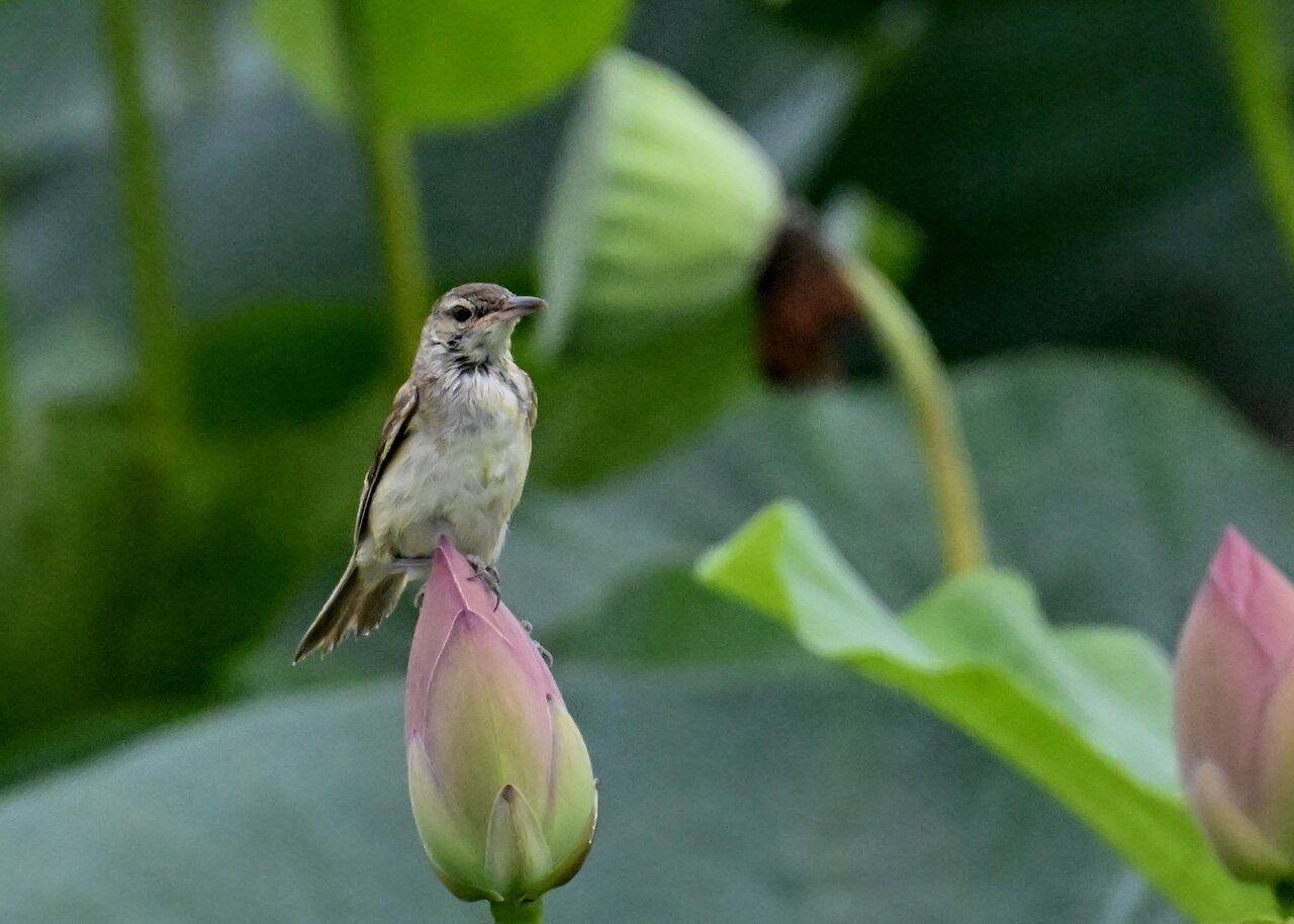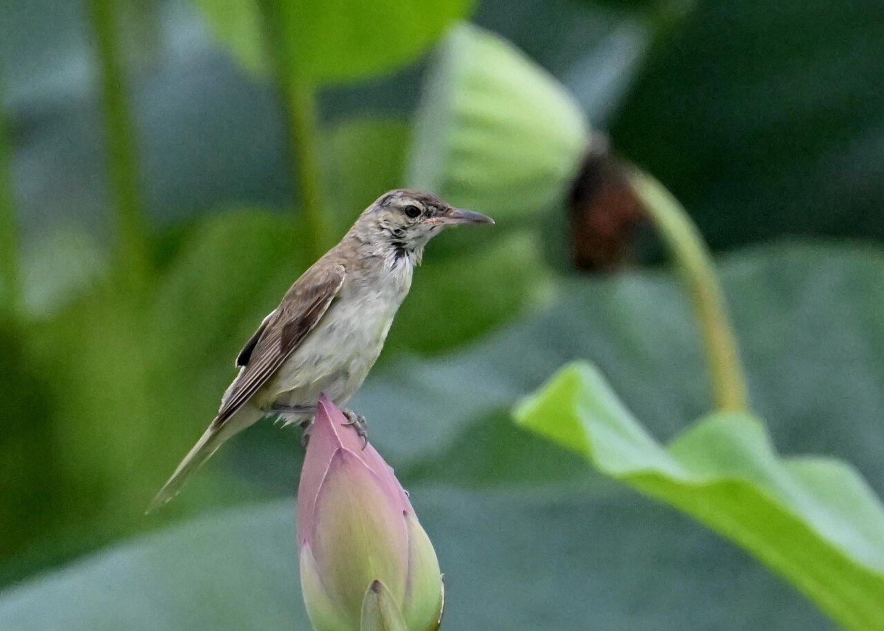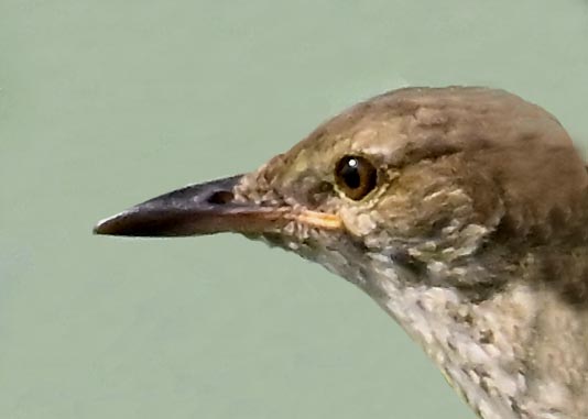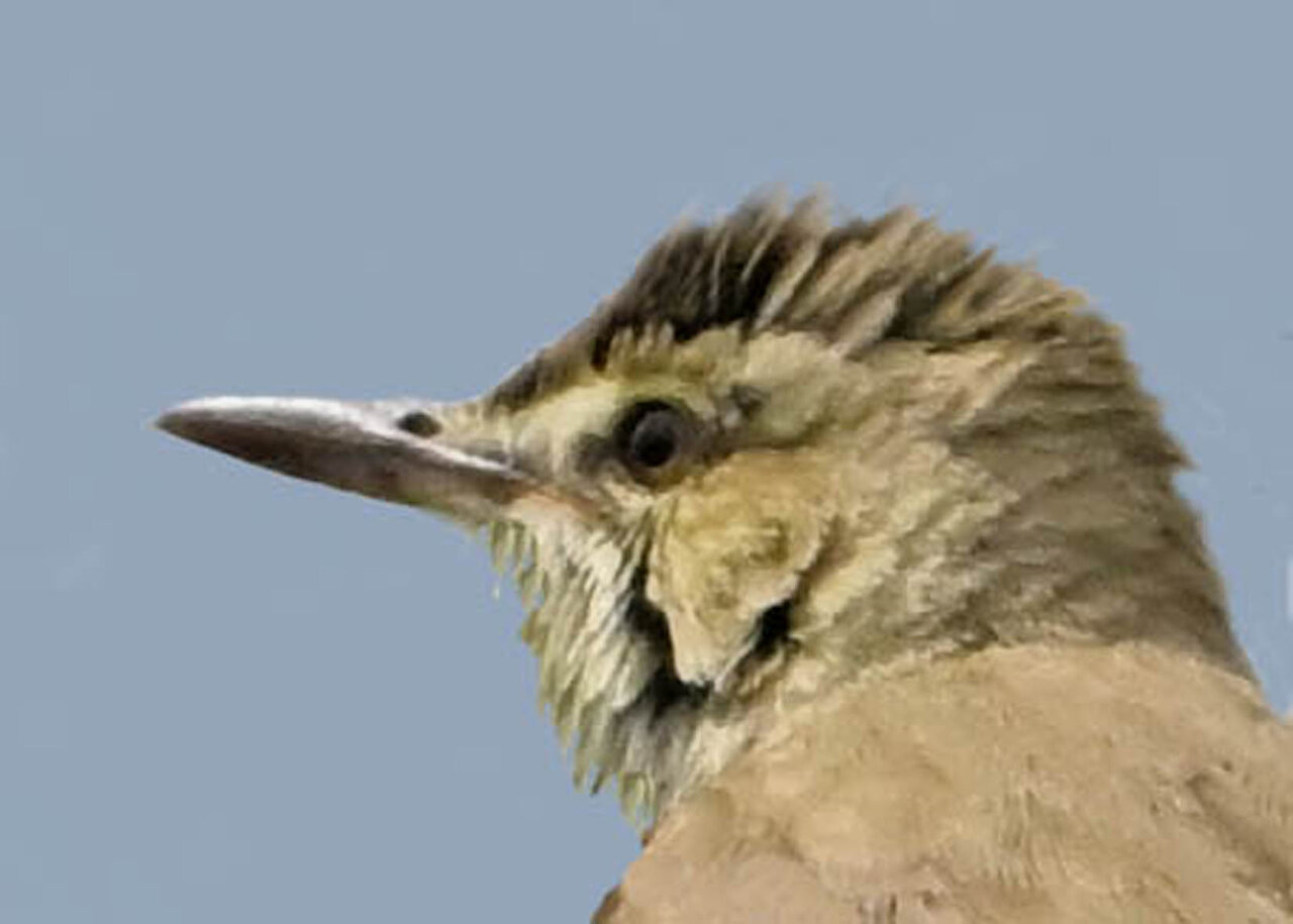 オオヨシキリ・幼鳥は頭部から上面は茶色み(成鳥は灰褐色)を帯び、眉斑や喉から体下部は黄褐色、胸は不明瞭な淡褐色の縦斑が見られます。