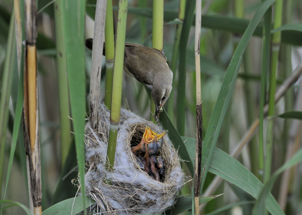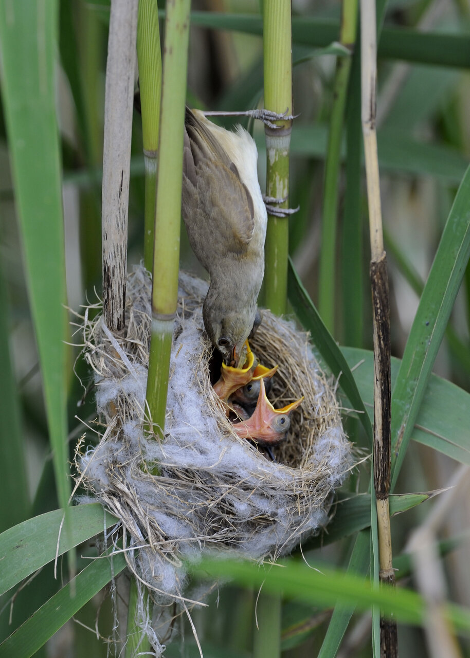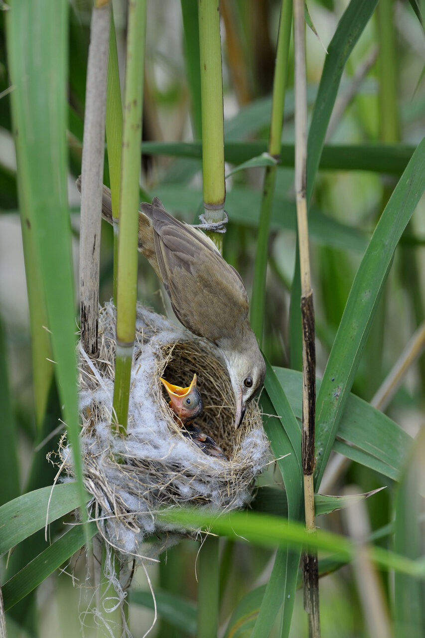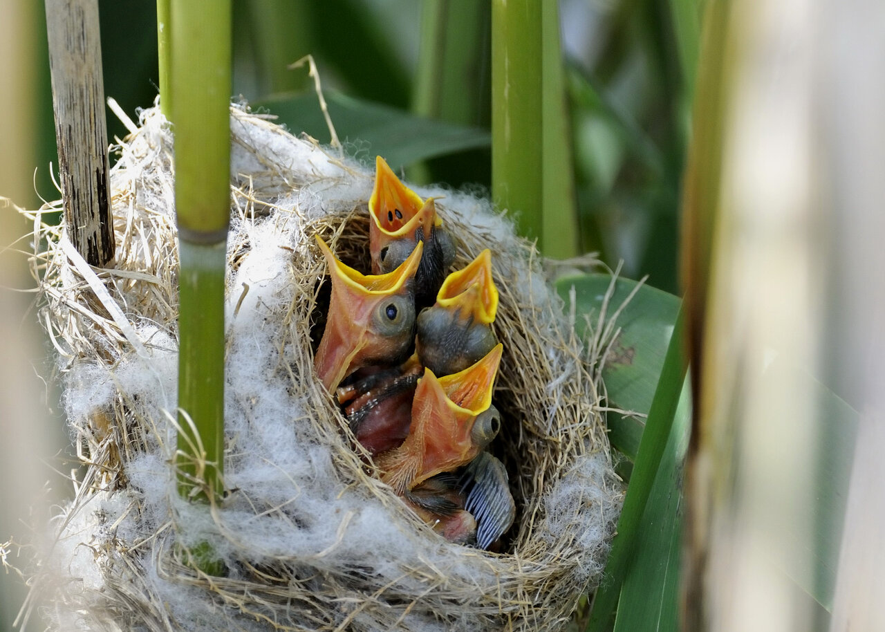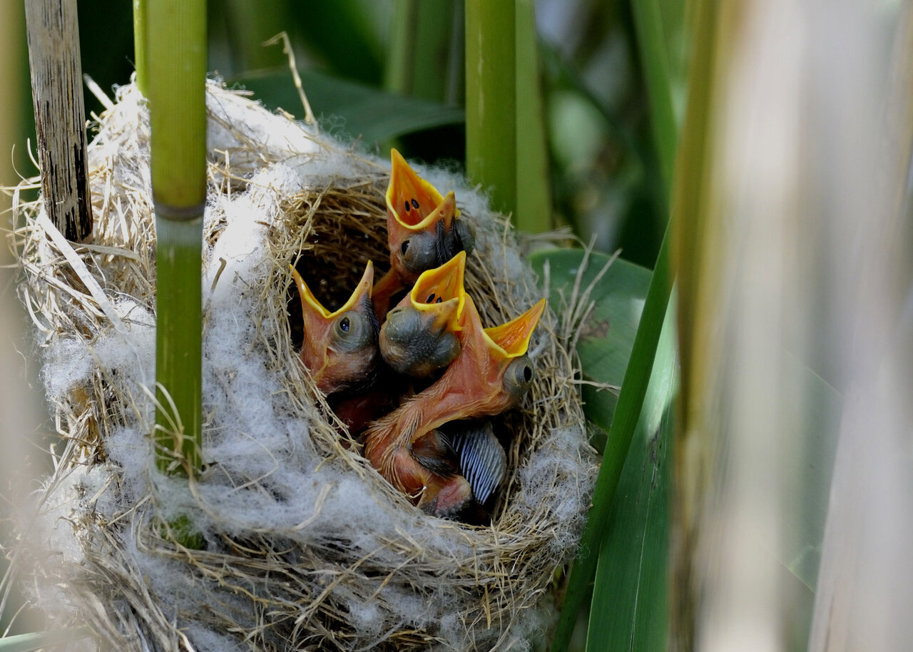 オオヨシキリのヒナが親鳥の気配を感じ餌をねだって居ます。