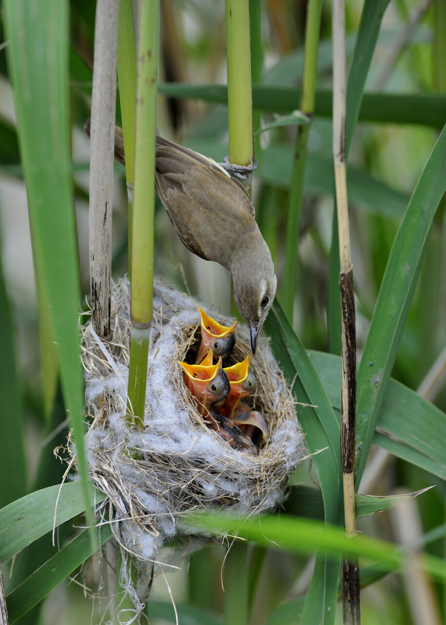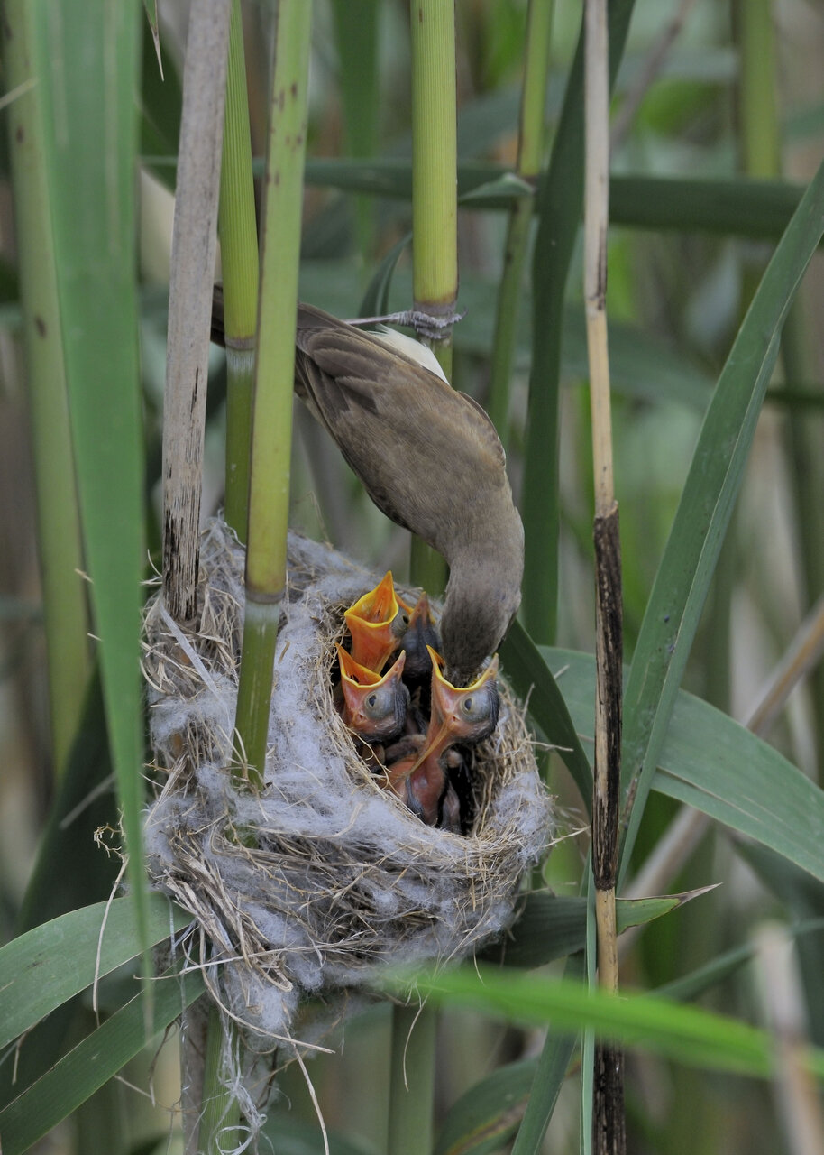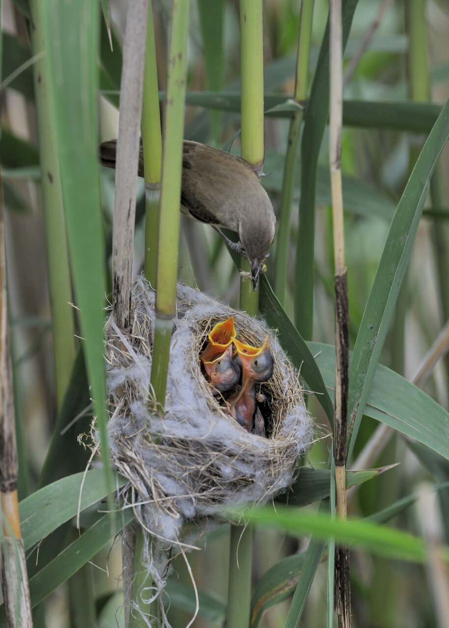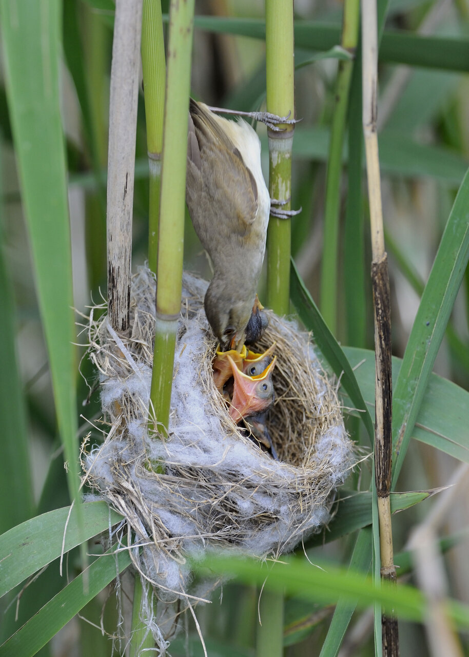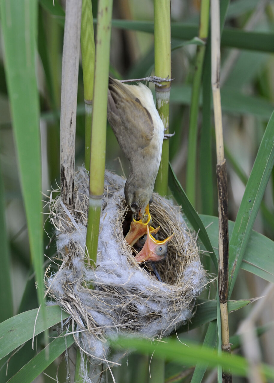 オオヨシキリのヒナが親鳥の気配を感じ餌をねだって居ます。