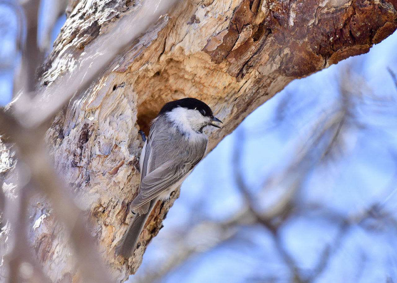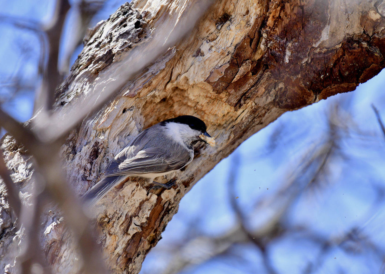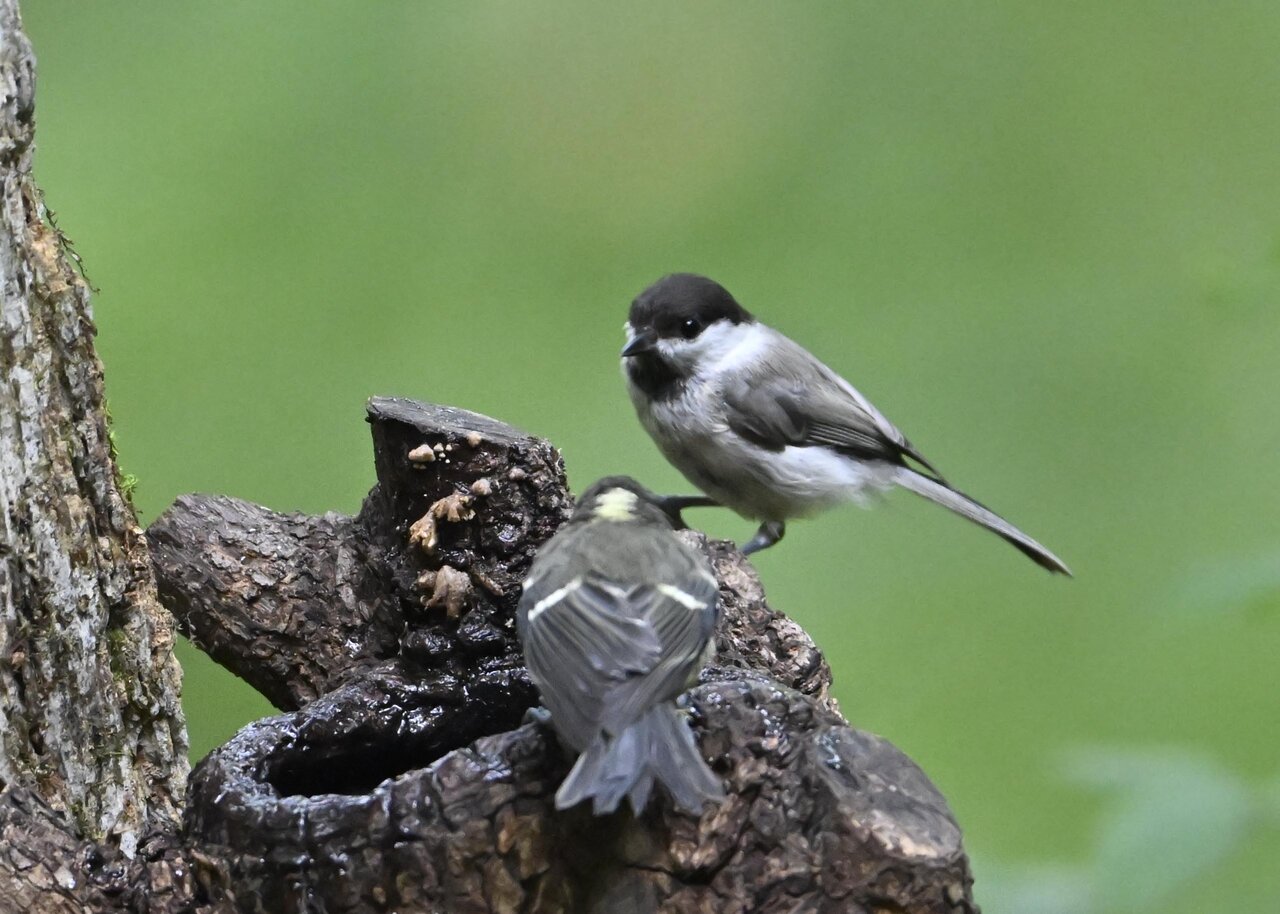 コガラのペアーが巣作りしていました。 ♂と♀が交互に巣穴に顔を突っ込んで木くずを