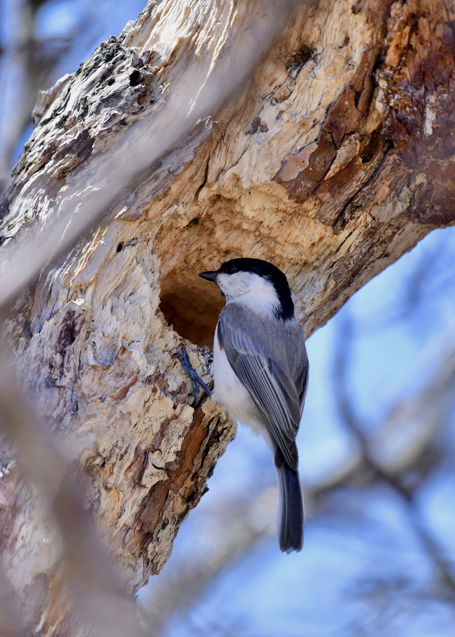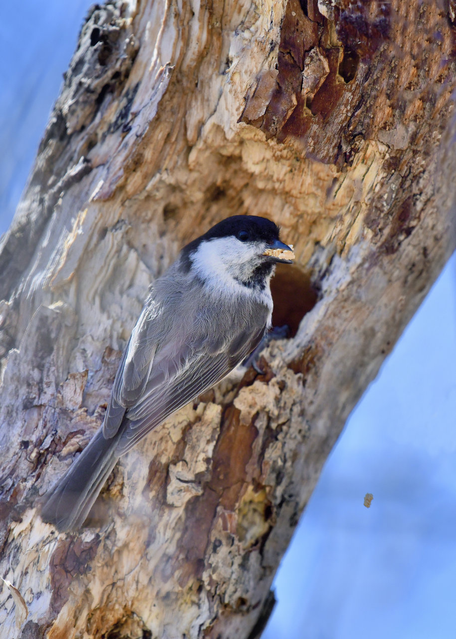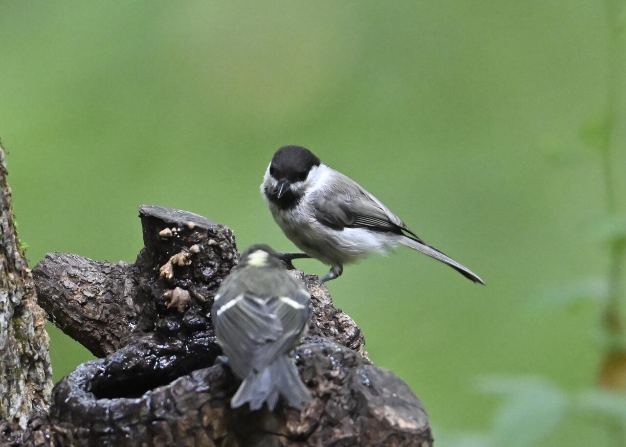 コガラのペアーが巣作りしていました。 ♂と♀が交互に巣穴に顔を突っ込んで木くずを