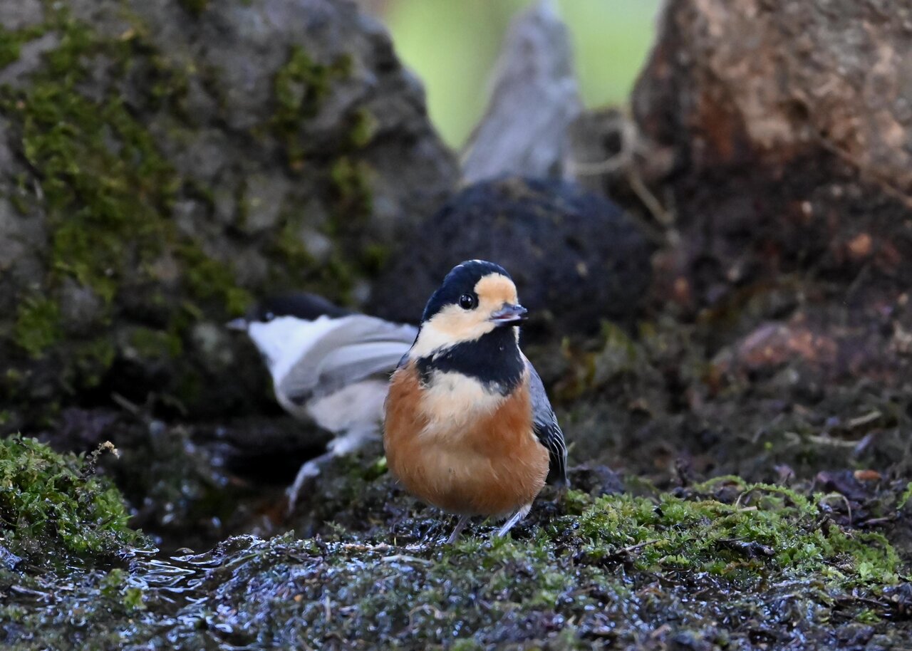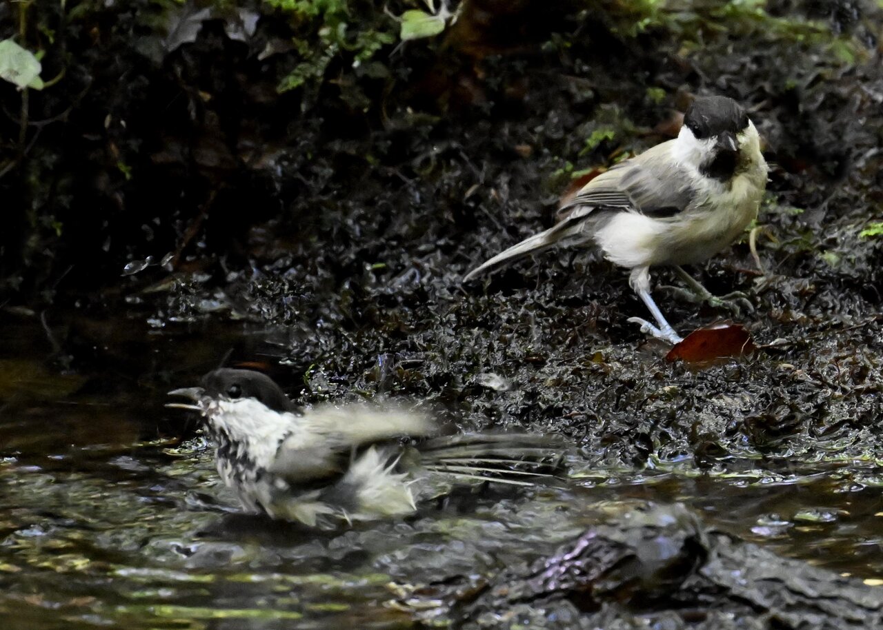 仲良く水浴びとは言えコガラとヤマガラは縦位置にいるので、レンズ開放値では両者にピントが