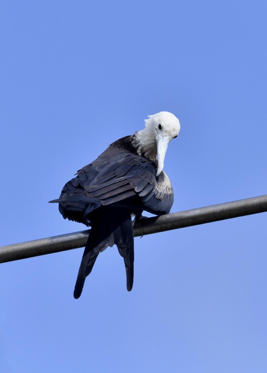 こちらの個体は、頭部がほぼ真白で嘴の色も青灰色です。足もとが鉄柱なので先ずは、上