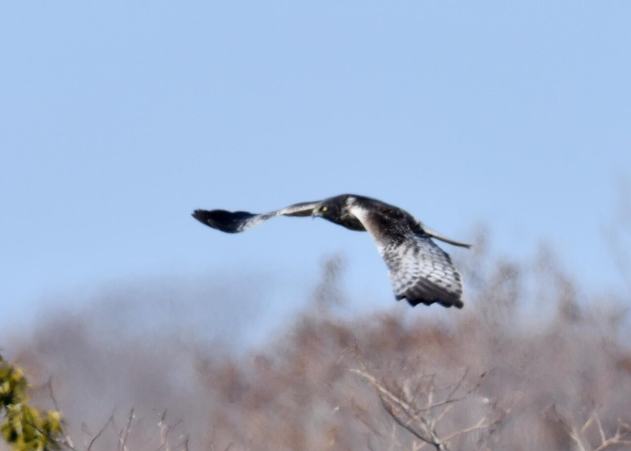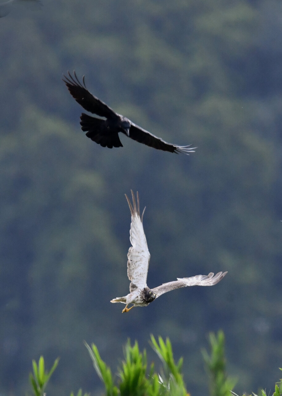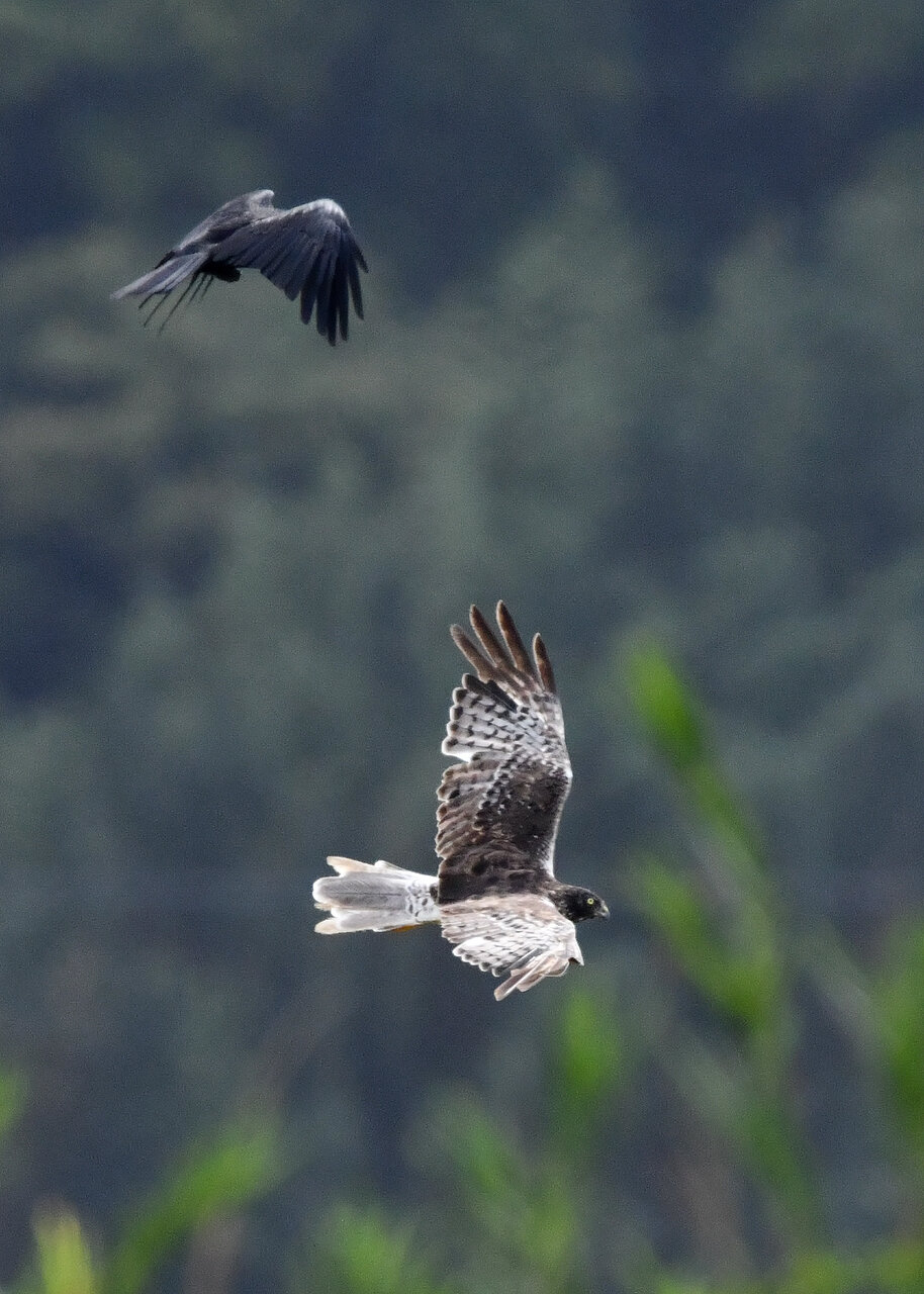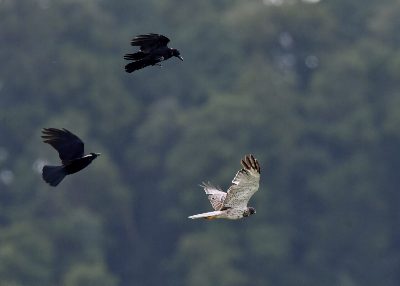 引き続き、大陸型チュウヒ(愛称:ズグロチュウヒ)で申し訳ありません。 昨日の掲載のトビに威嚇された後は暫く木の枝で休息しましたが、その後はカラスが威嚇にやって来ました。