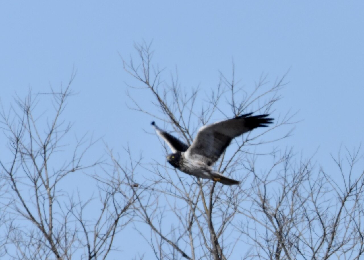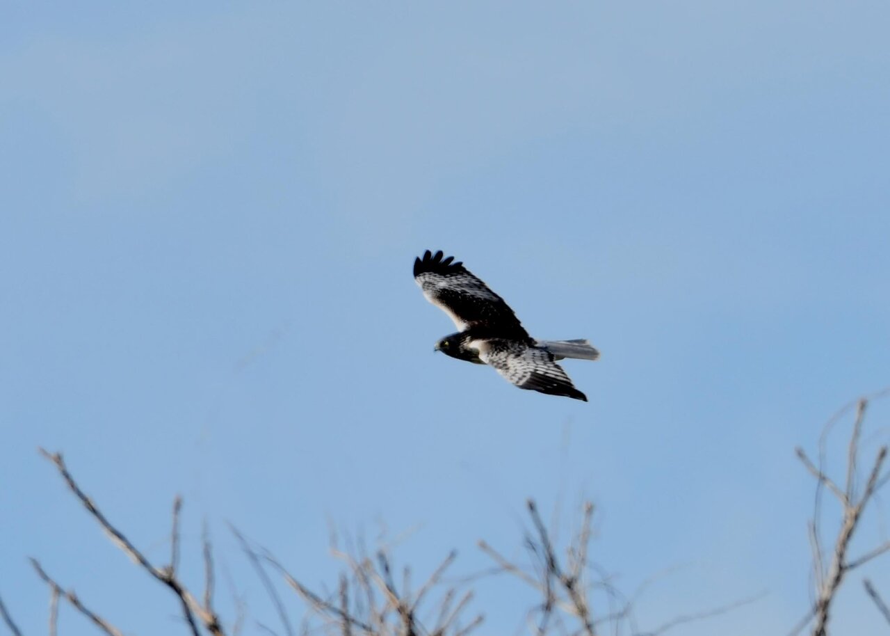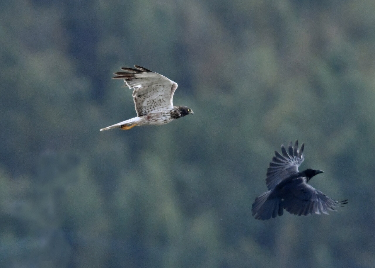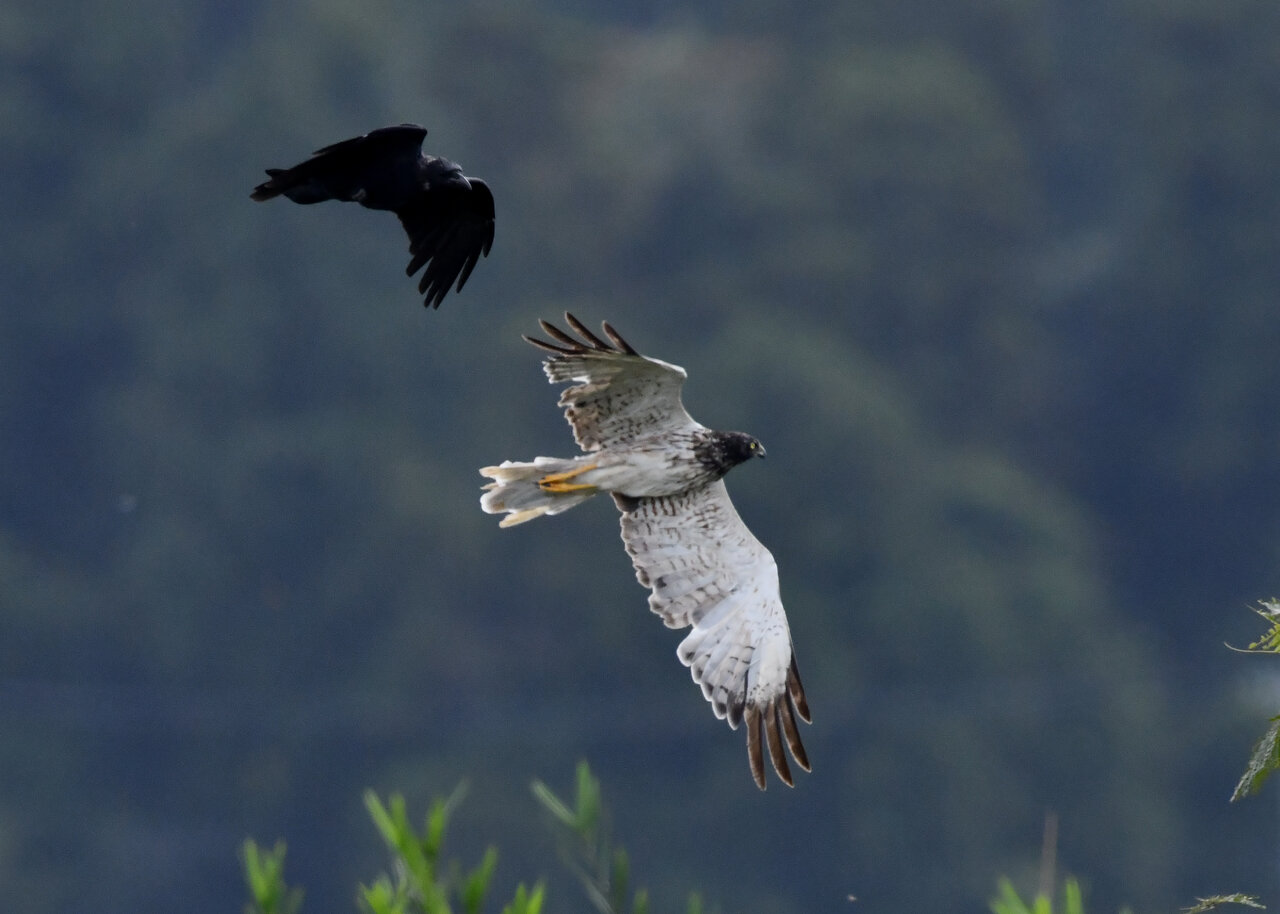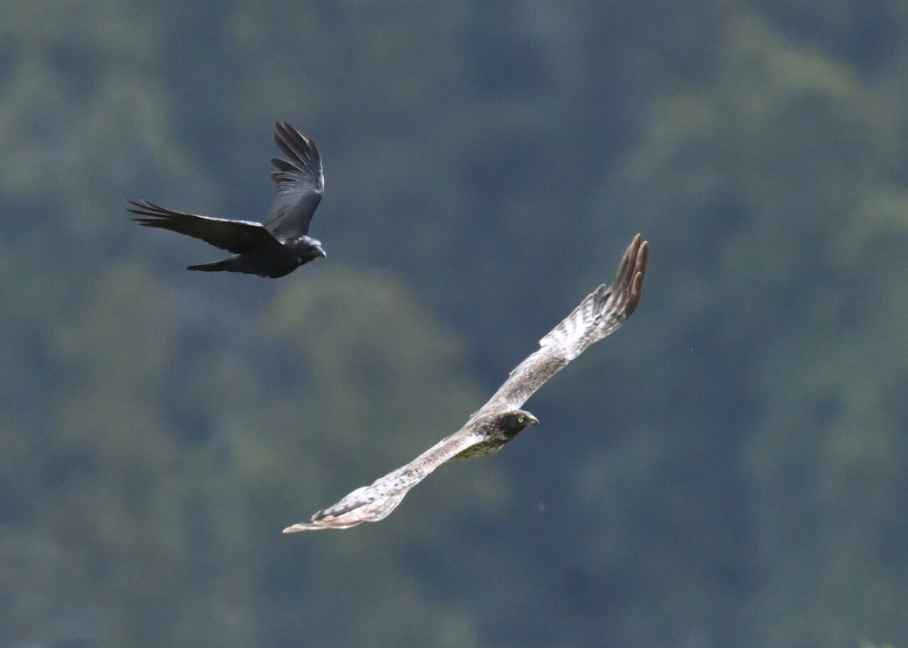 引き続き、大陸型チュウヒ(愛称:ズグロチュウヒ)で申し訳ありません。 昨日の掲載のトビに威嚇された後は暫く木の枝で休息しましたが、その後はカラスが威嚇にやって来ました。