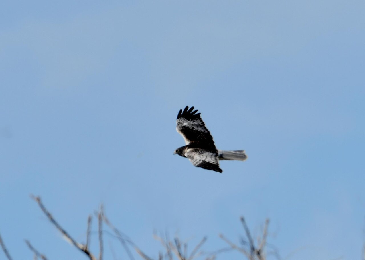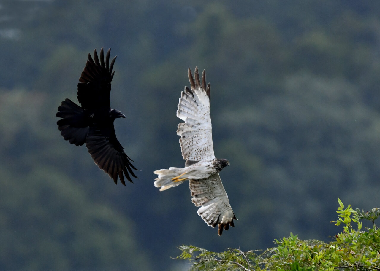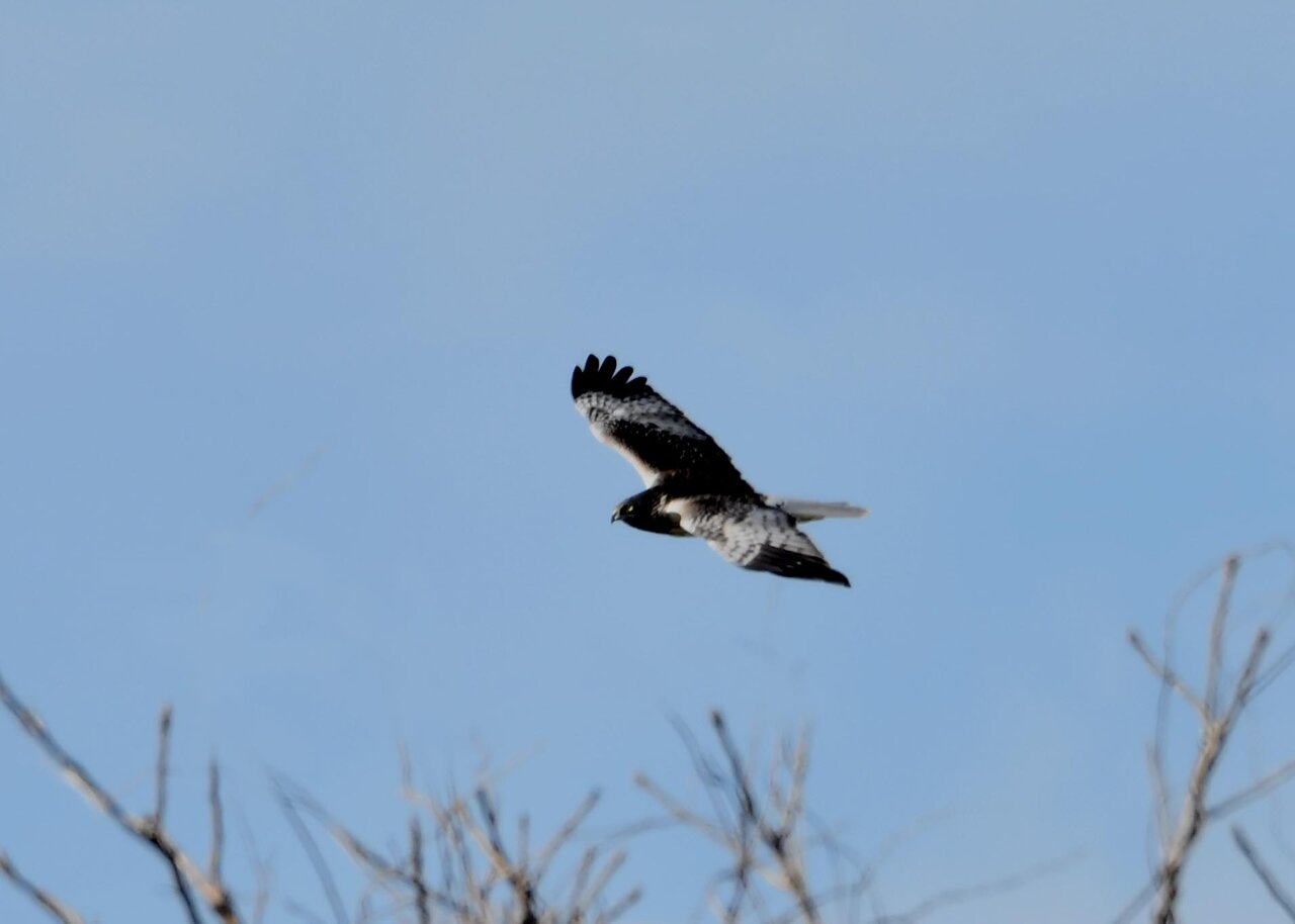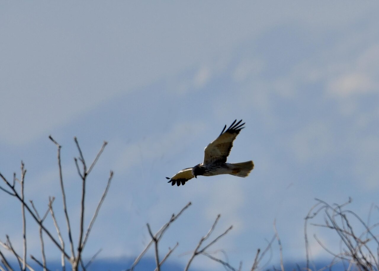 引き続き、大陸型チュウヒ(愛称:ズグロチュウヒ)で申し訳ありません。 昨日の掲載のトビに威嚇された後は暫く木の枝で休息しましたが、その後はカラスが威嚇にやって来ました。