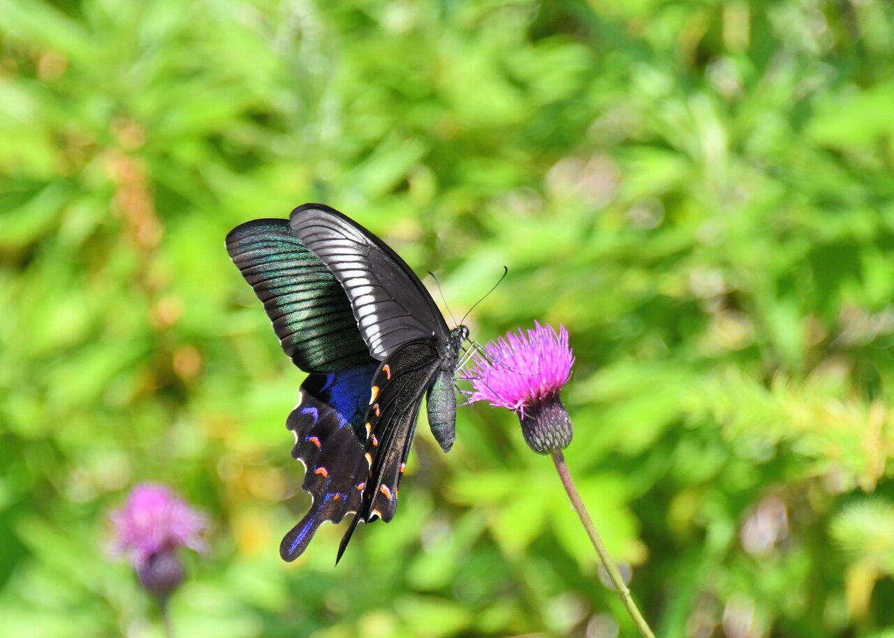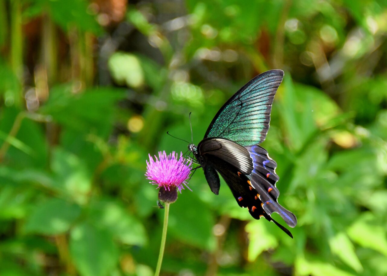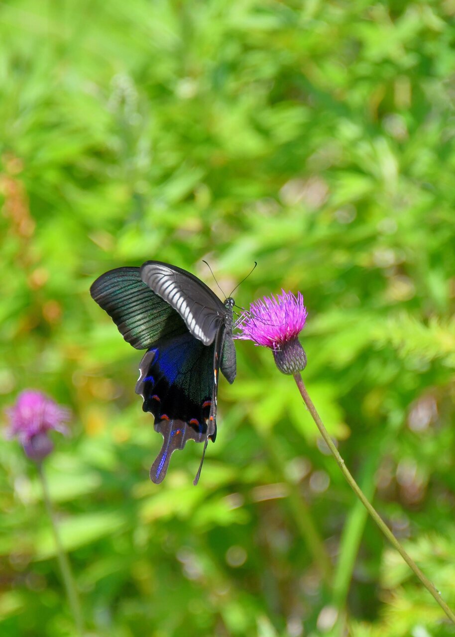 先ずはノアザミの花に吸密にやって来たカラスアゲハ♂です。