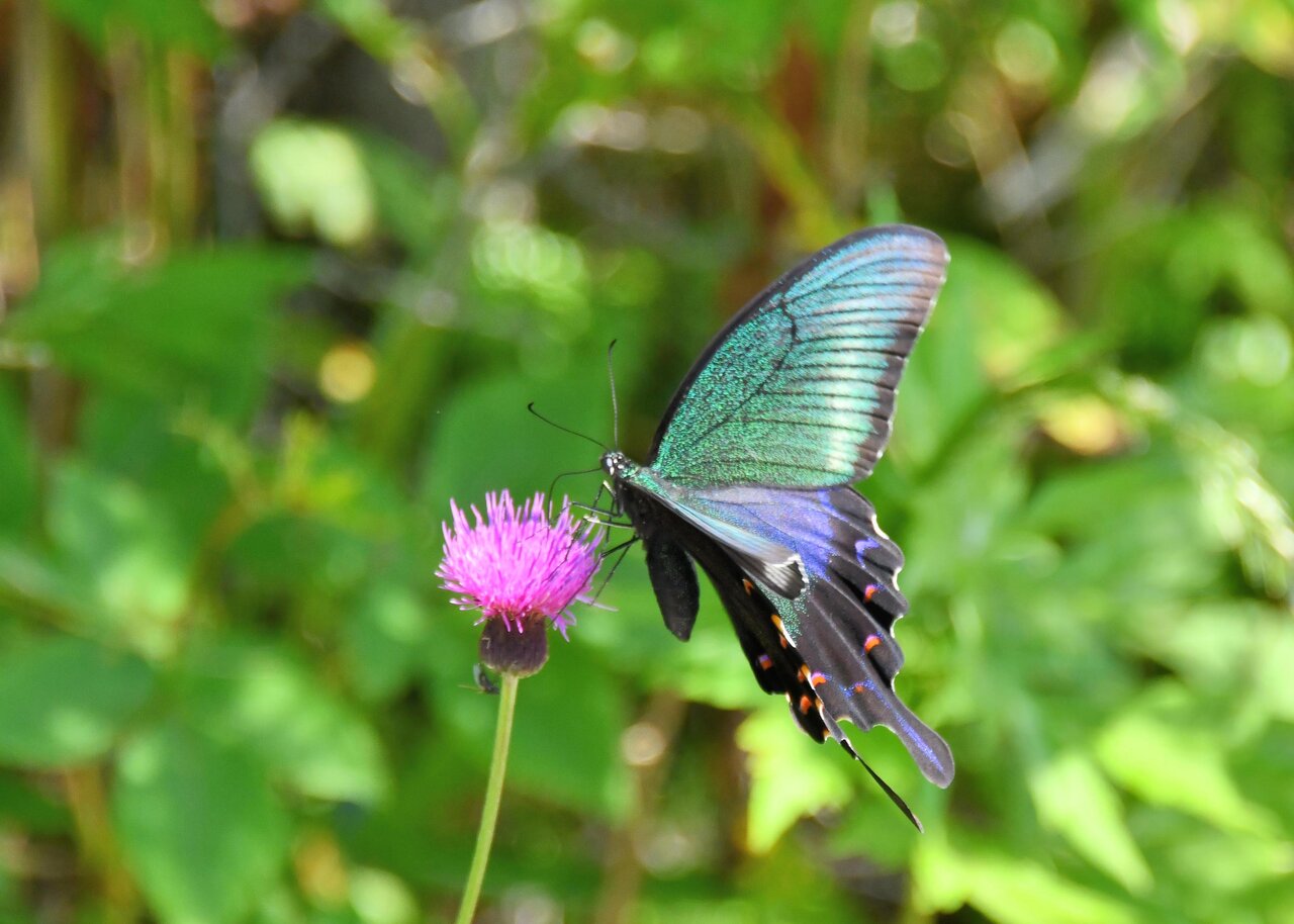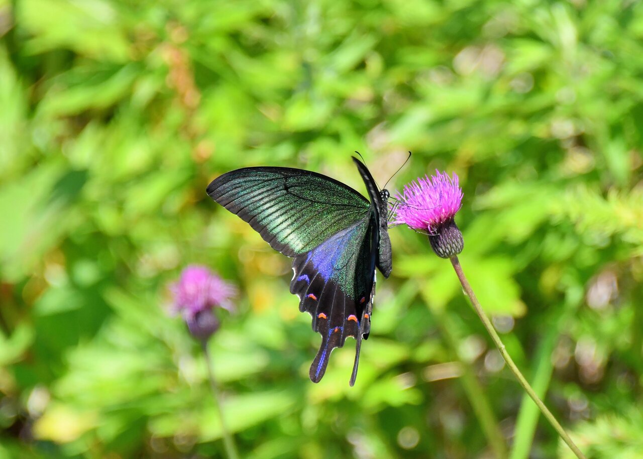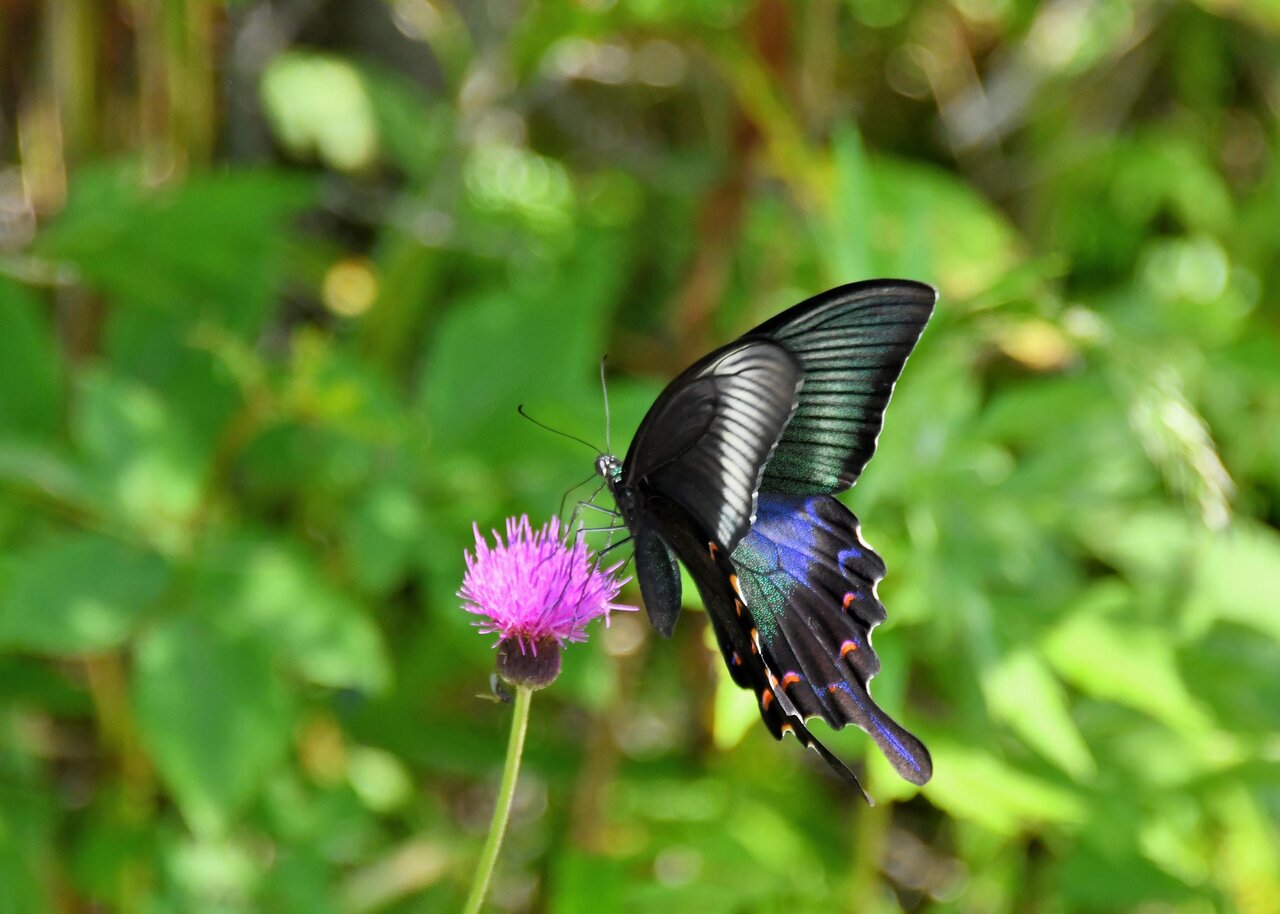 先ずはノアザミの花に吸密にやって来たカラスアゲハ♂です。