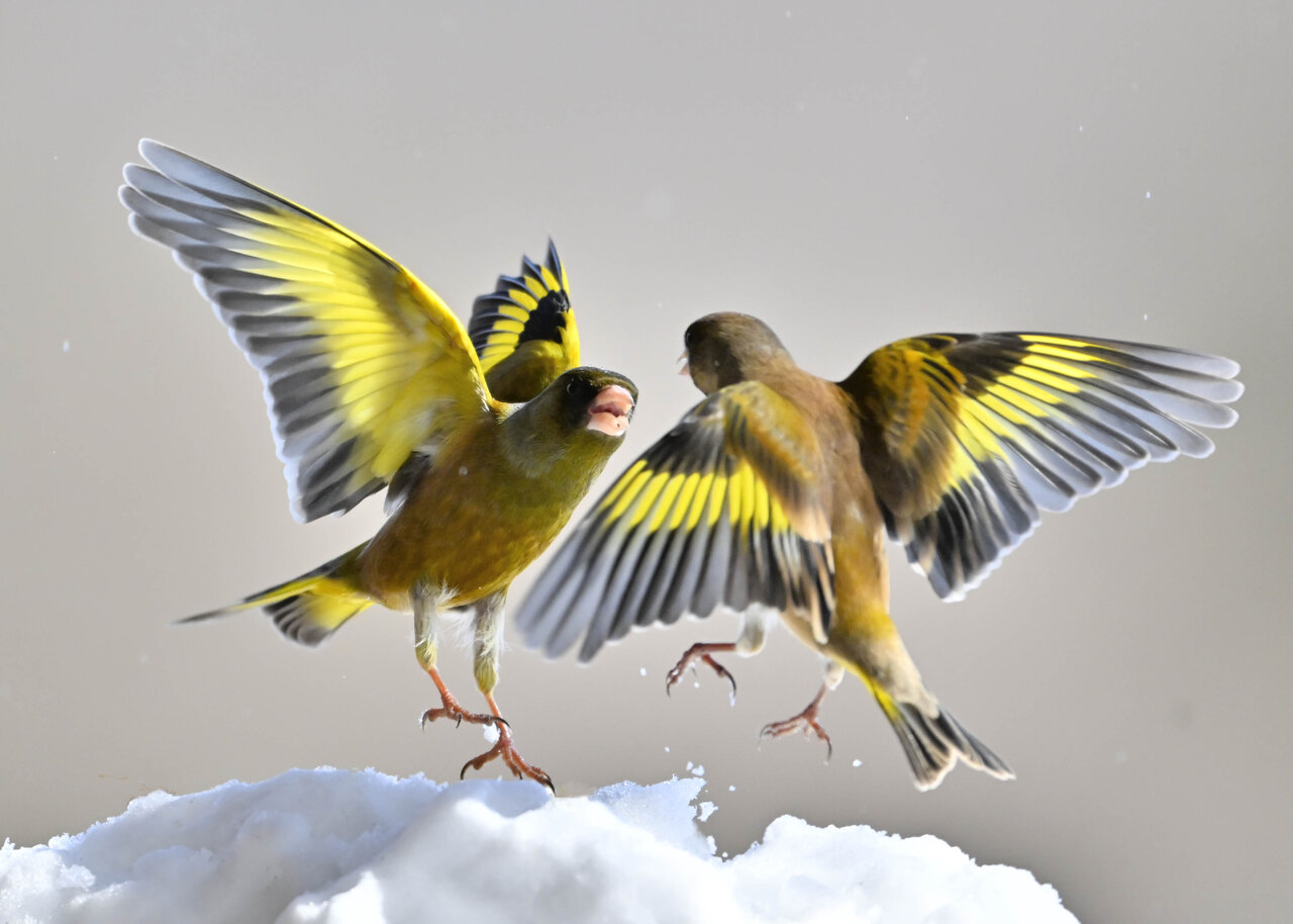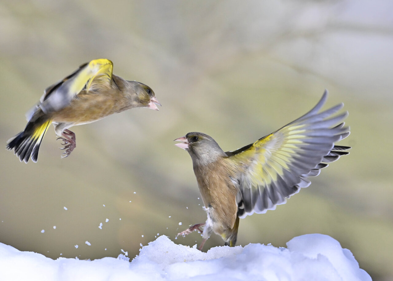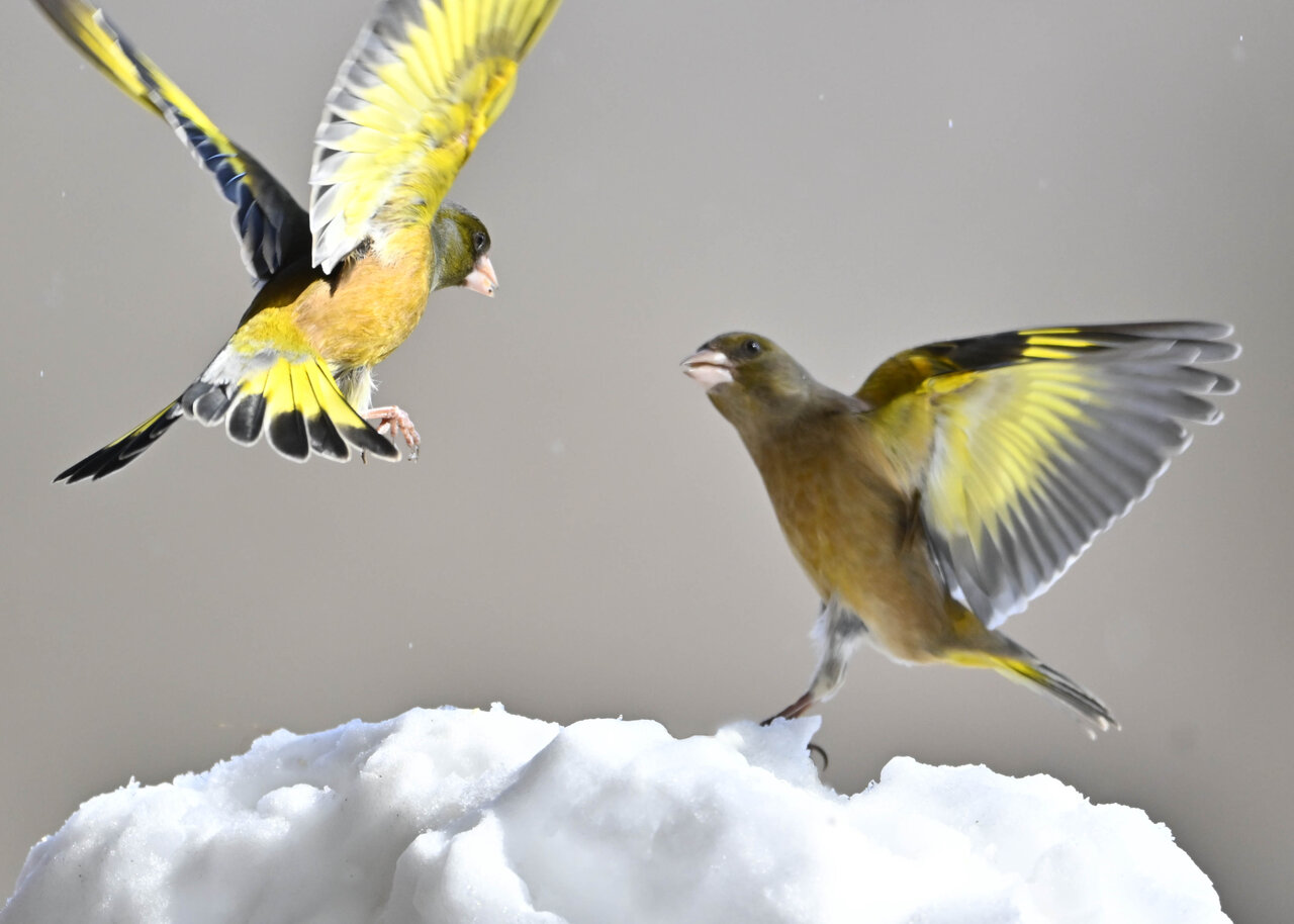 「オオカワラヒワ のバトル 」 撮影地:群馬県渋川市