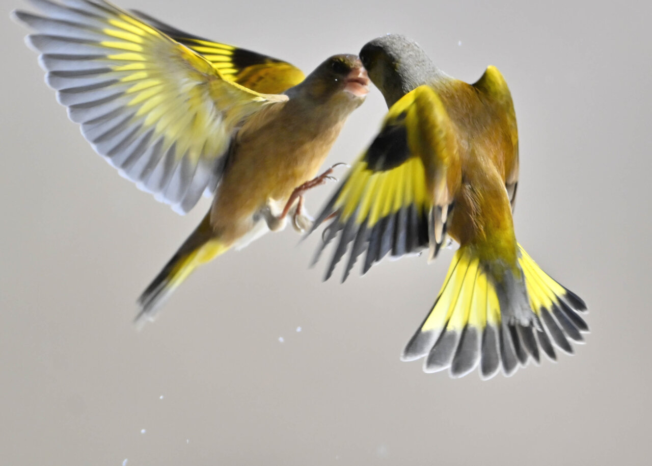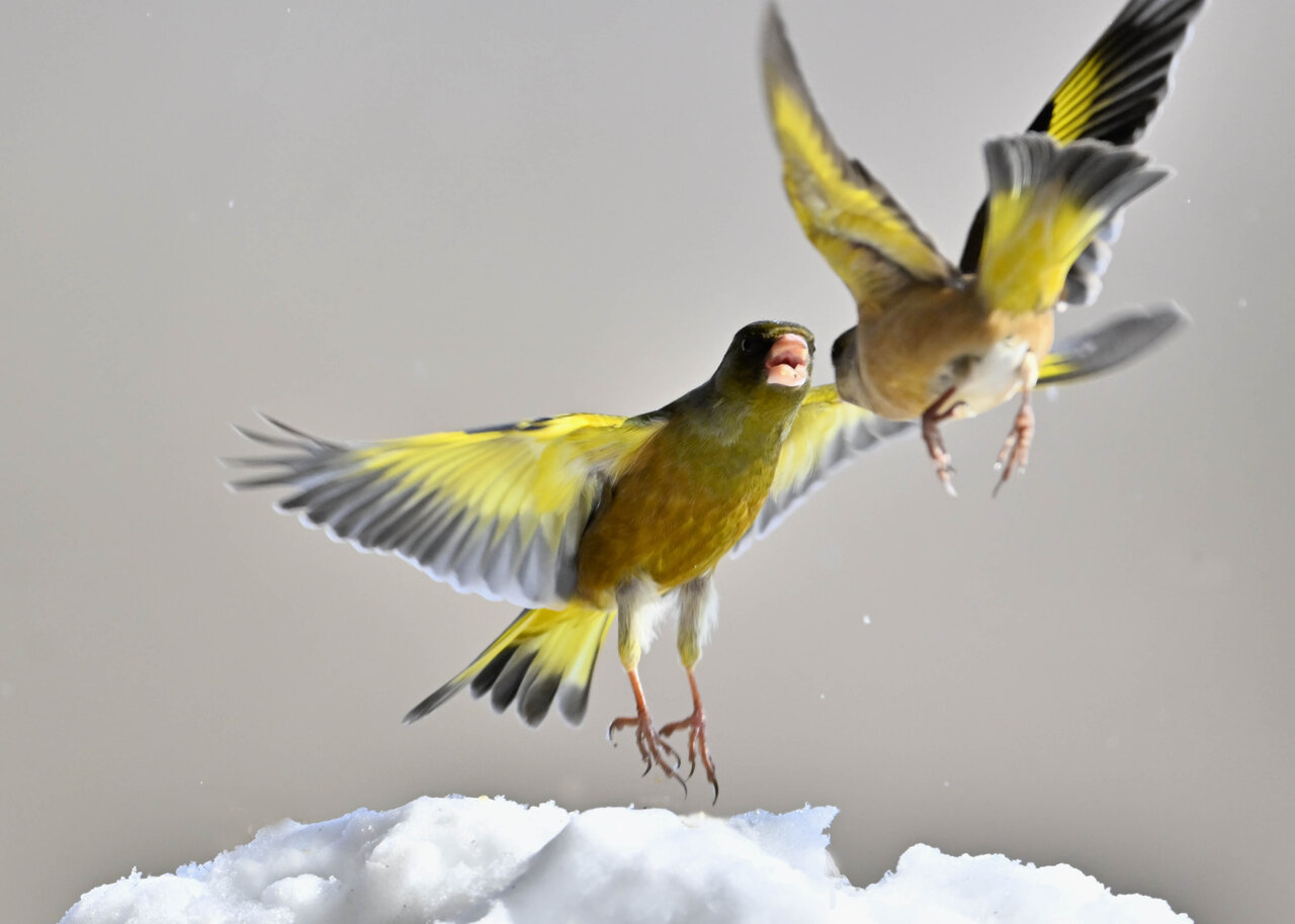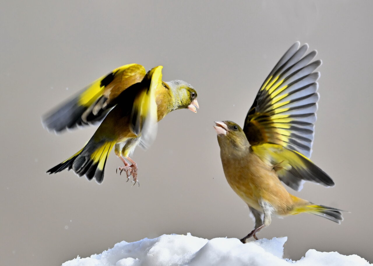 「オオカワラヒワ のバトル 」 撮影地:群馬県渋川市